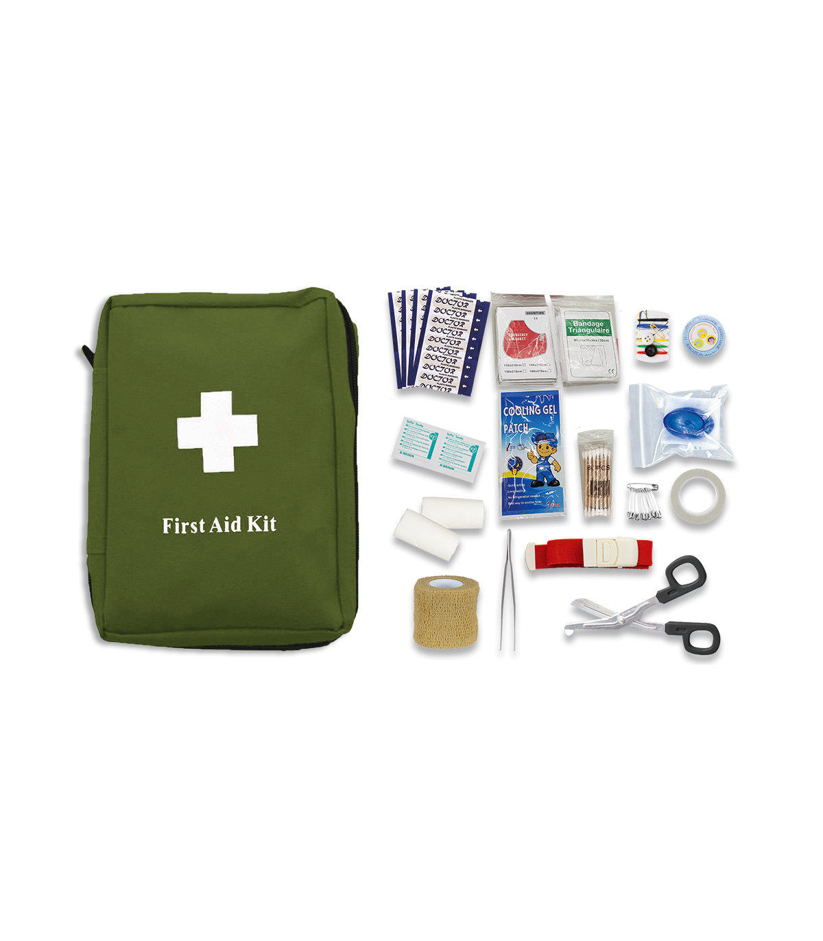 Ψαλίδι, επιδέσμους, τριγωνικό επίδεσμο, επίδεσμο συμπίεσης, επίδεσμο, μαντηλάκια απολύμανσης, μπατονέτες, συμπιεσμένο μαντηλάκι, παραμάνες ασφαλείας, ψυχρό επίθεμα, θερμική κουβέρτα, τσιμπιδάκια, κολλητική ταινία, σετ ραπτικής, ελαστικό επίδεσμο με μπλοκ και μάσκα τεχνητής αναπνοής.