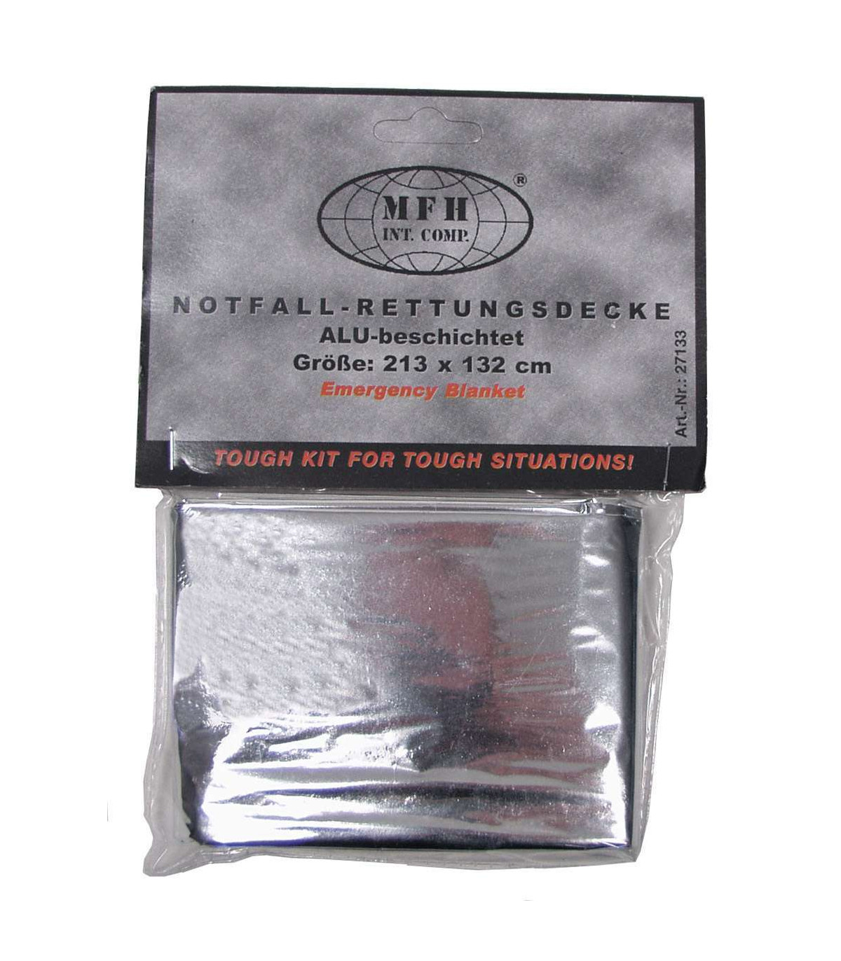 Emergency aluminium-coated blanket, for extreme case scenarios of long time dehydration and expose to cold climatic conditions. This blanket can protect you from hypothermia. Is an especially low-weight, low-bulk blanket made of heat-reflective thin plastic sheeting. Its design reduces the heat loss in a person's body, which would otherwise occur due to thermal radiation, water evaporation, or convection. Their compact size before unfurling and light weight makes them ideal when space or weight are at a premium. They may be included in first aid kits and also in camping equipment. Lost campers and hikers have an additional possible benefit: the metallic surface appearance flashes in the sun, allowing use as an improvised distress beacon for searchers and also as a method of signalling over long distances to other people on the same route as the person who owns the blanket.
