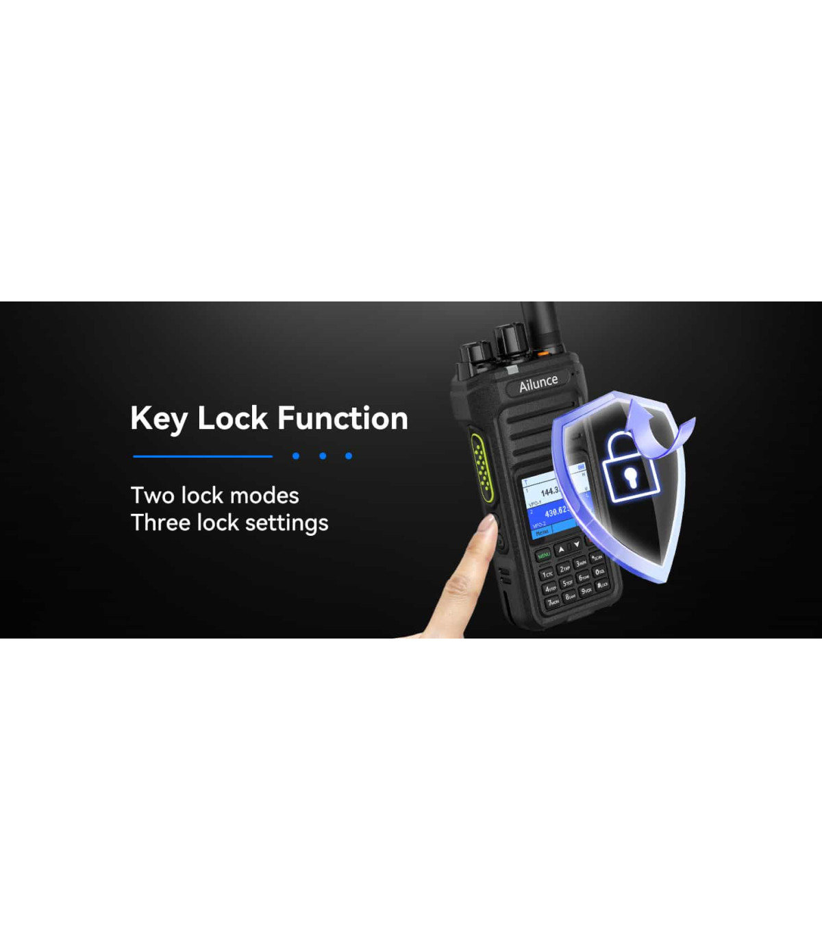 Ο πομποδέκτης Ailunce HA1UV διαθέτει λειτουργία κλειδώματος πλήκτρων με τρεις λειτουργίες: κλείδωμα πλήκτρων, κλείδωμα κουμπιού καναλιού και κλείδωμα πλευρικών πλήκτρων.