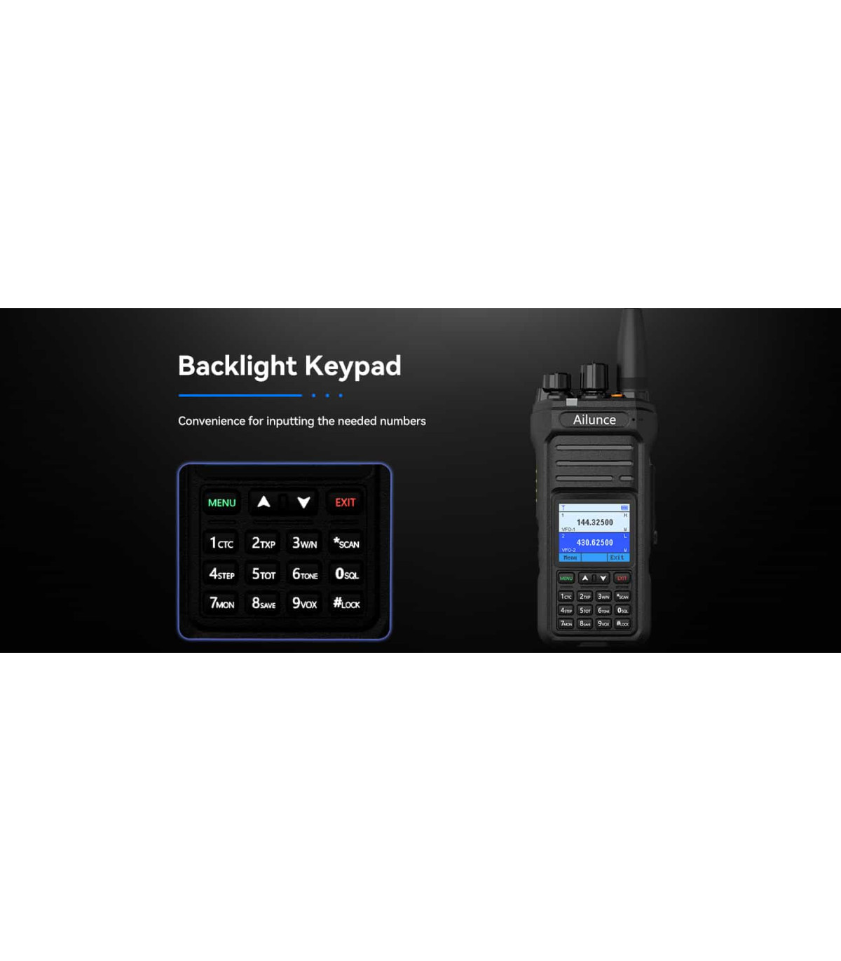 Ο πομποδέκτης Ailunce HA1UV διαθέτει πληκτρολόγιο με οπίσθιο φωτισμό, το οποίο διευκολύνει την εισαγωγή πληροφοριών ακόμη και σε συνθήκες χαμηλού φωτισμού.