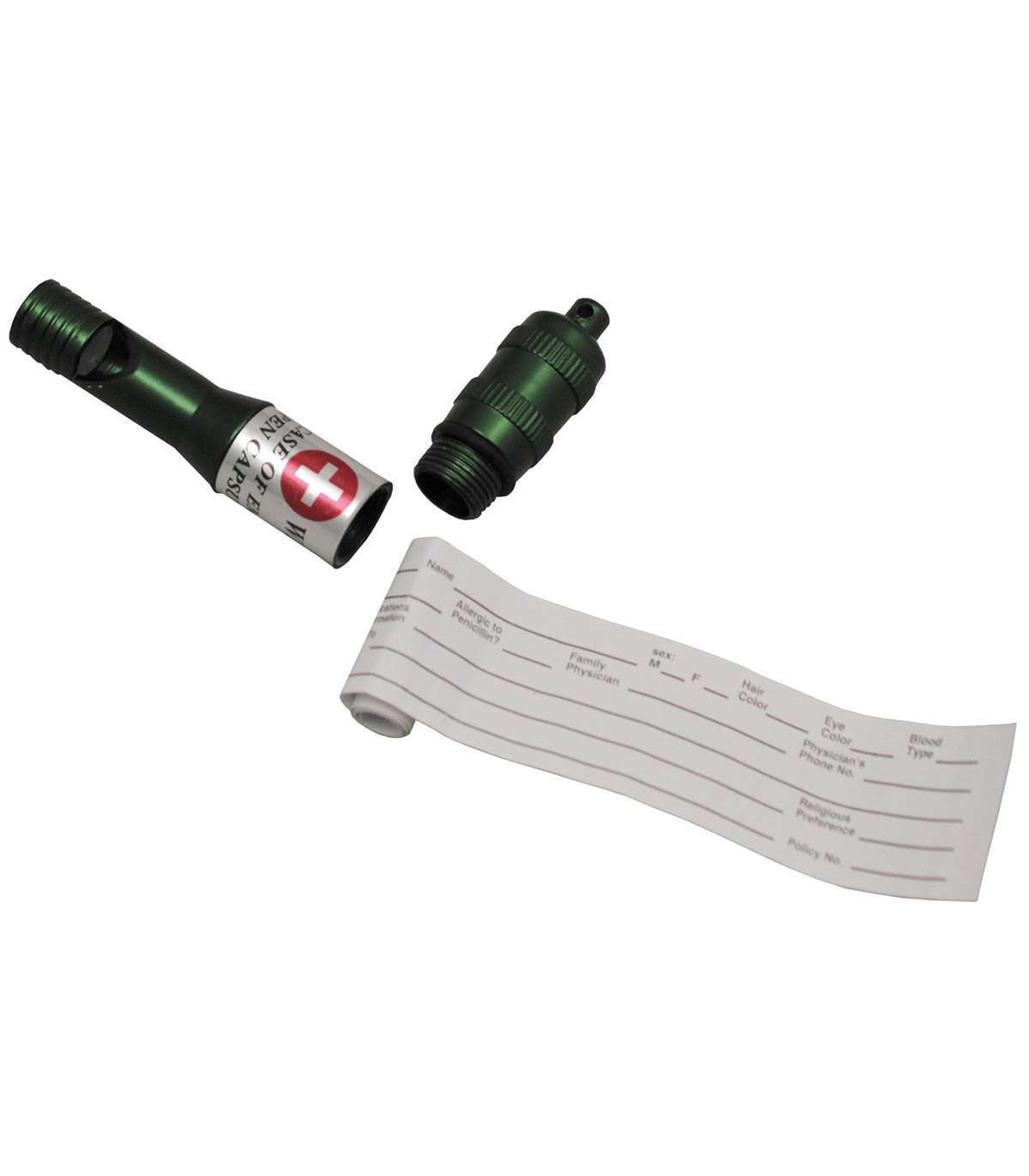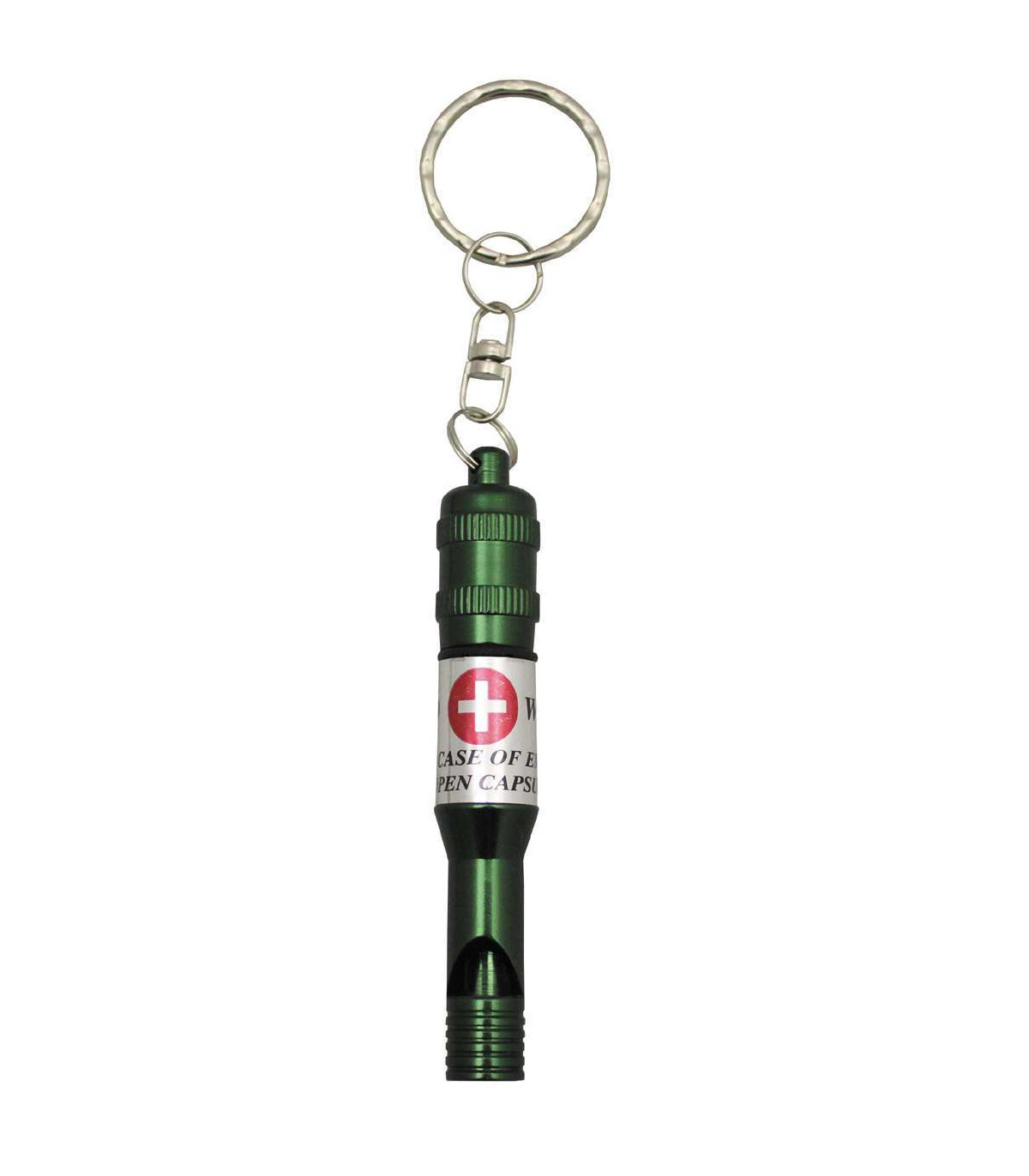 Functional whistle suitable for survival kits and everyday use, with emergency sheet inserted in capsule and made from aluminium. Lightweight and durable.