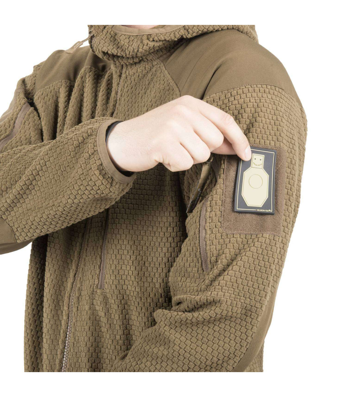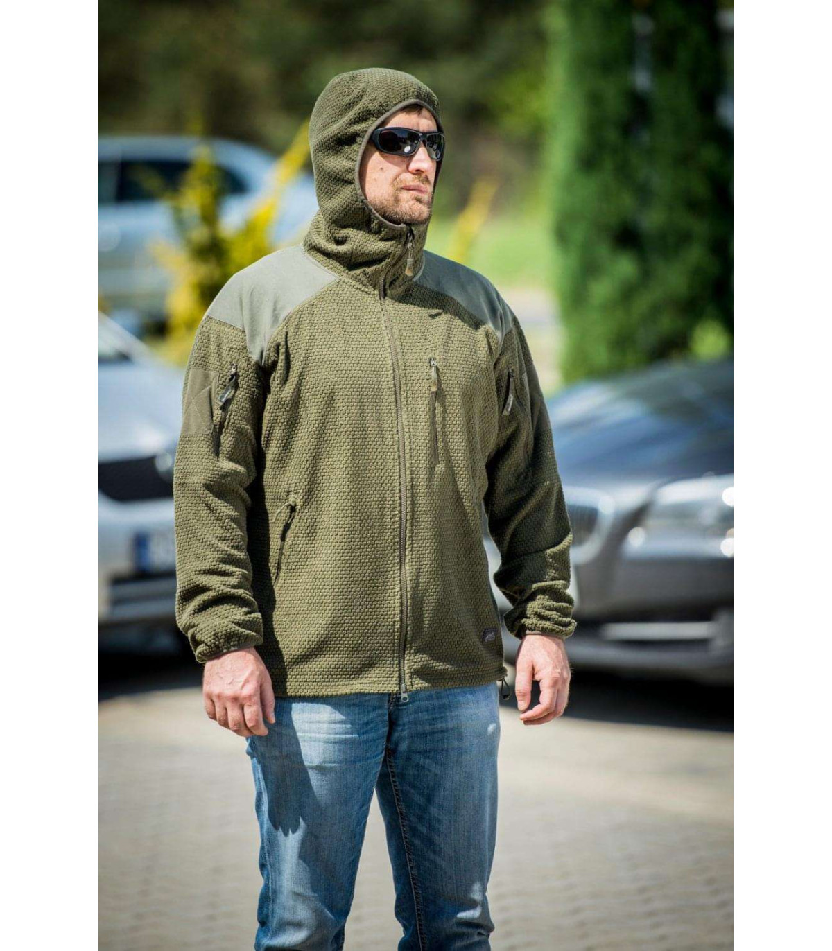Alpha Hoodie is a lightweight fleece jacket, perfect as an additional layer or as a main layer. Reinforcements on elbows and shoulders prevent fleece from being damaged during use. The jacket has five zippered outer pockets: two bicep pockets, two classic hip pockets and one chest pocket. The chest pocket has also a small hole for cables. Drawstring in the bottom part as well as elastic binding at the cuffs and hood, makes this jacket fit perfectly, therefore providing the right protection against cold.