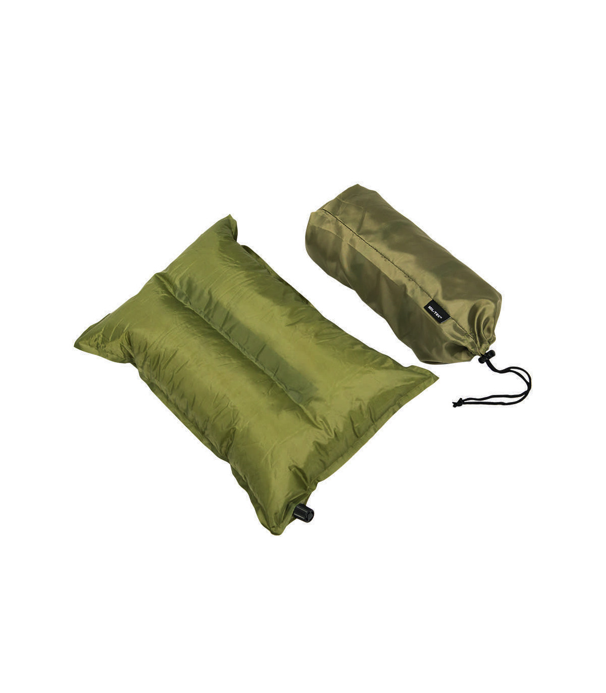 Self-inflatable after you open the valve. Short blow for more volume will help. By the low weight and the small pack size it is easy to pack and transport the pillow. Including transportation bag and 2 elastics for easy packing.