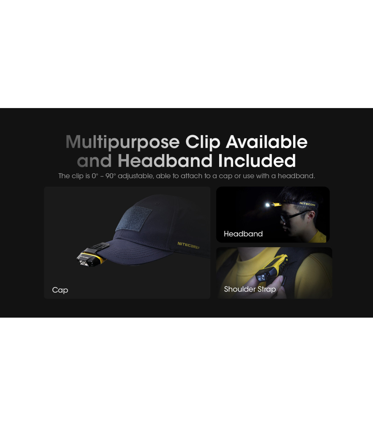 Το κλιπ είναι ρυθμιζόμενο από 0°- 90° μοίρες, έτσι ώστε να στηρίζεται στο γείσο ενός καπέλου ή να χρησιμοποιείται με τον ιμάντα κεφαλής