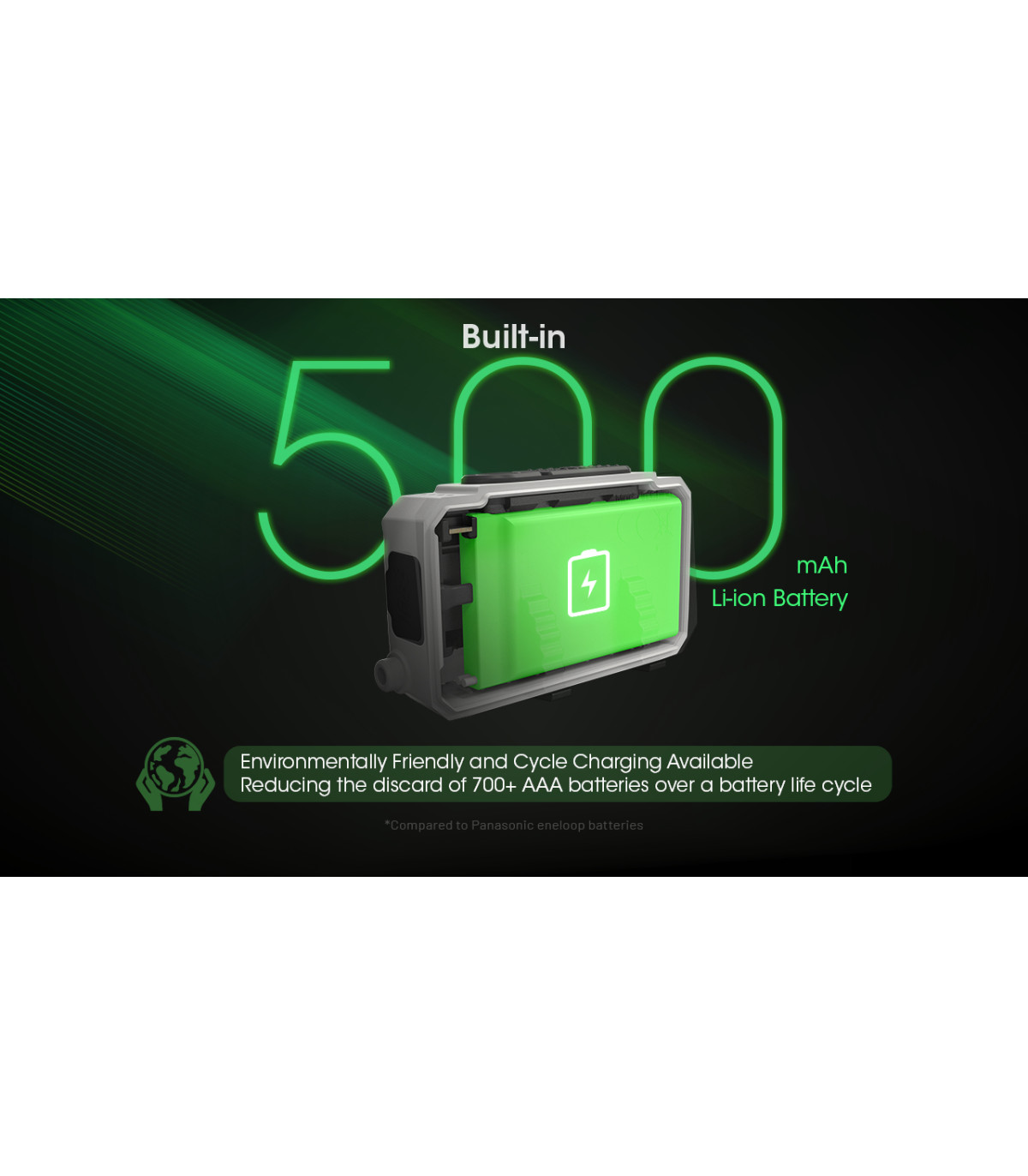 Διαθέτει ενσωματωμένη επαναφορτιζόμενη μπαταρία ιόντων λιθίου (Li-ion) 500mAh