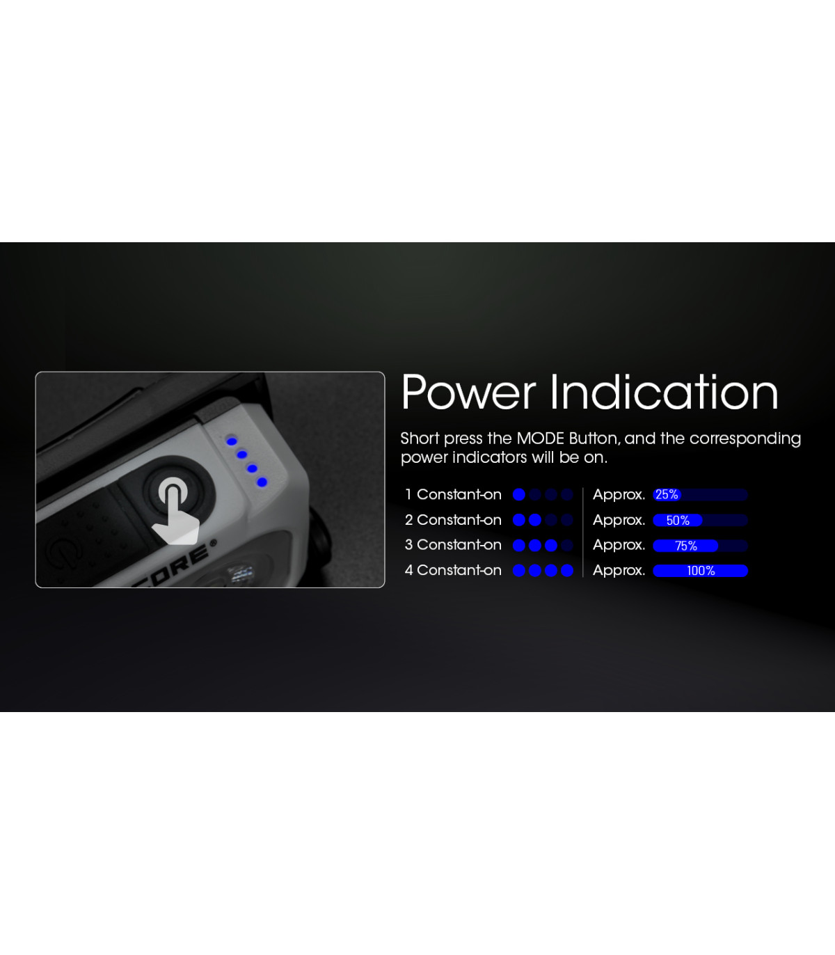 – Σχεδιασμένο με 4 ενδεικτικές λυχνίες ισχύος για να υποδεικνύει την υπολειπόμενη ισχύ της μπαταρίας