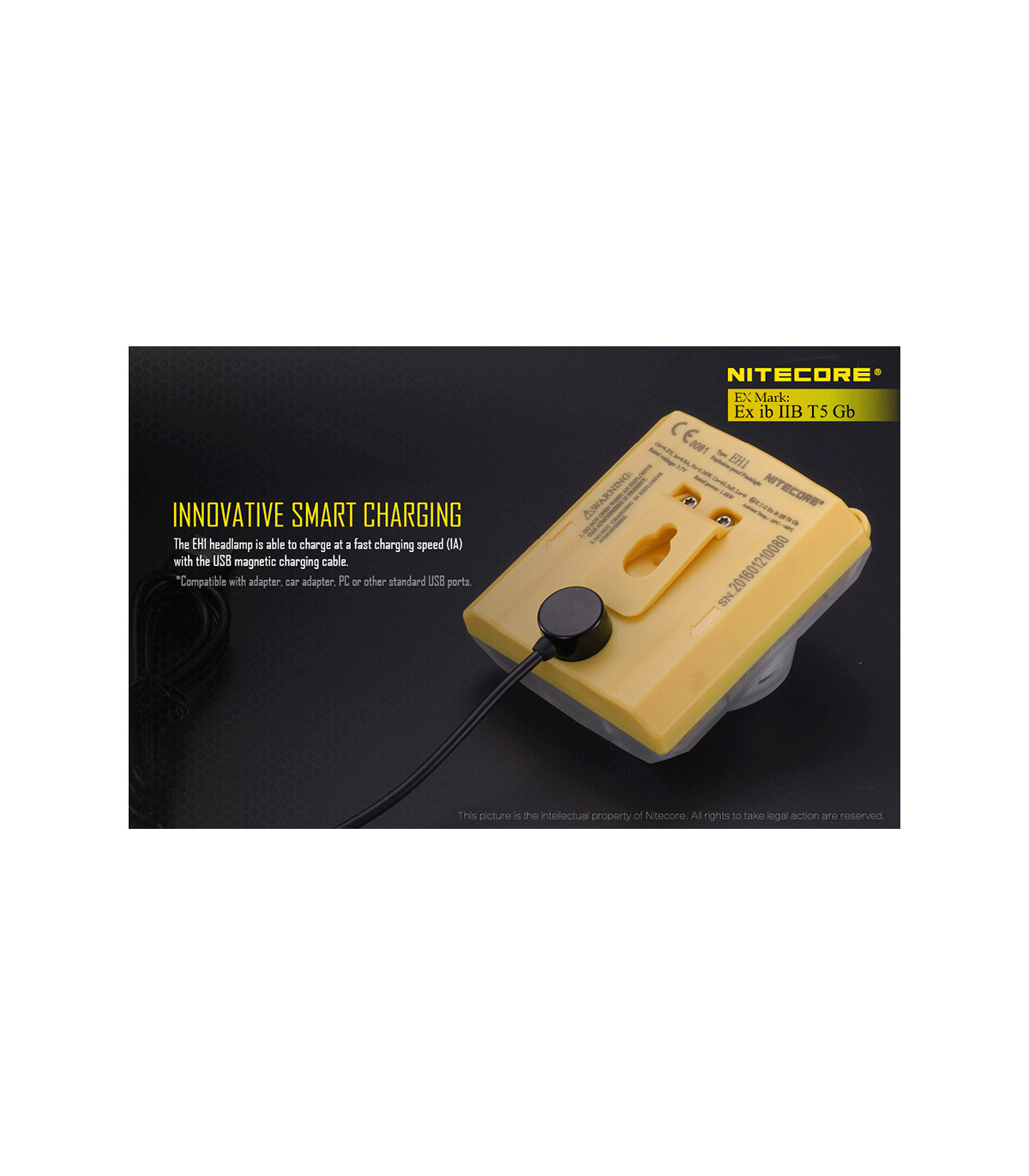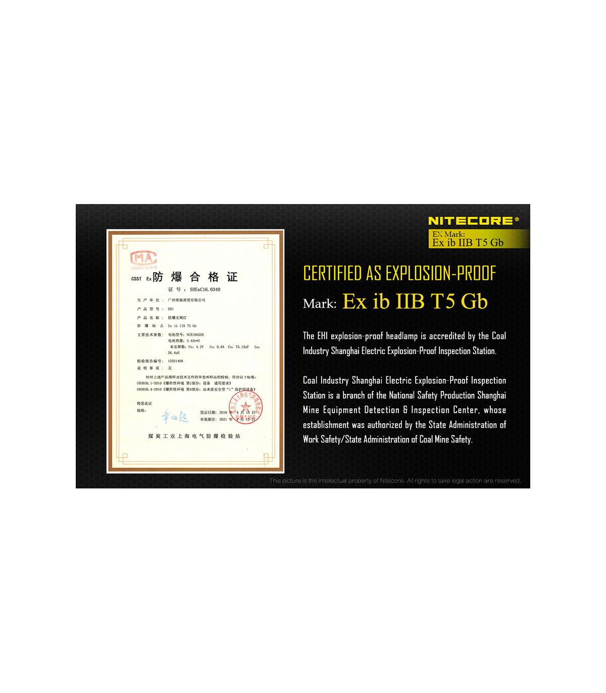 Ο NITECORE EH1 έχει πιστοποιηθεί από τον σταθμό επιθεώρησης αντί-εκρηκτικότητας της βιομηχανίας άνθρακα της Σαγκάη.  Αυτός ο σταθμός επιθεώρησης είναι υποκατάστημα του Εθνικού κέντρου στην Σαγκάη για την  εξέταση και τον έλεγχο της παραγωγής  εξοπλισμού για την ασφάλεια στα ορυχεία. Η άδεια λειτουργίας τους έχει δοθεί από την Κρατική διοίκηση για την ασφάλεια της εργασίας  και την Κρατική διοίκηση της ασφάλειας των ορυχείων άνθρακα.