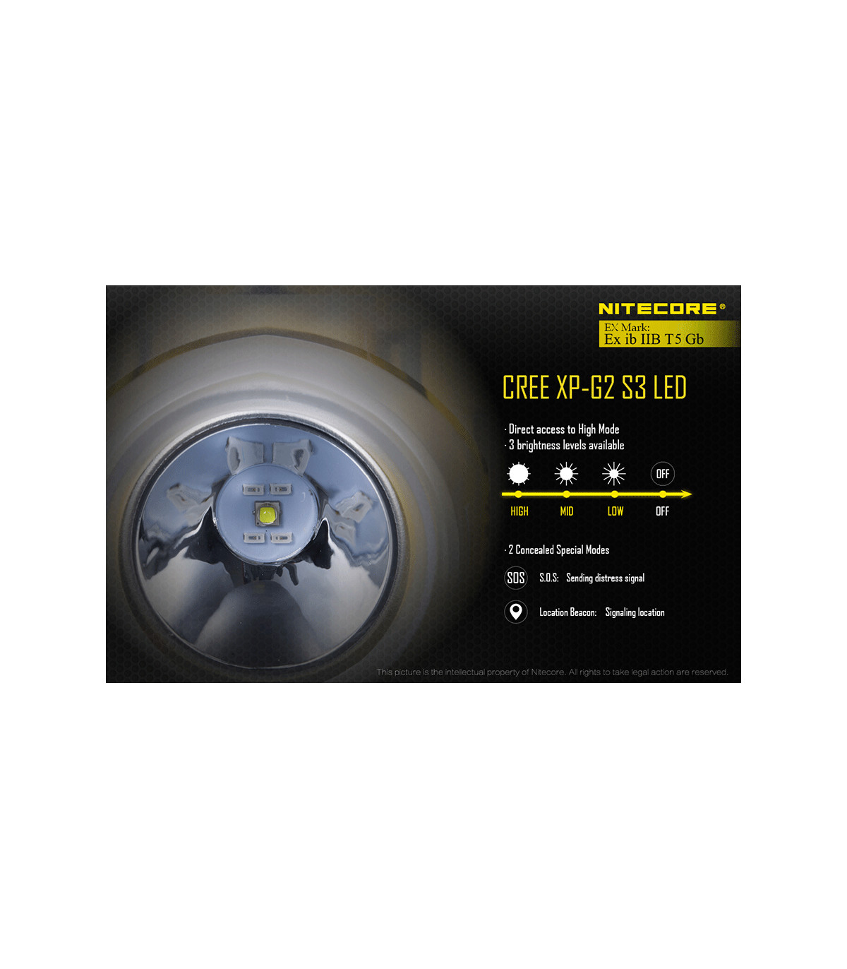 Ενσωματώνει ένα εξαιρετικό LED CREE XP-G2 S3 με τρία επίπεδα φωτεινότητας και άμεση πρόσβαση στην μέγιστη ένταση. Δύο κρυφές ειδικές φωτεινότητες SOS και BEACON.