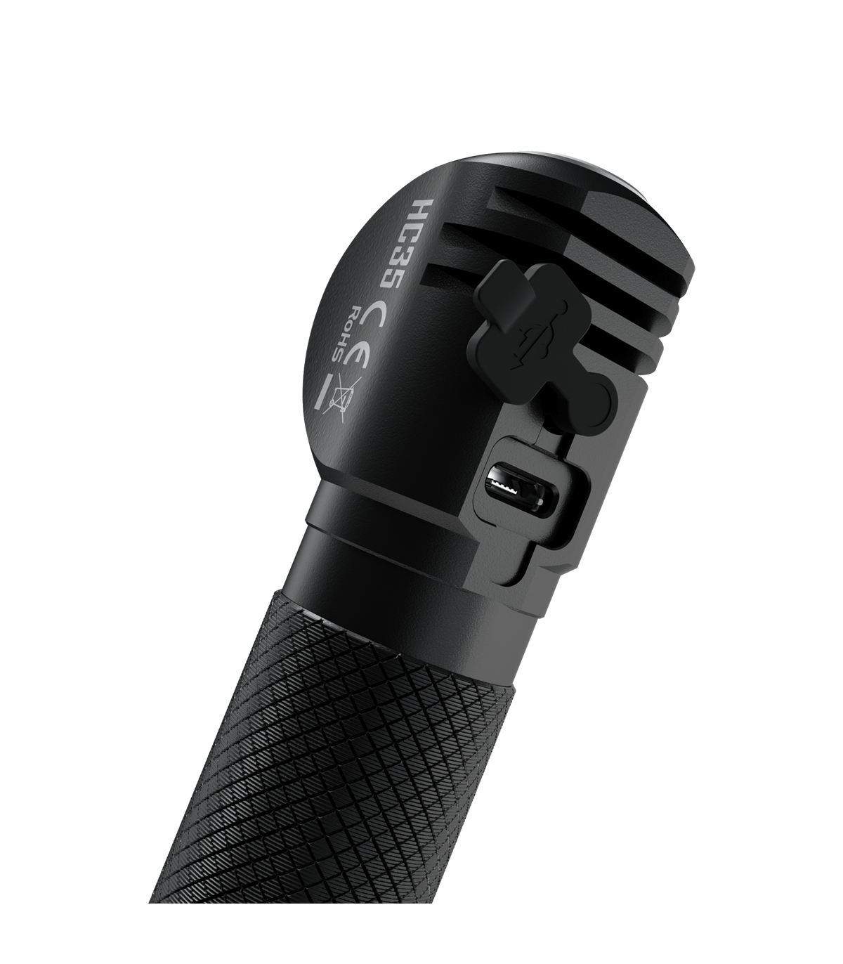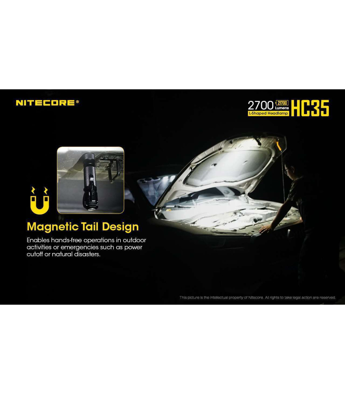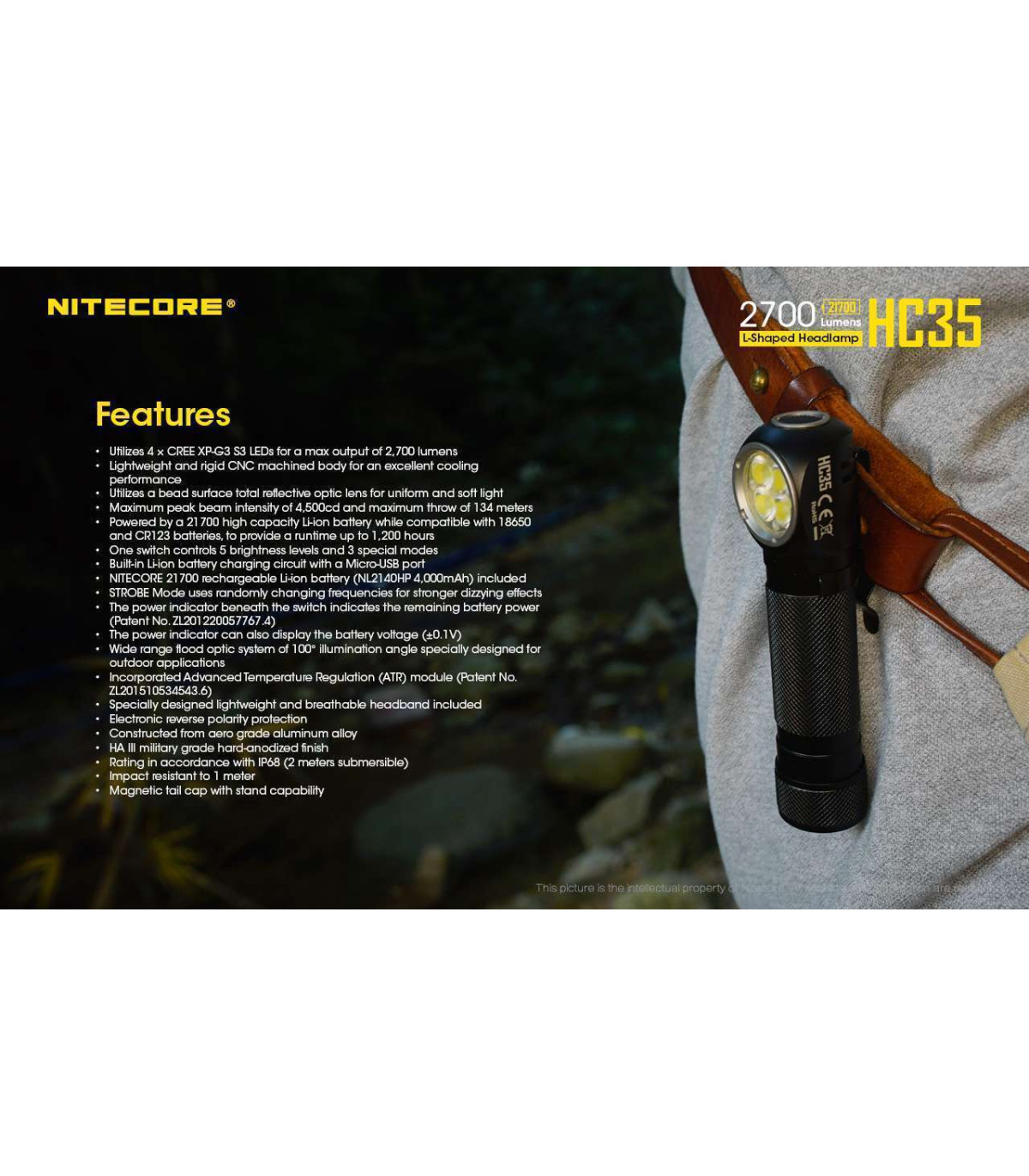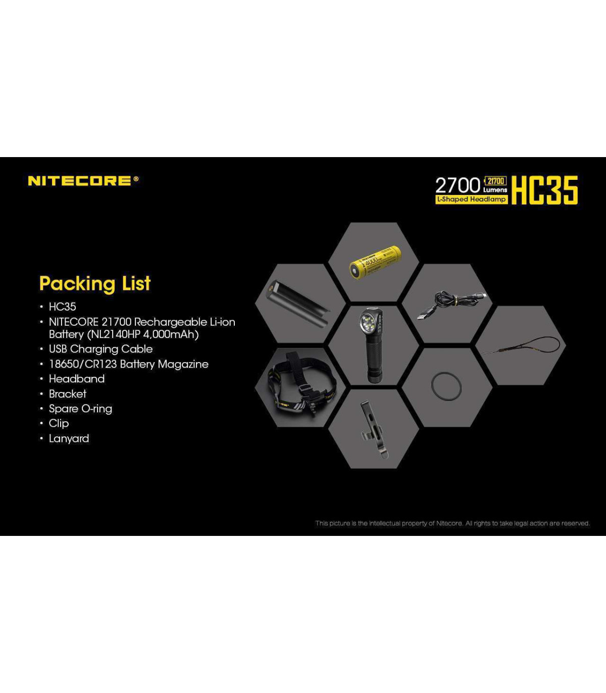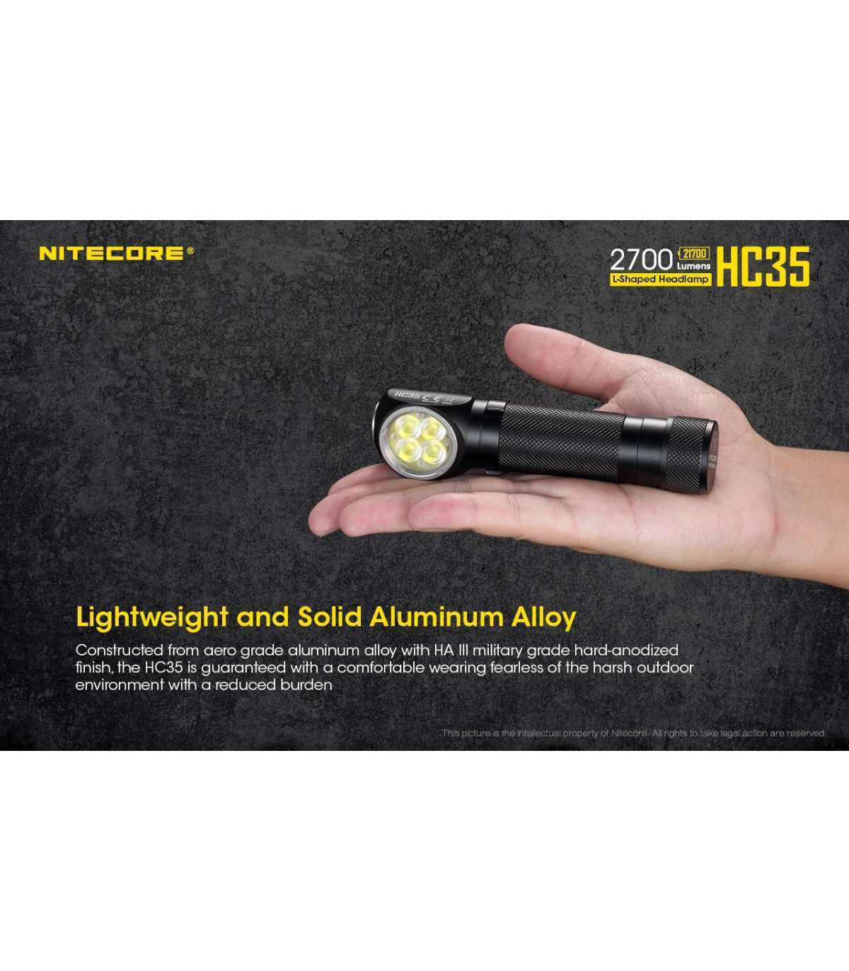 The NITECORE HC35 L-shaped headlamp is the first next generation headlamp to feature a high performance 21700 battery. This powerful battery unleashes the quad LEDs max brightness of 2700 lumens turbo with over 146 yards of beam throw. The quick detach headlamp bracket allows you to easily rotate the flashlight on the headband to illuminate where you need it.