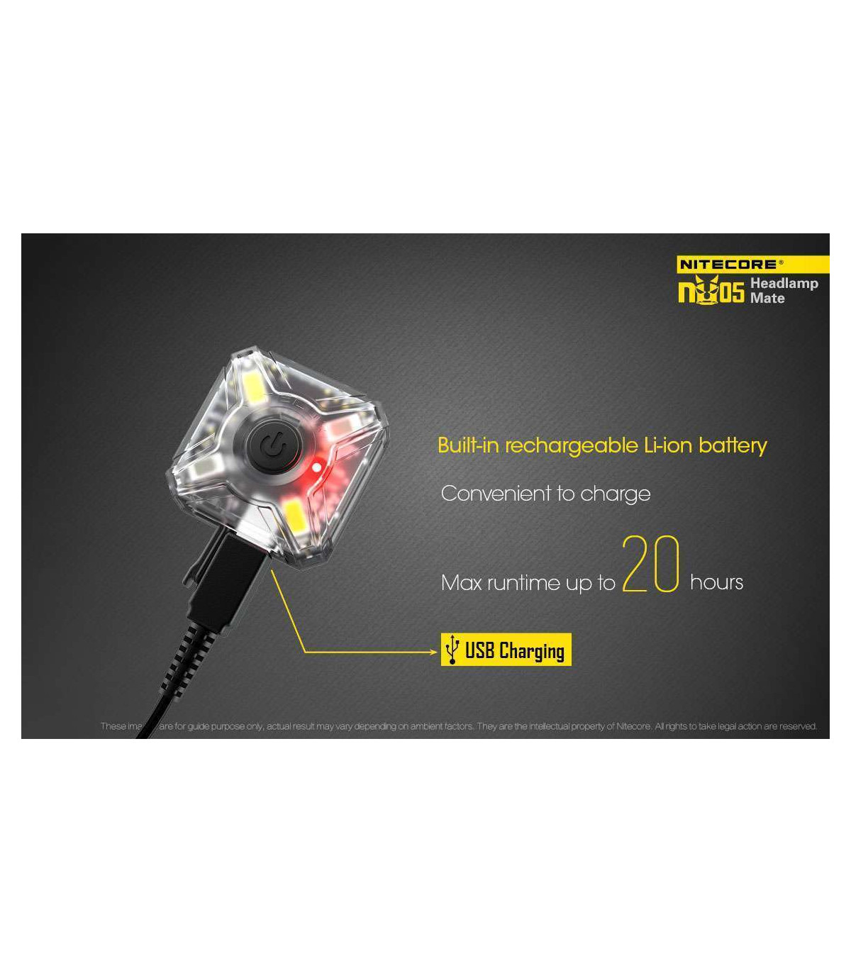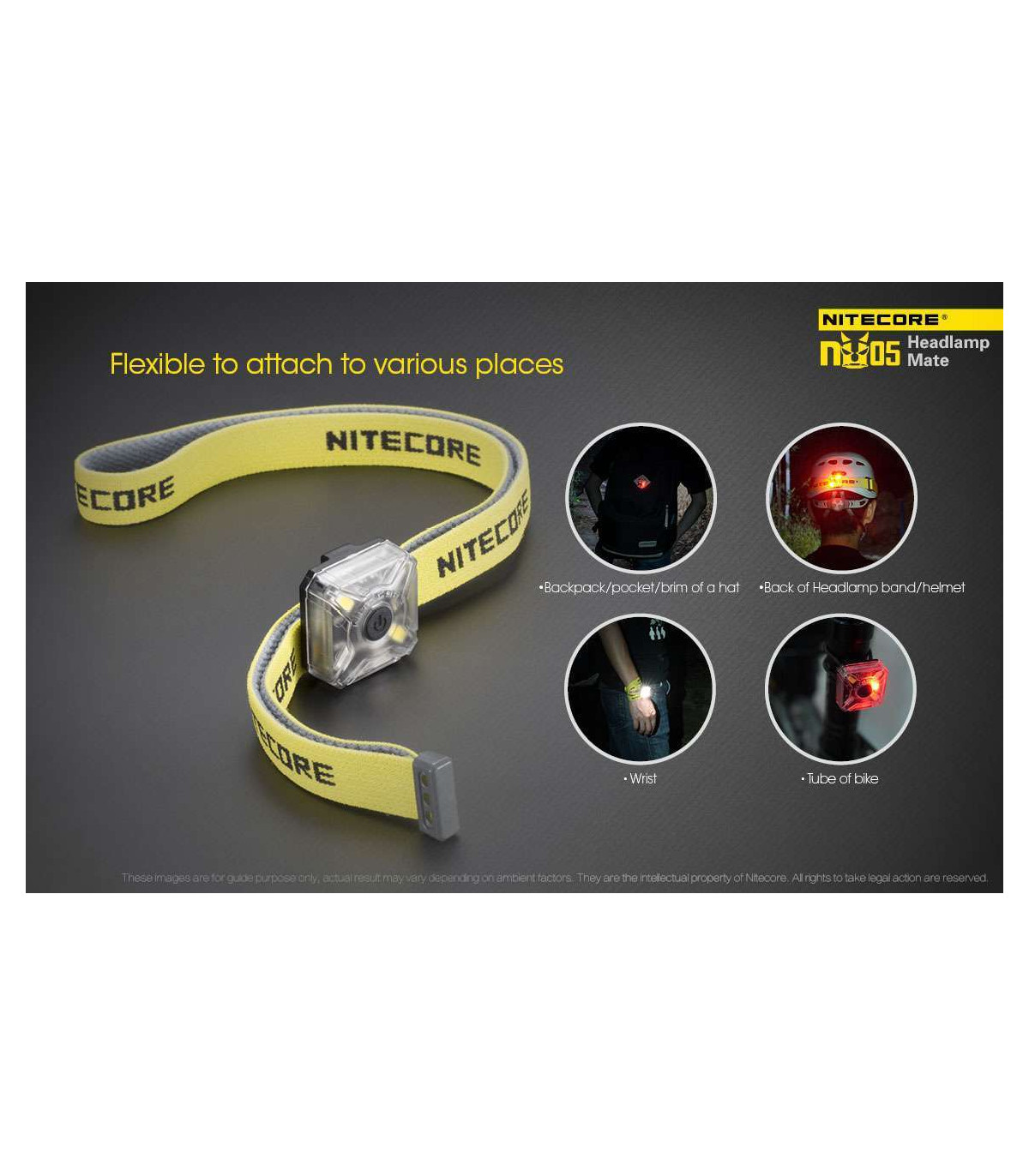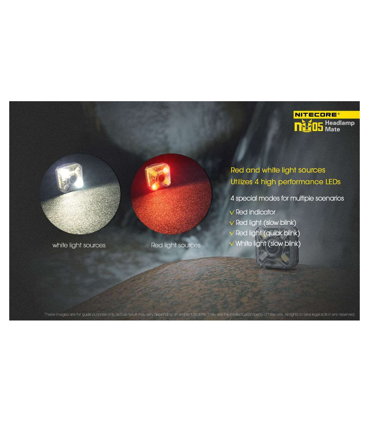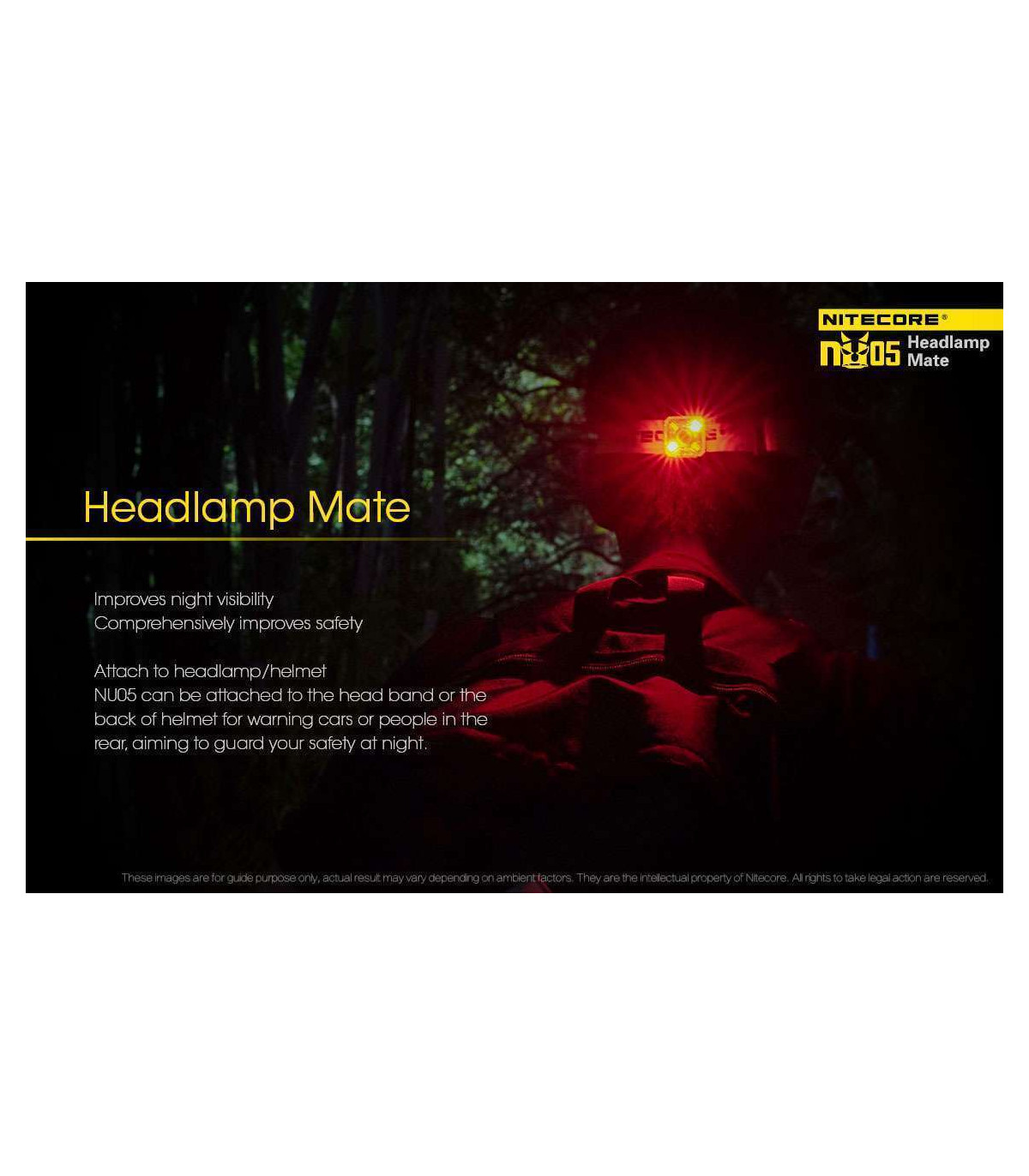 Stay safe at night with the Nitecore NU05 headlamp mate! This safety and emergency light features 2x red and 2x white LEDs making it a perfect match for bicycling, walking, running, pets, children, backpacking and more. Using the single button interface, users can select from five different outputs including: