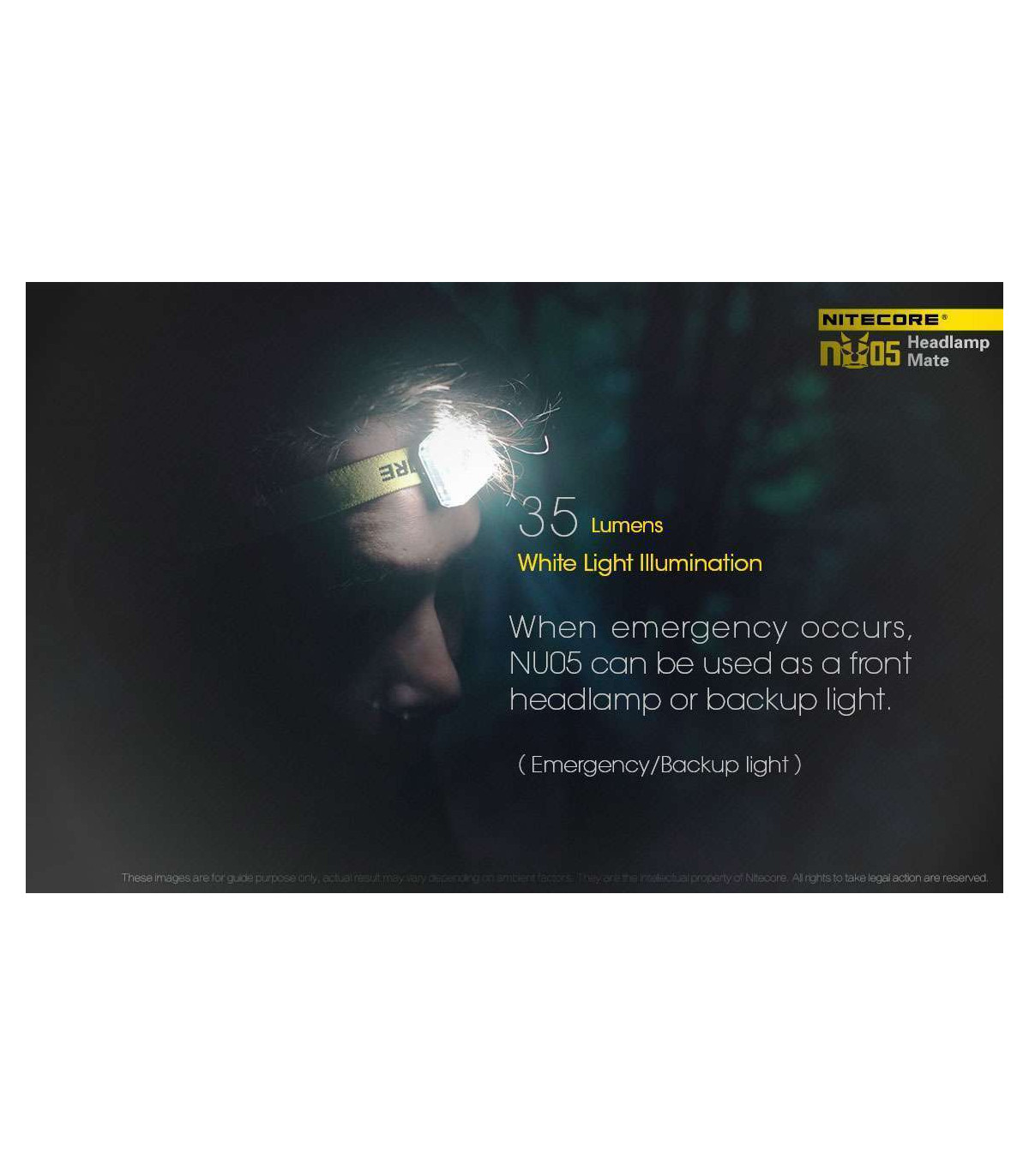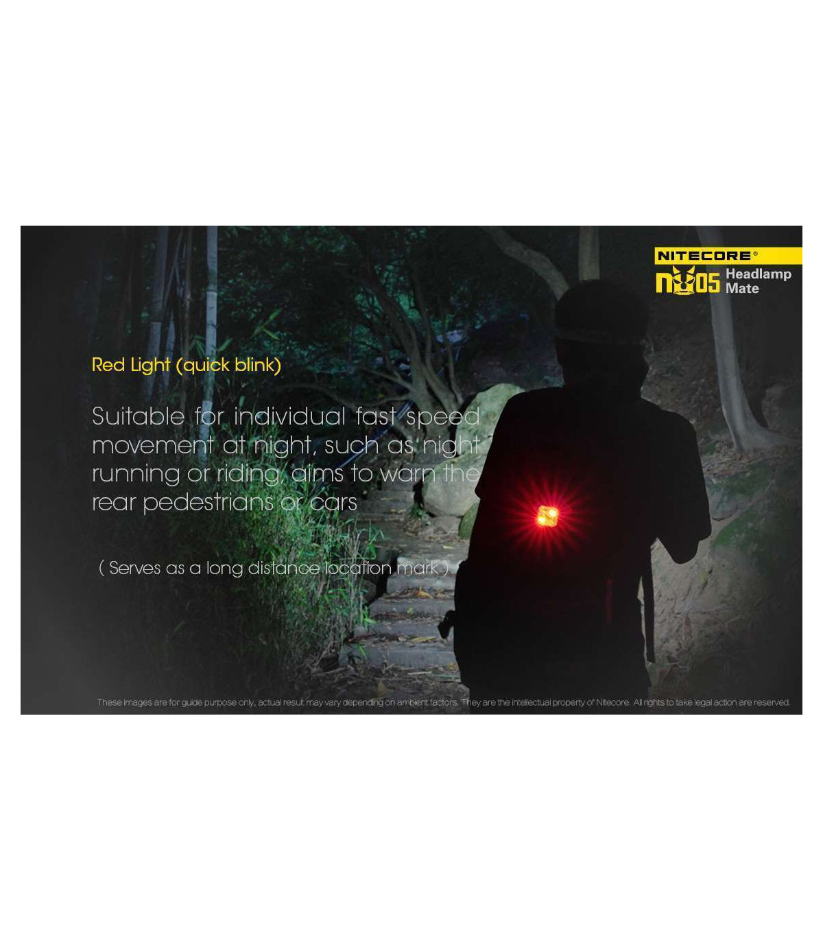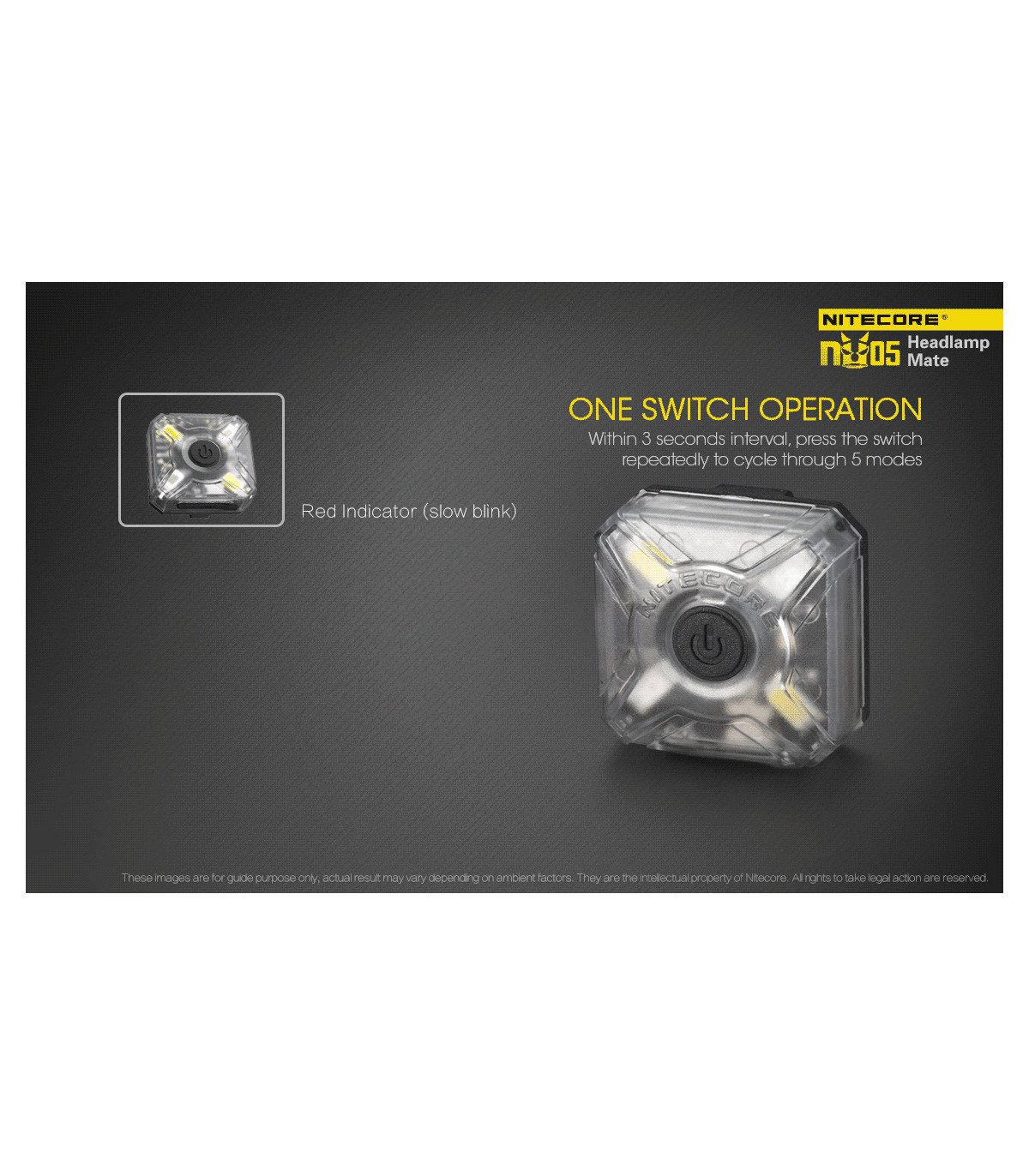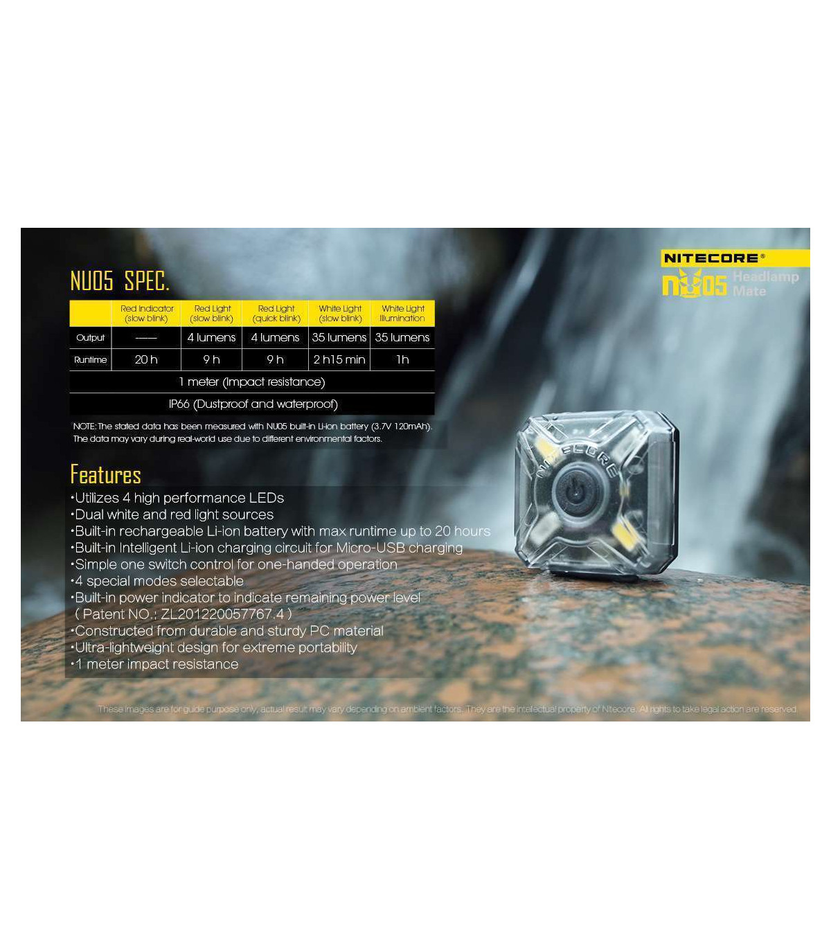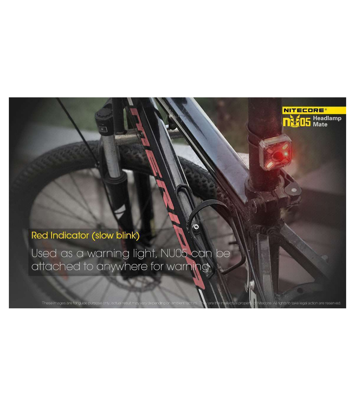 Stay safe at night with the Nitecore NU05 headlamp mate! This safety and emergency light features 2x red and 2x white LEDs making it a perfect match for bicycling, walking, running, pets, children, backpacking and more. Using the single button interface, users can select from five different outputs including: