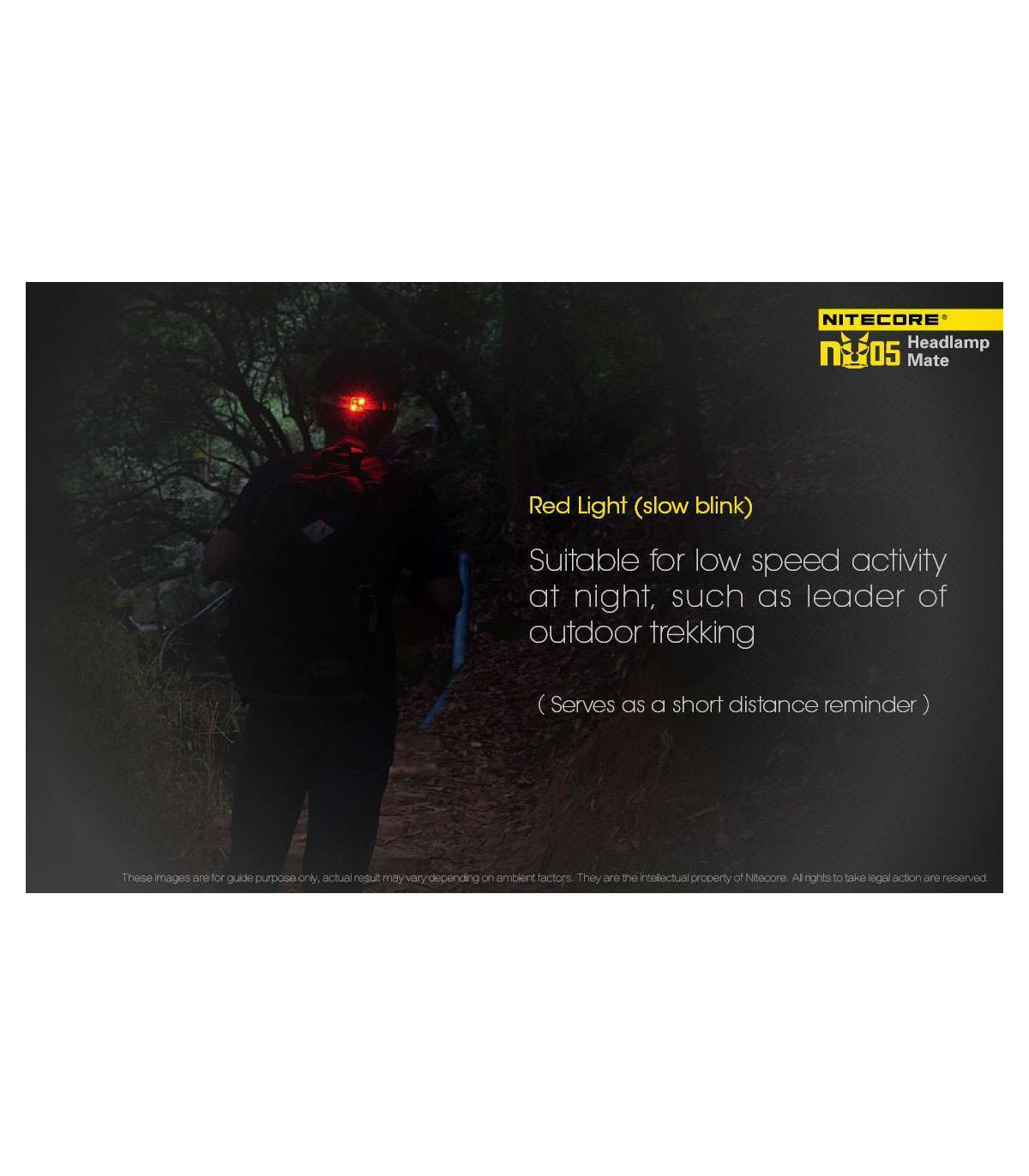 - Red - slow blinking (4 lumens) - Ideal for hiking, trail leading