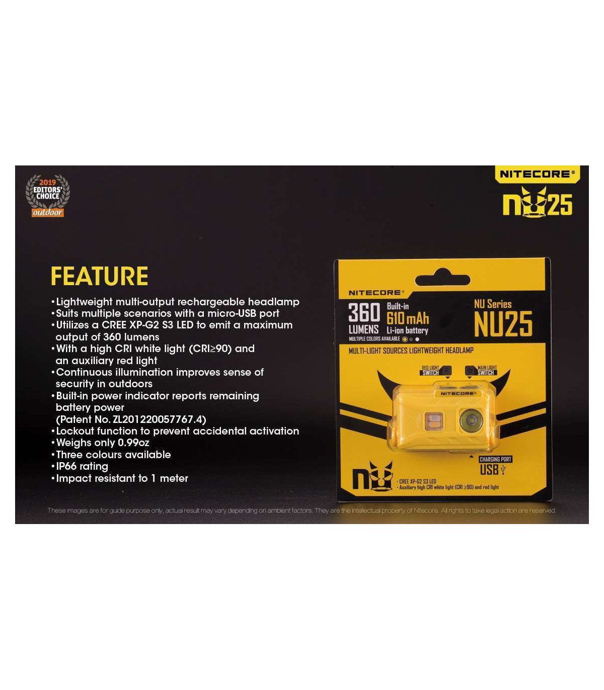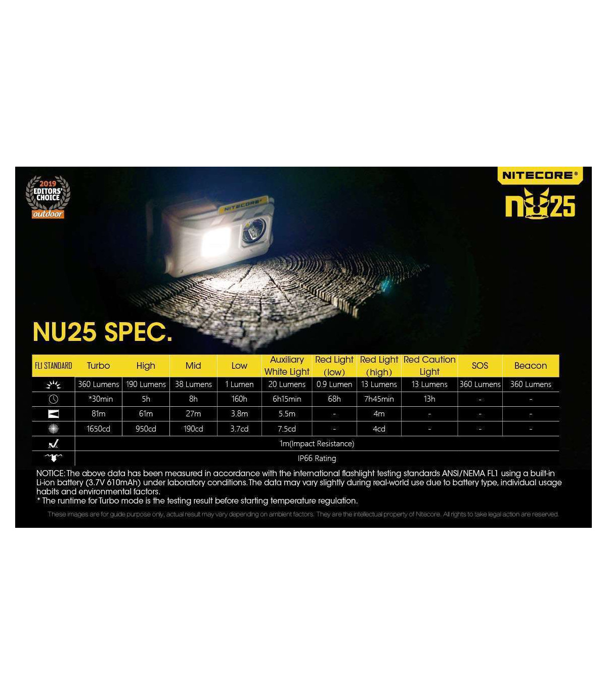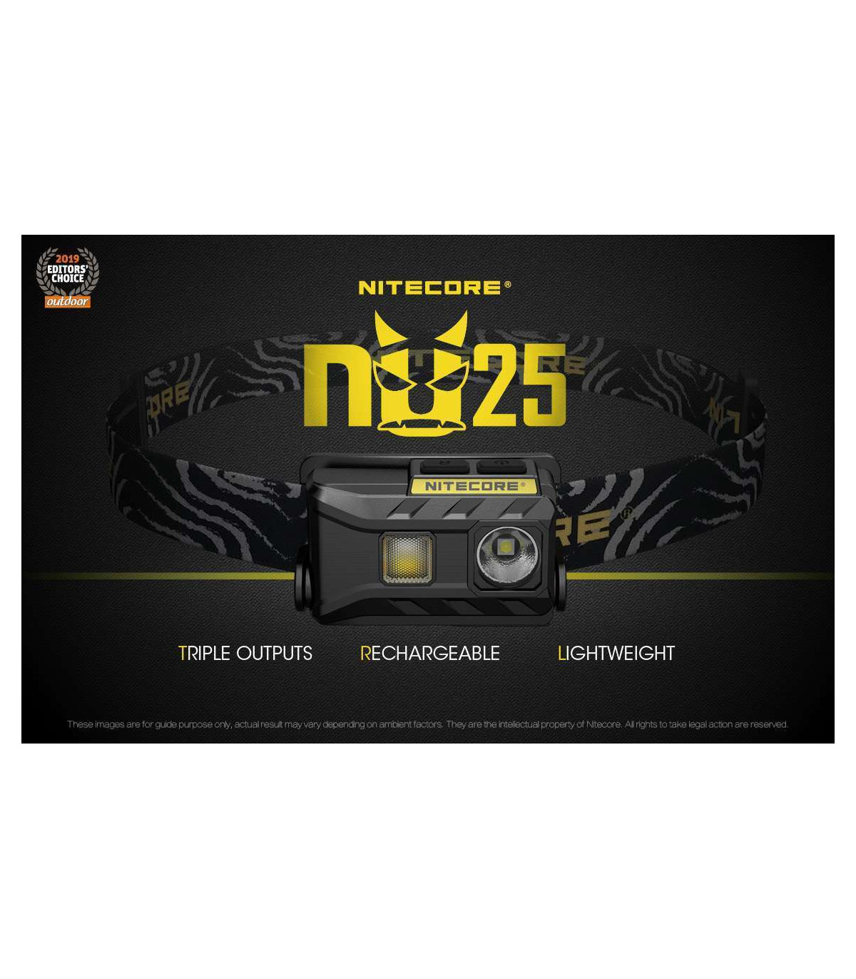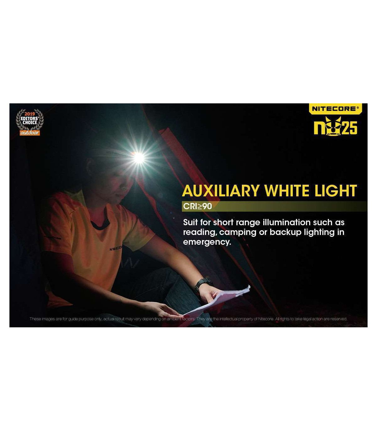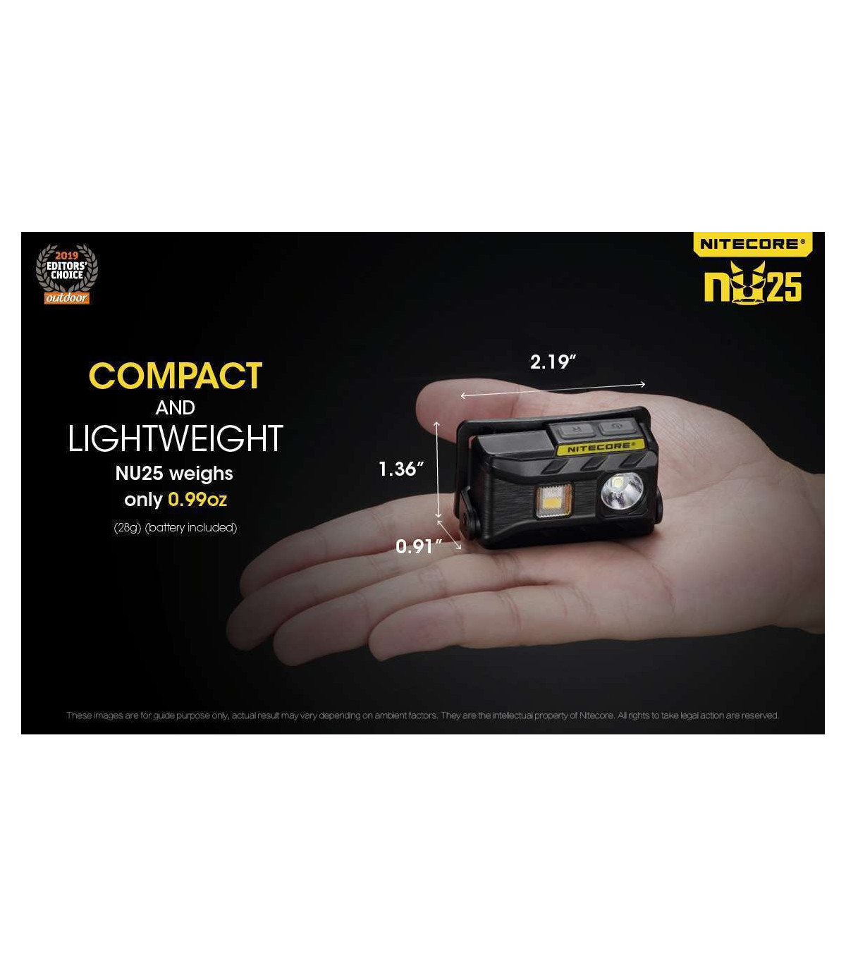 Get ready for one of the most versatile and compact headlamps Nitecore offers. The Nitecore NU25 headlamp packages three outputs (white/high CRI and red) into an ultra lightweight body you can wear comfortably for hours on end. A primary CREE XP-G2 S3 LED emits up to 360 lumens of light with up to 88 yards throw which can be used for running, cycling, setting up camp and so much more. For up close tasks, reading and photography, there is a secondary high CRI LED which produces a warm 20-lumen beam and renders colors and details better than cool white outputs. Last but not least, the NU25 also features a secondary red LED for preserving night vision, map reading and hunting. There are even three special modes (red caution/SOS/Beacon) for emergencies and signaling! Dual switch controls located conveniently on the top of the headlamp control white and red outputs separately and make it easy to switch between all three outputs so you always know what light you're accessing. The NU25 also features a lockout mode to prevent accidental button presses while stored in tight spaces. The NU25 comes with a built-in 610mAh li-ion battery that offers 30 minutes of runtime on Turbo and up to 160 hours on the lowest setting. Keeping the NU25 is super simple with a built-in micro-USB charging port located on the underside of the unit. Use the included charging cable to plug the light into any USB source and a red indicator light under the control buttons will illuminate. Upon completion, the light will turn green. There's even a battery power indicator so you'll never be caught with low battery again.