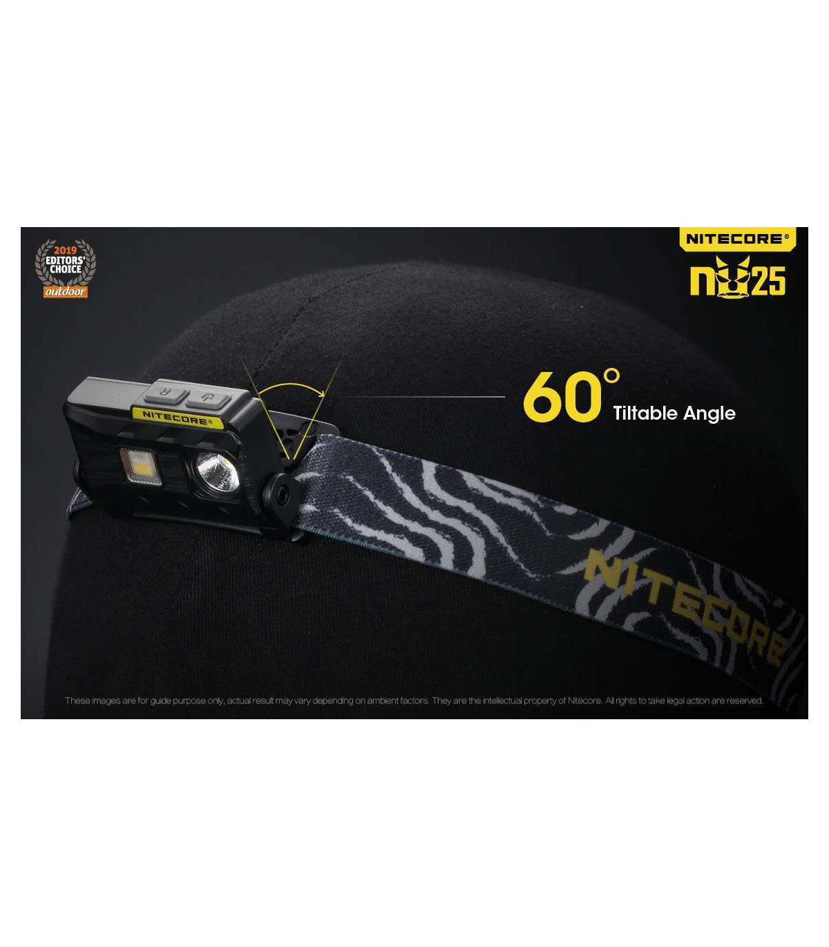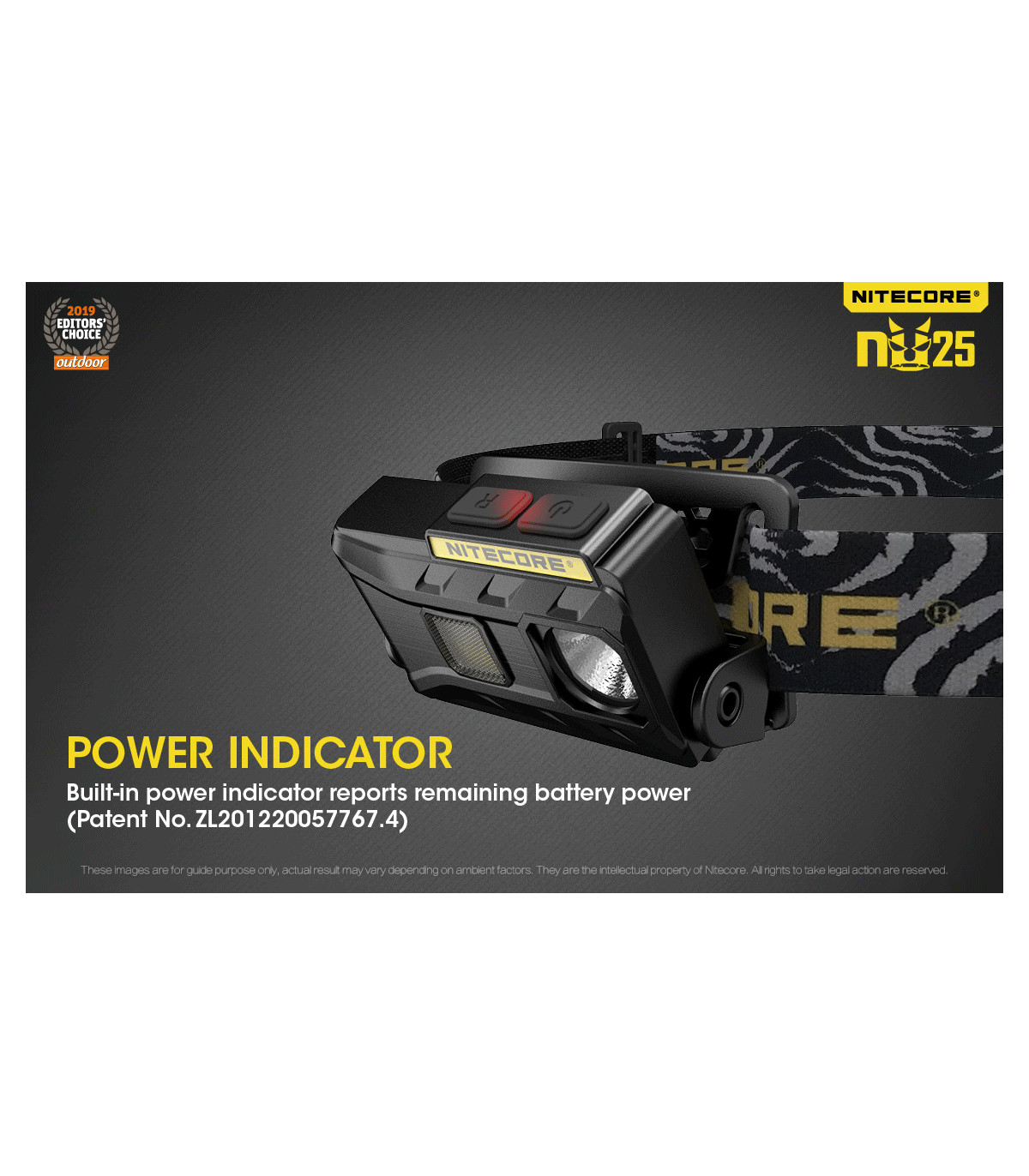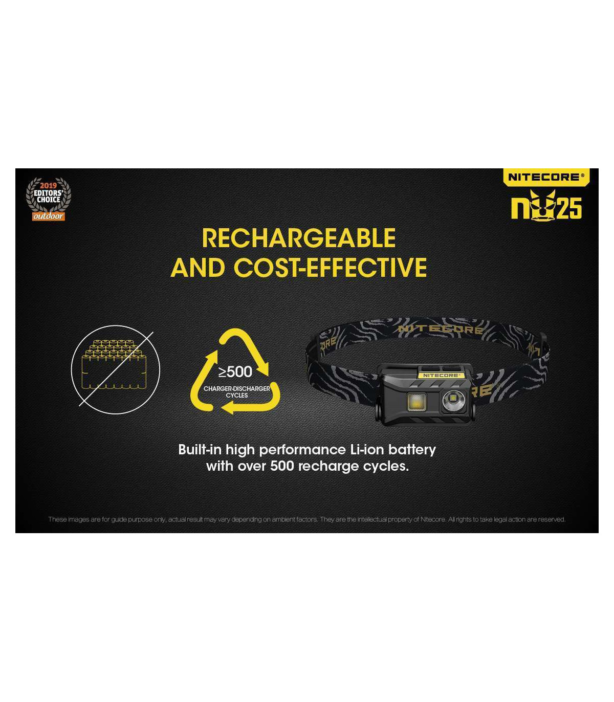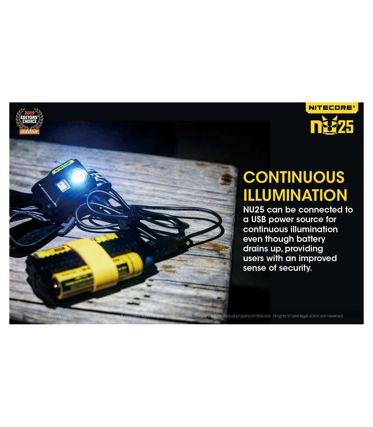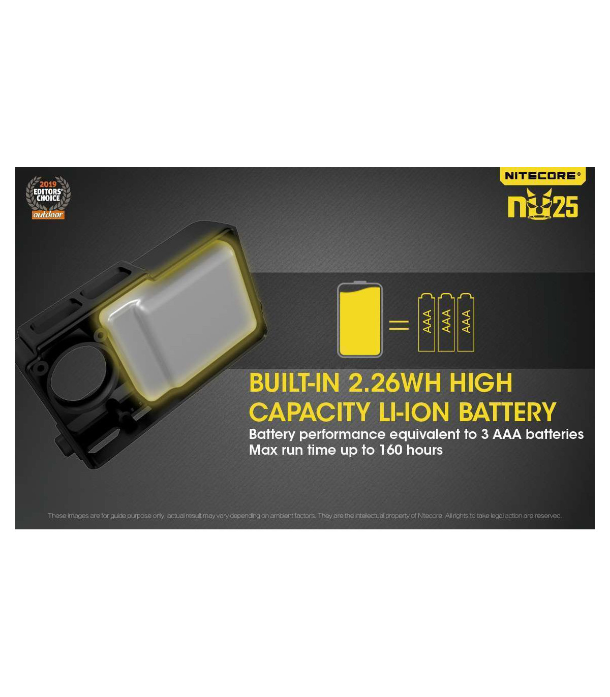 Get ready for one of the most versatile and compact headlamps Nitecore offers. The Nitecore NU25 headlamp packages three outputs (white/high CRI and red) into an ultra lightweight body you can wear comfortably for hours on end. A primary CREE XP-G2 S3 LED emits up to 360 lumens of light with up to 88 yards throw which can be used for running, cycling, setting up camp and so much more. For up close tasks, reading and photography, there is a secondary high CRI LED which produces a warm 20-lumen beam and renders colors and details better than cool white outputs. Last but not least, the NU25 also features a secondary red LED for preserving night vision, map reading and hunting. There are even three special modes (red caution/SOS/Beacon) for emergencies and signaling! Dual switch controls located conveniently on the top of the headlamp control white and red outputs separately and make it easy to switch between all three outputs so you always know what light you're accessing. The NU25 also features a lockout mode to prevent accidental button presses while stored in tight spaces. The NU25 comes with a built-in 610mAh li-ion battery that offers 30 minutes of runtime on Turbo and up to 160 hours on the lowest setting. Keeping the NU25 is super simple with a built-in micro-USB charging port located on the underside of the unit. Use the included charging cable to plug the light into any USB source and a red indicator light under the control buttons will illuminate. Upon completion, the light will turn green. There's even a battery power indicator so you'll never be caught with low battery again.