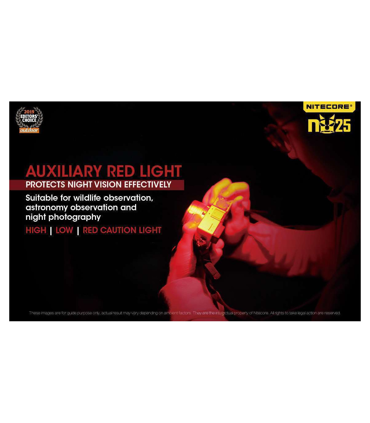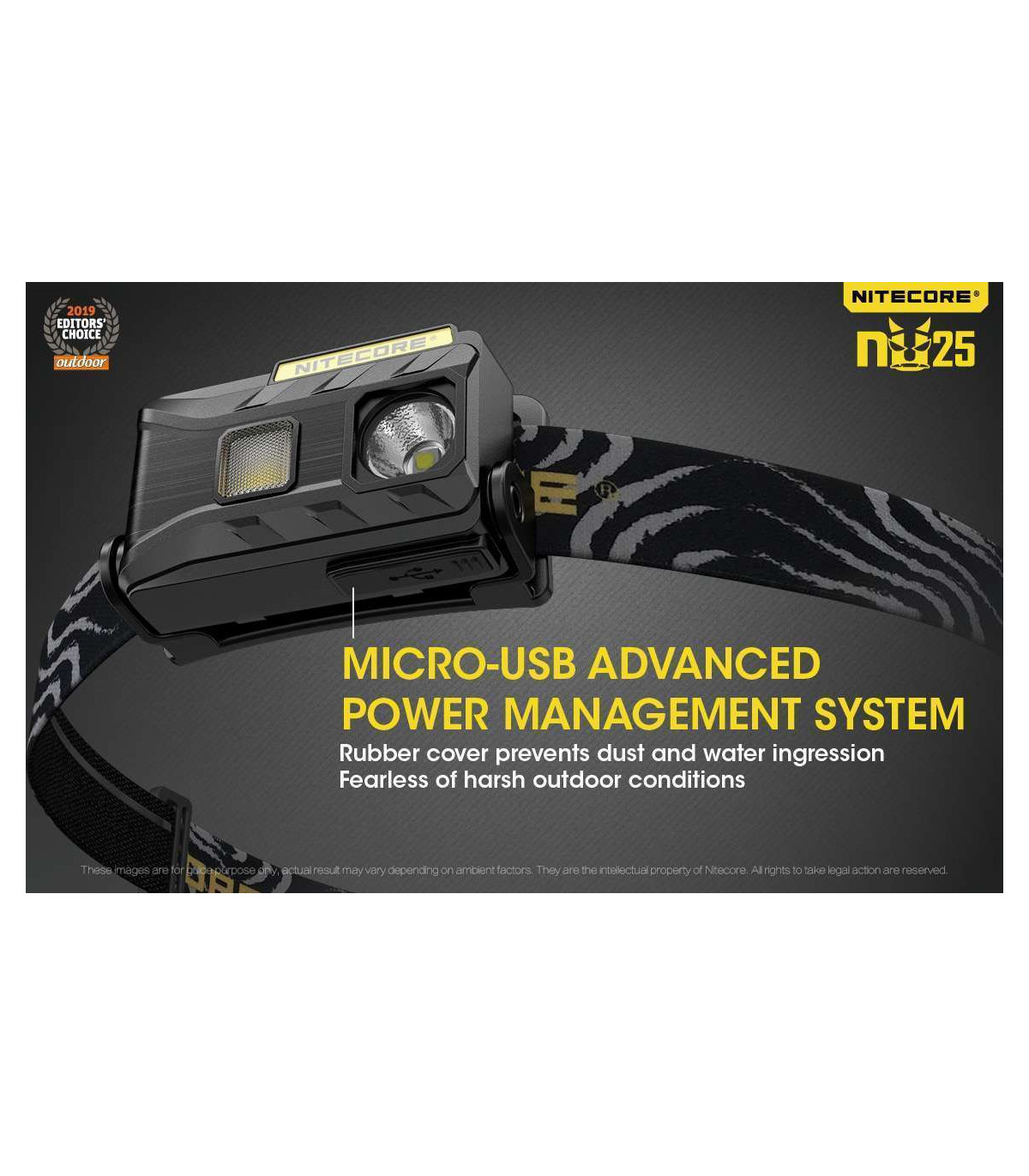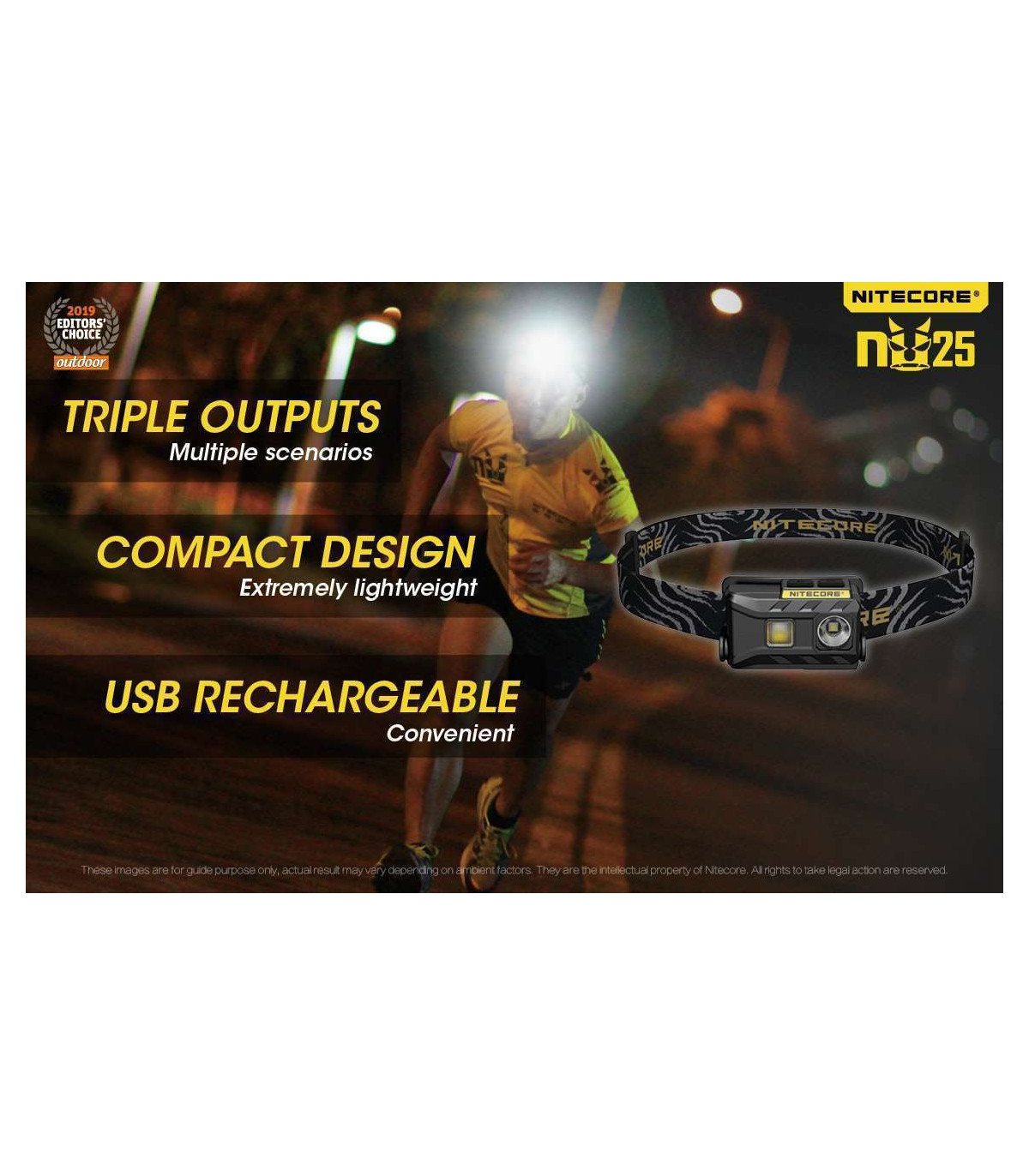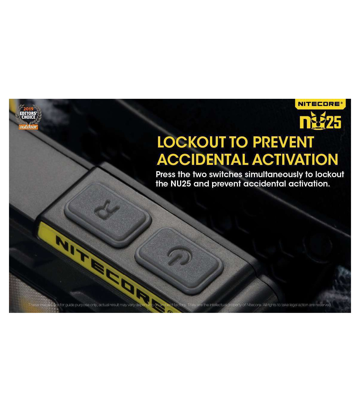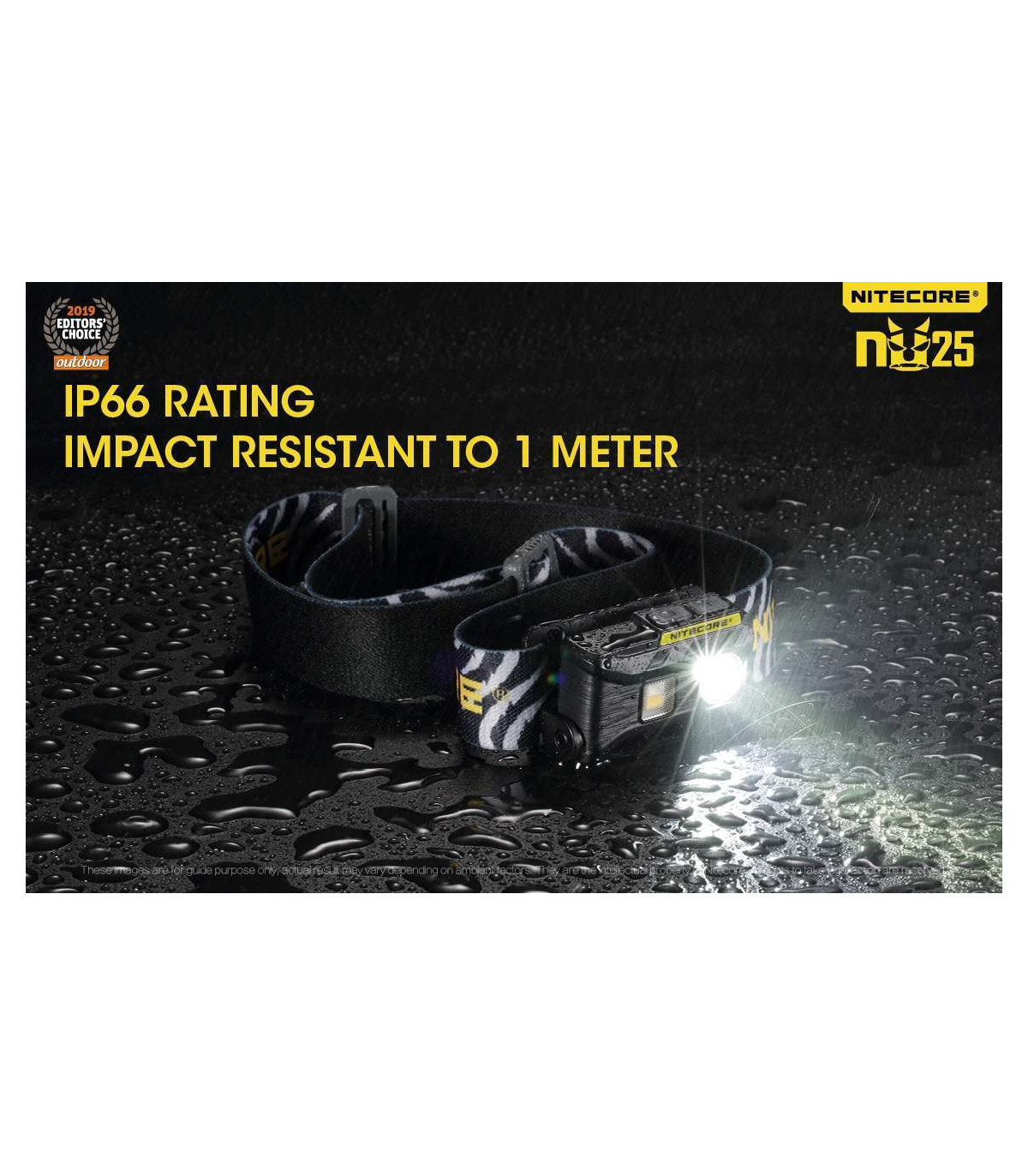 Get ready for one of the most versatile and compact headlamps Nitecore offers. The Nitecore NU25 headlamp packages three outputs (white/high CRI and red) into an ultra lightweight body you can wear comfortably for hours on end. A primary CREE XP-G2 S3 LED emits up to 360 lumens of light with up to 88 yards throw which can be used for running, cycling, setting up camp and so much more. For up close tasks, reading and photography, there is a secondary high CRI LED which produces a warm 20-lumen beam and renders colors and details better than cool white outputs. Last but not least, the NU25 also features a secondary red LED for preserving night vision, map reading and hunting. There are even three special modes (red caution/SOS/Beacon) for emergencies and signaling! Dual switch controls located conveniently on the top of the headlamp control white and red outputs separately and make it easy to switch between all three outputs so you always know what light you're accessing. The NU25 also features a lockout mode to prevent accidental button presses while stored in tight spaces. The NU25 comes with a built-in 610mAh li-ion battery that offers 30 minutes of runtime on Turbo and up to 160 hours on the lowest setting. Keeping the NU25 is super simple with a built-in micro-USB charging port located on the underside of the unit. Use the included charging cable to plug the light into any USB source and a red indicator light under the control buttons will illuminate. Upon completion, the light will turn green. There's even a battery power indicator so you'll never be caught with low battery again.