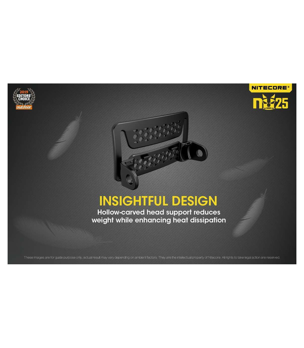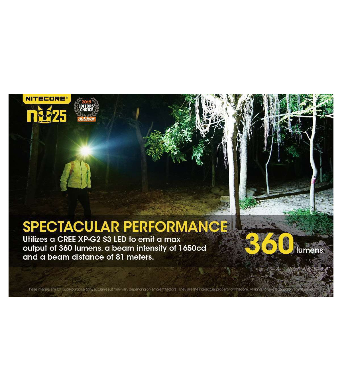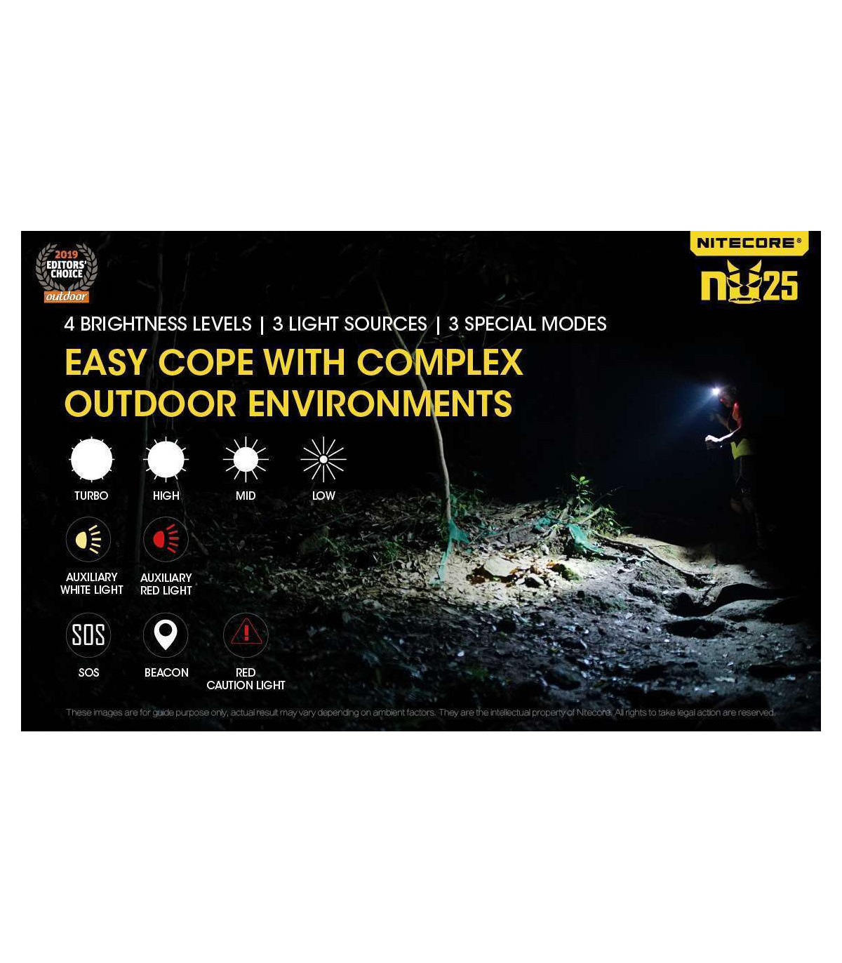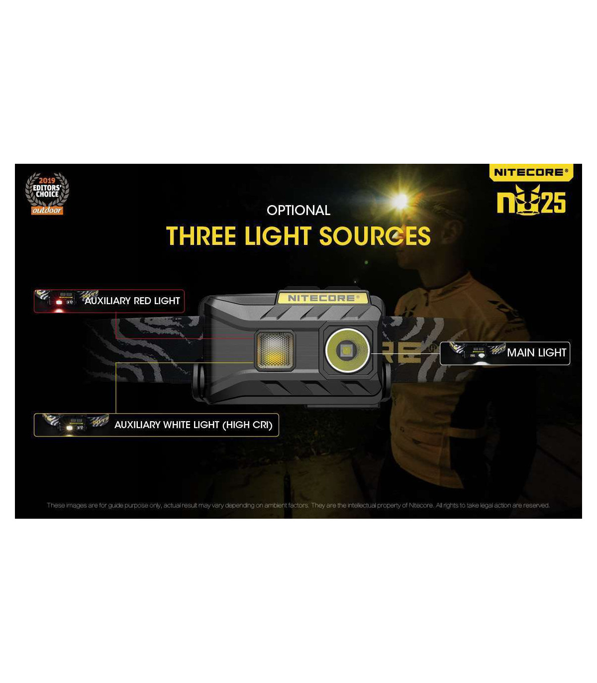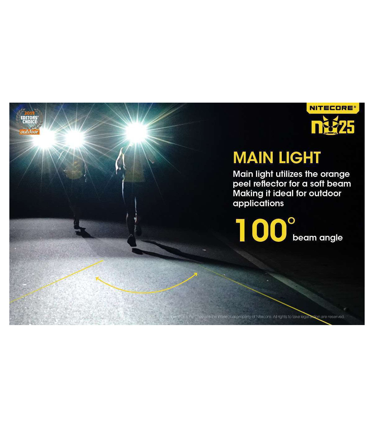 Get ready for one of the most versatile and compact headlamps Nitecore offers. The Nitecore NU25 headlamp packages three outputs (white/high CRI and red) into an ultra lightweight body you can wear comfortably for hours on end. A primary CREE XP-G2 S3 LED emits up to 360 lumens of light with up to 88 yards throw which can be used for running, cycling, setting up camp and so much more. For up close tasks, reading and photography, there is a secondary high CRI LED which produces a warm 20-lumen beam and renders colors and details better than cool white outputs. Last but not least, the NU25 also features a secondary red LED for preserving night vision, map reading and hunting. There are even three special modes (red caution/SOS/Beacon) for emergencies and signaling! Dual switch controls located conveniently on the top of the headlamp control white and red outputs separately and make it easy to switch between all three outputs so you always know what light you're accessing. The NU25 also features a lockout mode to prevent accidental button presses while stored in tight spaces. The NU25 comes with a built-in 610mAh li-ion battery that offers 30 minutes of runtime on Turbo and up to 160 hours on the lowest setting. Keeping the NU25 is super simple with a built-in micro-USB charging port located on the underside of the unit. Use the included charging cable to plug the light into any USB source and a red indicator light under the control buttons will illuminate. Upon completion, the light will turn green. There's even a battery power indicator so you'll never be caught with low battery again.