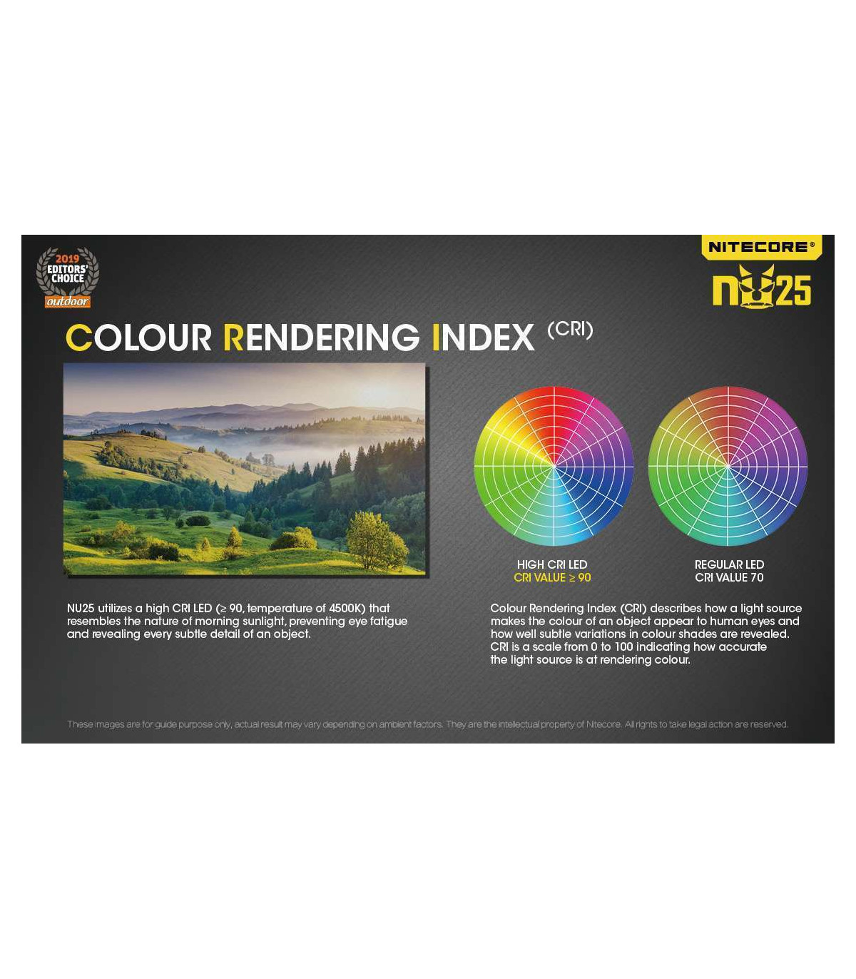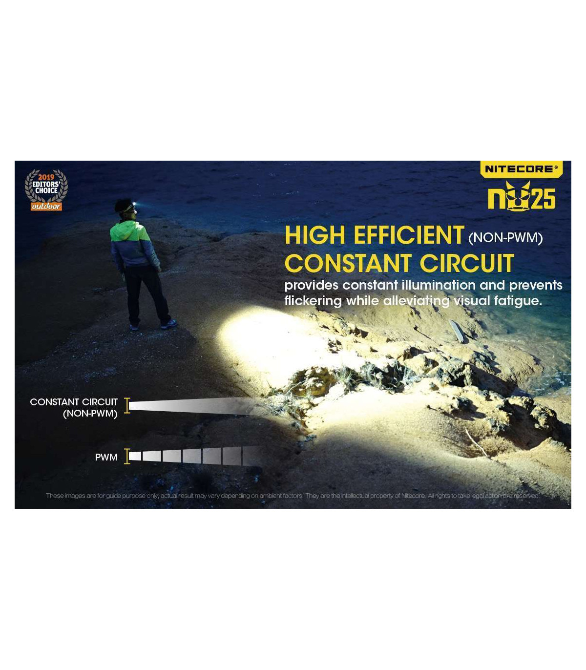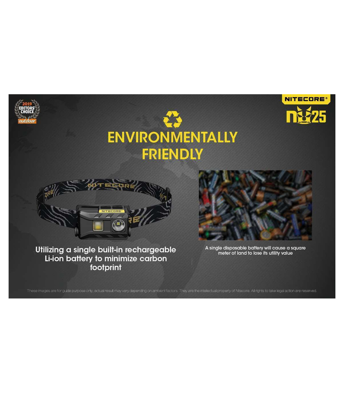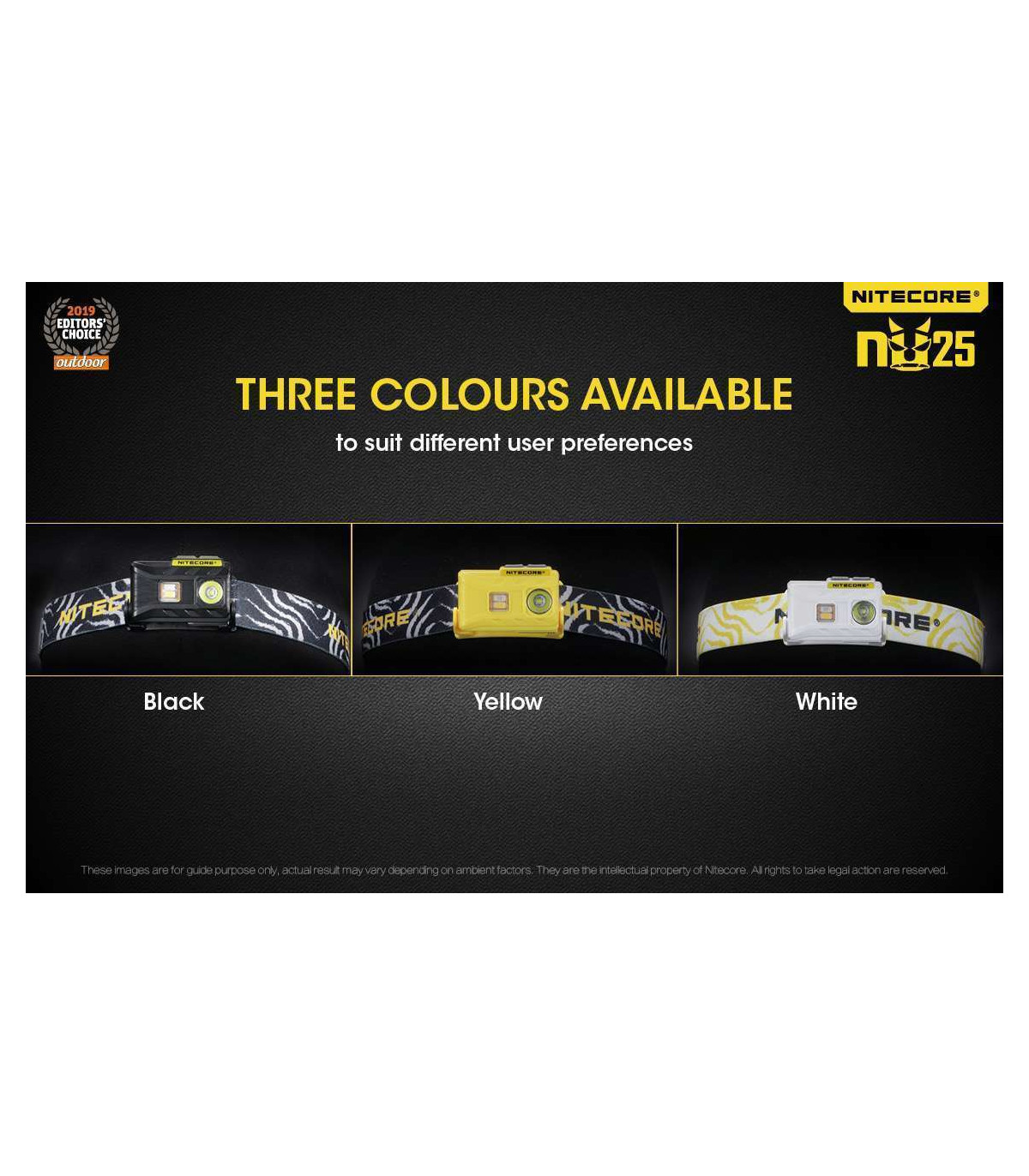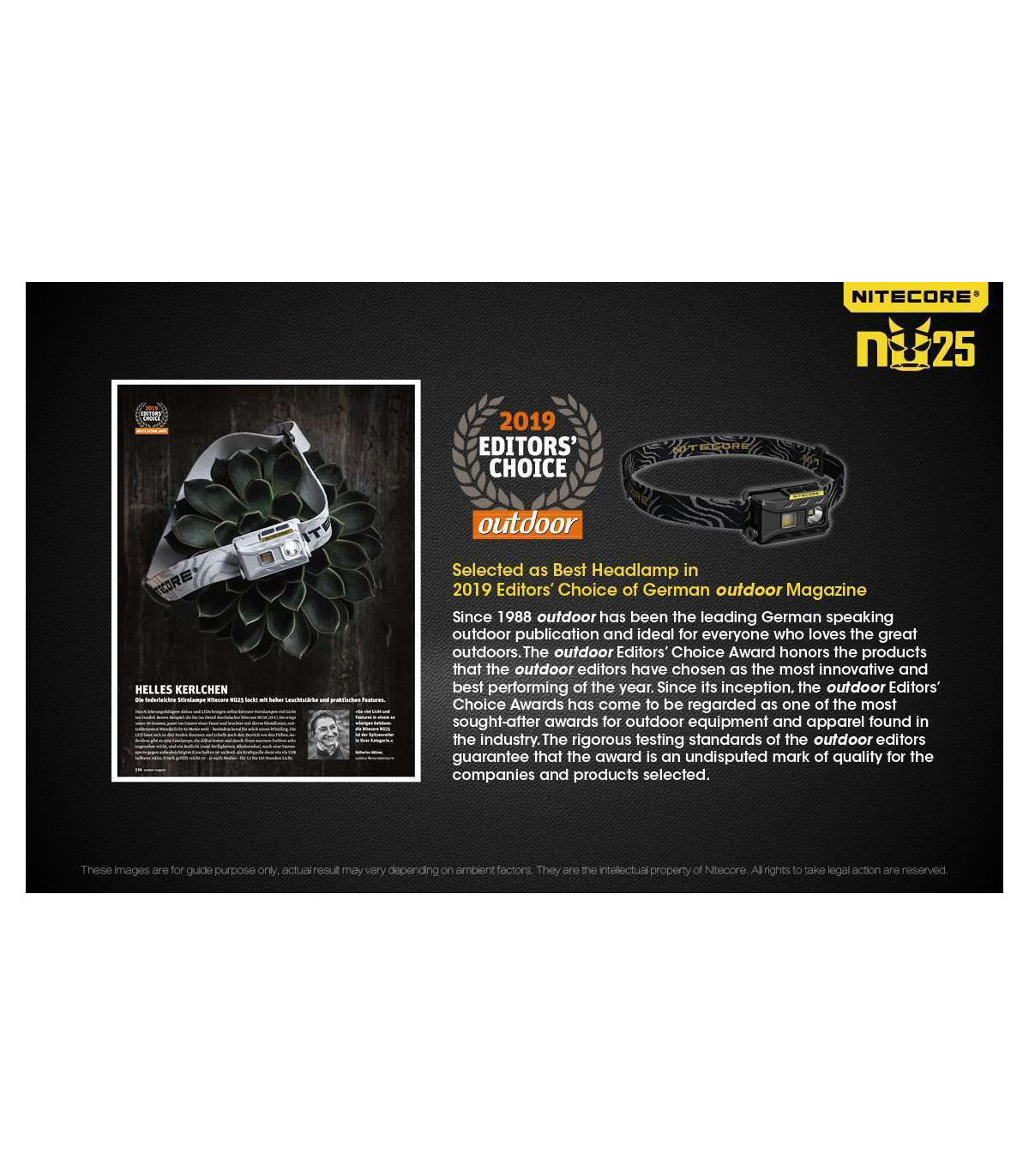 Get ready for one of the most versatile and compact headlamps Nitecore offers. The Nitecore NU25 headlamp packages three outputs (white/high CRI and red) into an ultra lightweight body you can wear comfortably for hours on end. A primary CREE XP-G2 S3 LED emits up to 360 lumens of light with up to 88 yards throw which can be used for running, cycling, setting up camp and so much more. For up close tasks, reading and photography, there is a secondary high CRI LED which produces a warm 20-lumen beam and renders colors and details better than cool white outputs. Last but not least, the NU25 also features a secondary red LED for preserving night vision, map reading and hunting. There are even three special modes (red caution/SOS/Beacon) for emergencies and signaling! Dual switch controls located conveniently on the top of the headlamp control white and red outputs separately and make it easy to switch between all three outputs so you always know what light you're accessing. The NU25 also features a lockout mode to prevent accidental button presses while stored in tight spaces. The NU25 comes with a built-in 610mAh li-ion battery that offers 30 minutes of runtime on Turbo and up to 160 hours on the lowest setting. Keeping the NU25 is super simple with a built-in micro-USB charging port located on the underside of the unit. Use the included charging cable to plug the light into any USB source and a red indicator light under the control buttons will illuminate. Upon completion, the light will turn green. There's even a battery power indicator so you'll never be caught with low battery again.