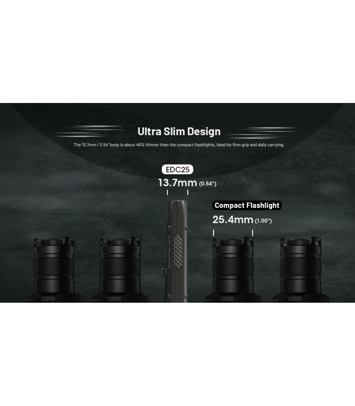 Το σώμα του με πάχος μόλις 13,7mm είναι περίπου 46% λεπτότερο από τους συνηθισμένους μικρούς φακούς. Αυτό τον καθιστά ιδανικό για ασφαλές κράτημα και καθημερινή χρήση.
