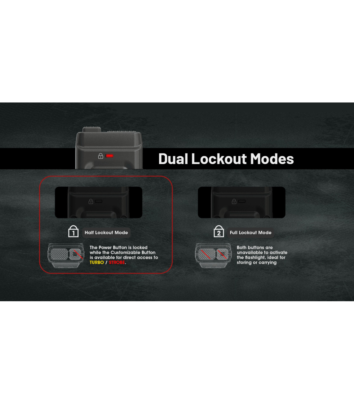 Και τα δύο κουμπιά είναι κλειδωμένα και δεν μπορούν να ενεργοποιήσουν τον φακό. Είναι ιδανική λειτουργία για αποθήκευση και μεταφορά.