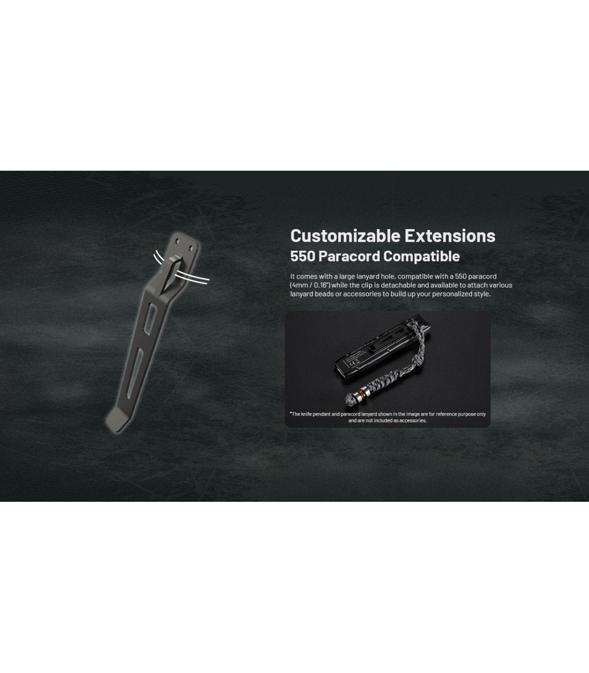 Διαθέτει μεγάλη οπή για λουράκι καρπού , συμβατή με σχοινί Paracord 550  (4mm) . Το κλιπ μπορεί να αφαιρεθεί  και να επιτρέψει την προσαρμογή