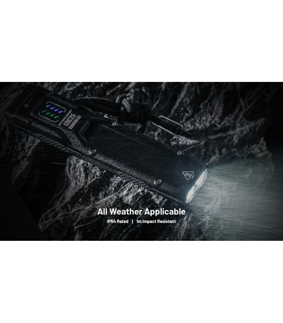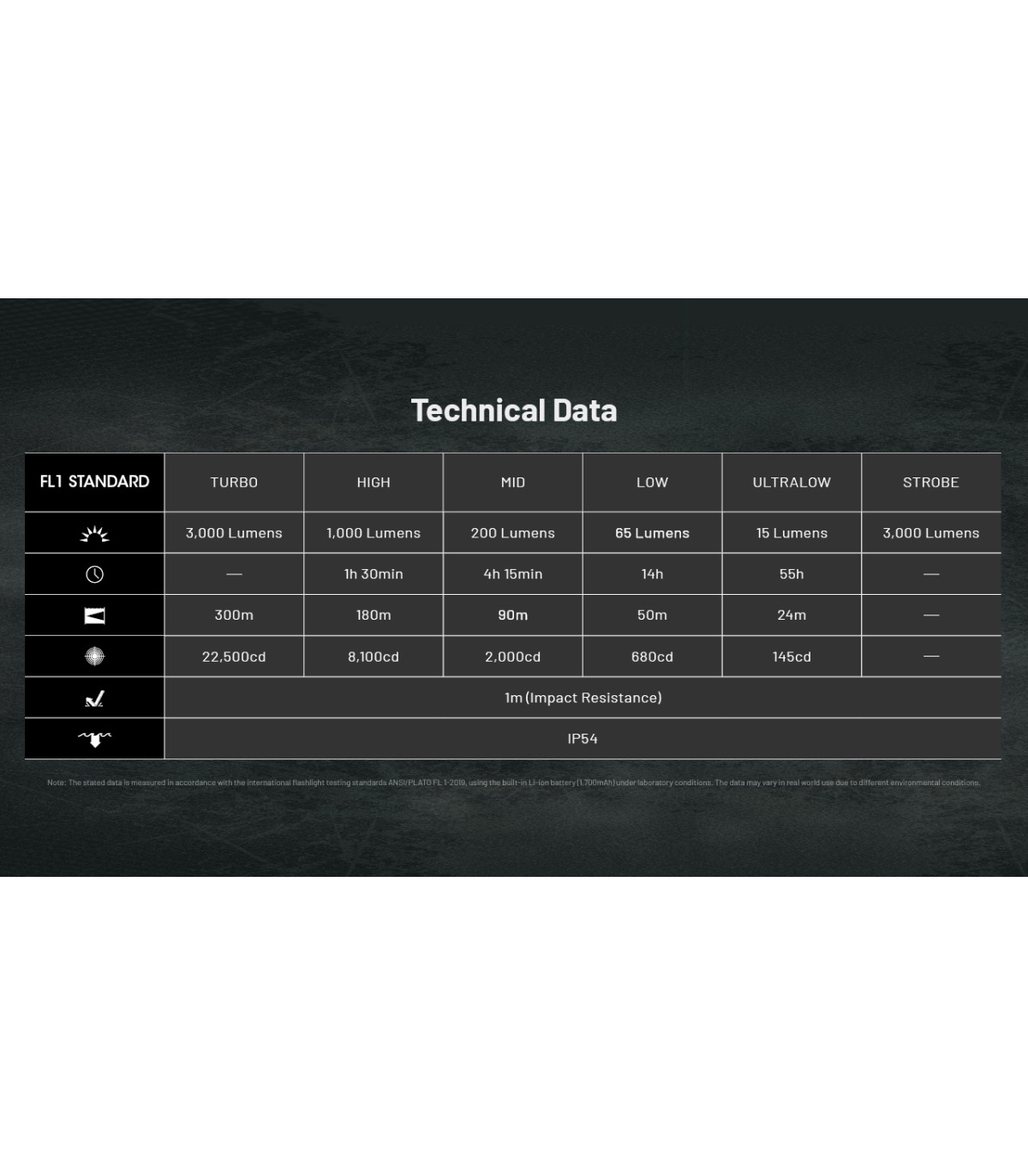 * Τα αναφερόμενα δεδομένα έχουν μετρηθεί σύμφωνα με τα διεθνή πρότυπα μέτρησης των φακών ANSI/PLATO FL-1 2019 με την χρήση της ενσωματωμένης μπαταρίας (1700mAh) σε εργαστηριακές συνθήκες. Τα δεδομένα μπορεί να διαφέρουν σε χρήση στον πραγματικό κόσμο εξαιτίας των περιβαλλοντικών συνθηκών.
