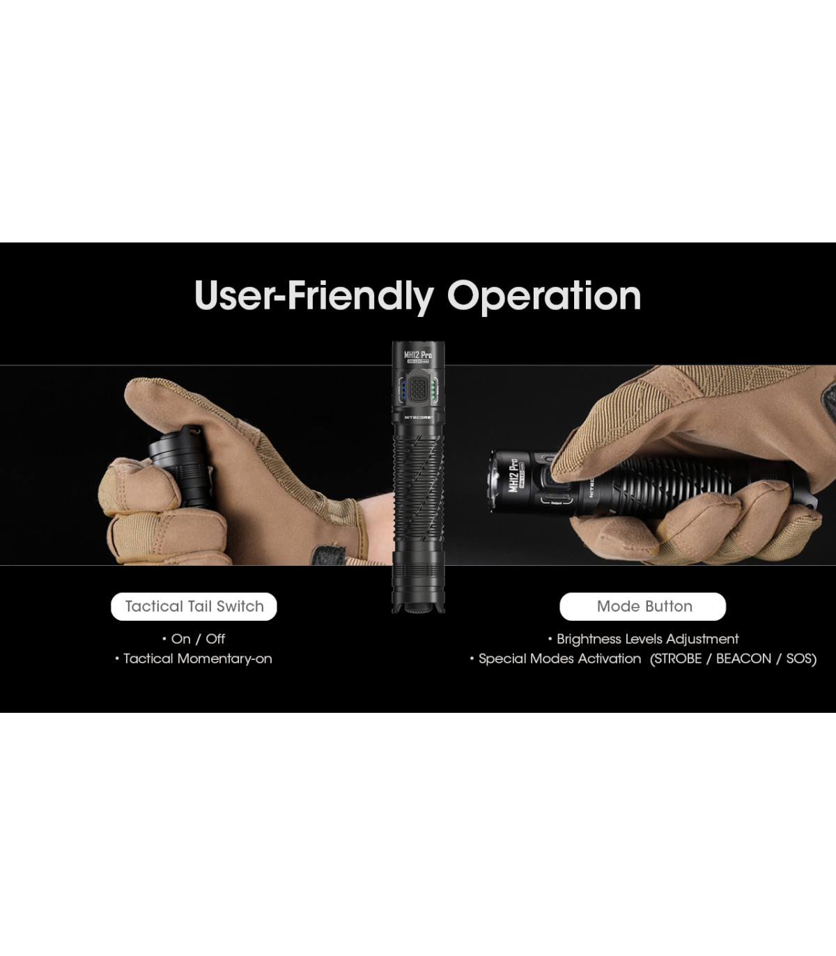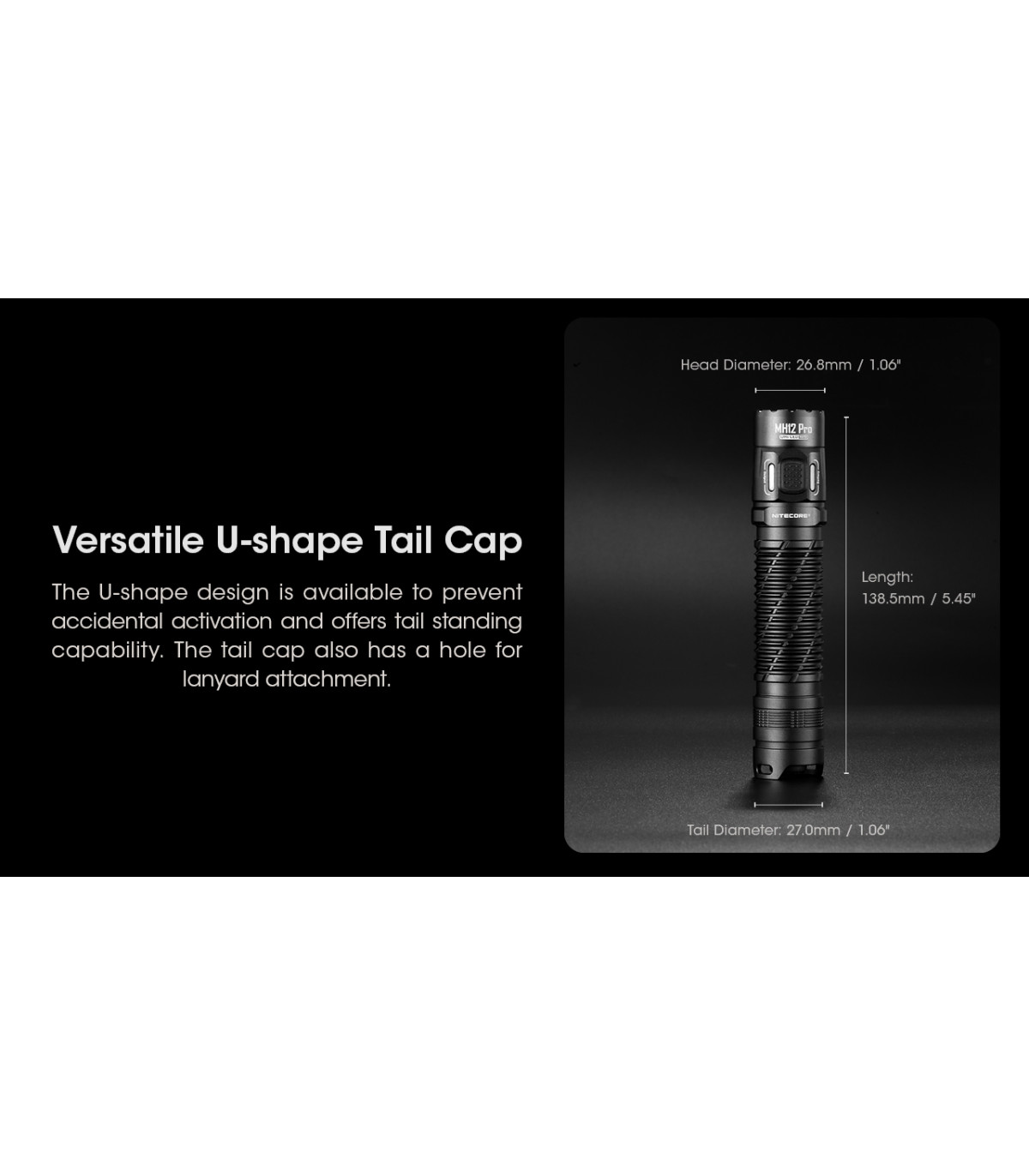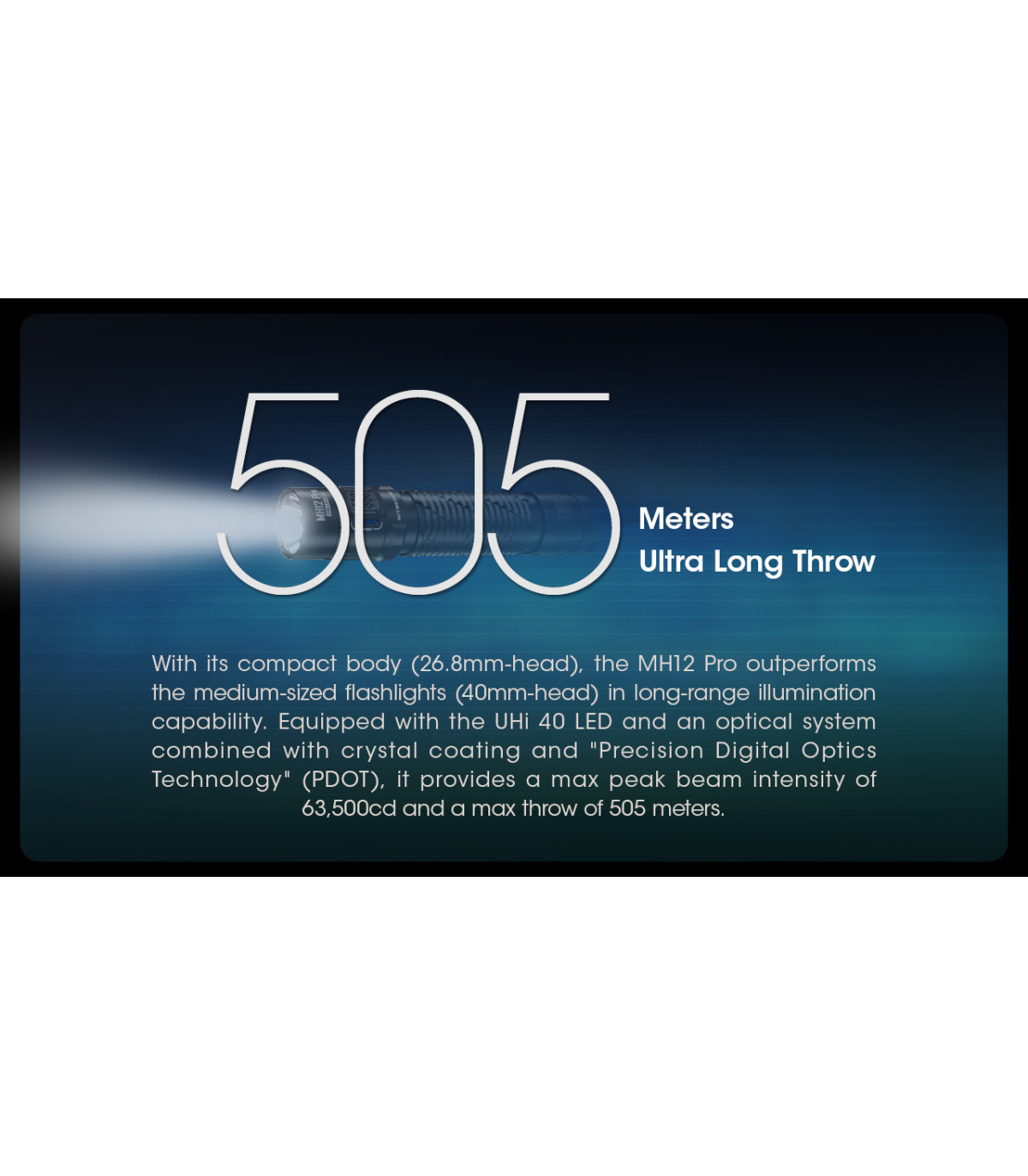 Με το συμπαγές σώμα του (26,8mm-κεφαλή), ο MH12 pro ξεπερνά τους φακούς μεσαίου μεγέθους (με κεφαλή 40mm) σε ικανότητα φωτισμού