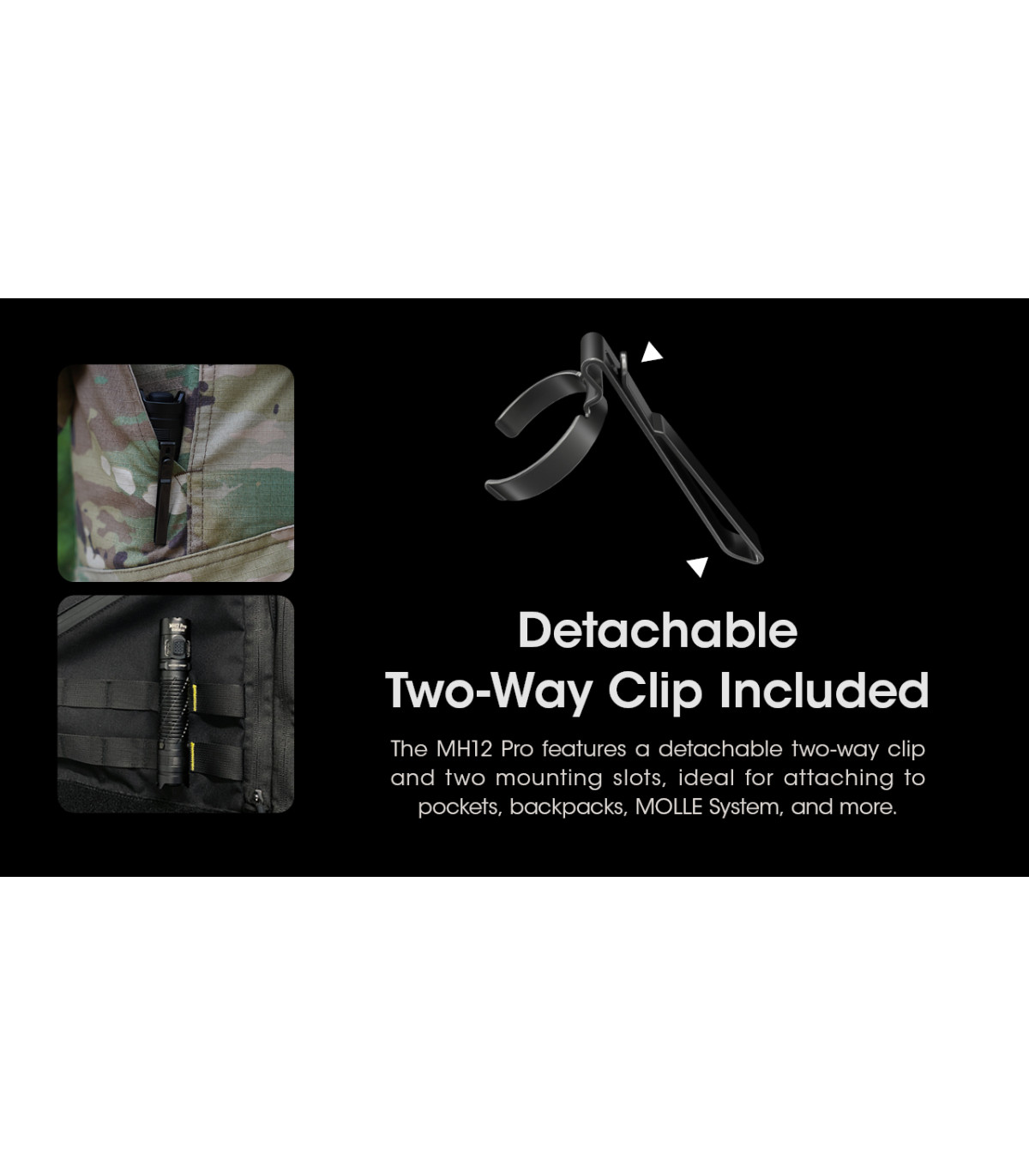 Ο MH12Pro διαθέτει ένα αποσπώμενο κλιπ διπλής κατεύθυνσης και δύο υποδοχές τοποθέτησης, ιδανικό για προσάρτηση σε τσέπες,