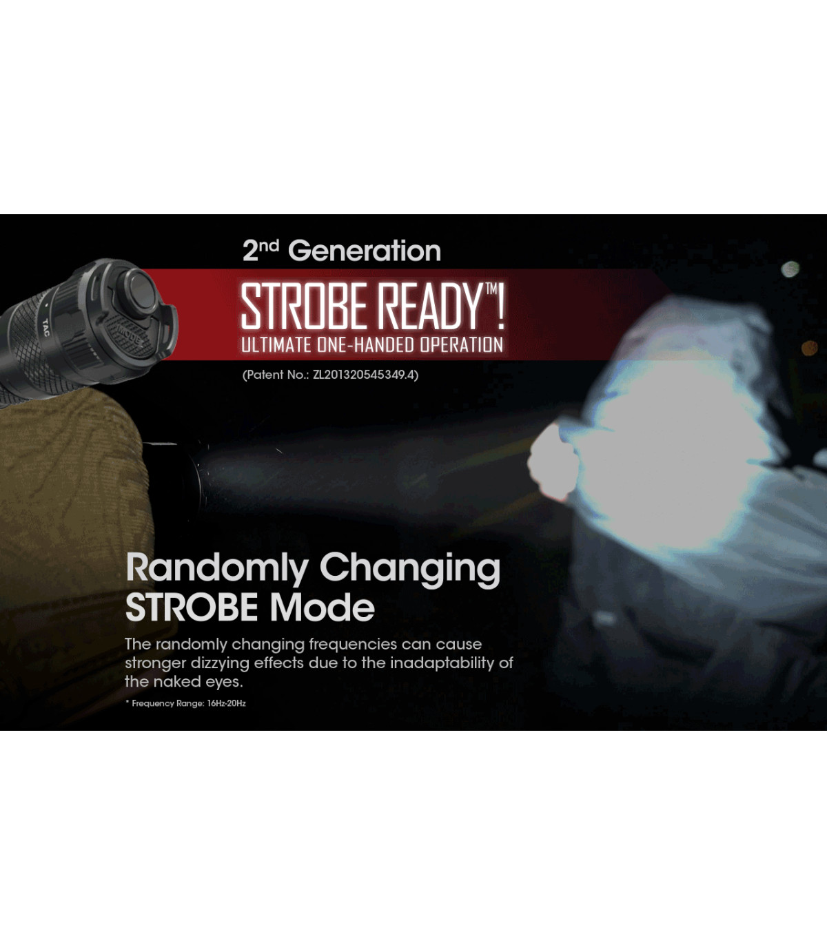 – Η λειτουργία STROBE χρησιμοποιεί τυχαία μεταβαλλόμενες συχνότητες για ισχυρότερη ζάλη