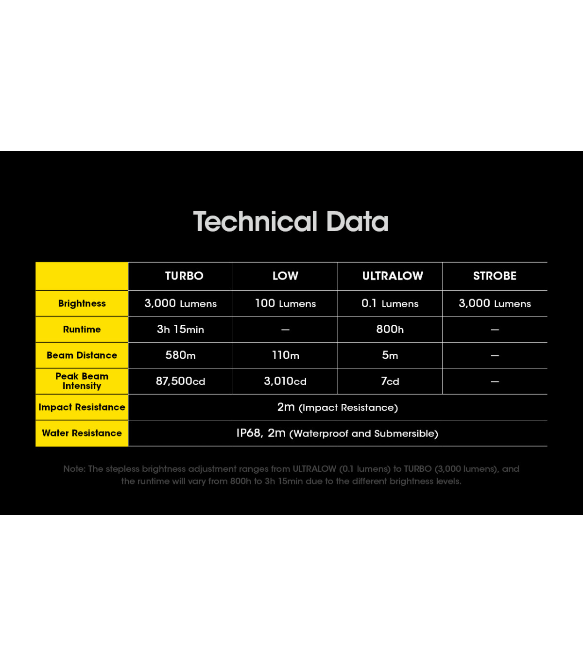 * Σημείωση: Η διαβάθμιση φωτεινότητας χωρίς βήμα κυμαίνεται από το πολύ χαμηλό 0,1 Lumen έως το Turbo 3000Lumens και ο χρόνος λειτουργίας θα μεταβάλεται από 800 ώρες έως 3ώρες και 15 λεπτά εξαιτίας διαφορετικών επιπέδων έντασης φωτισμού.