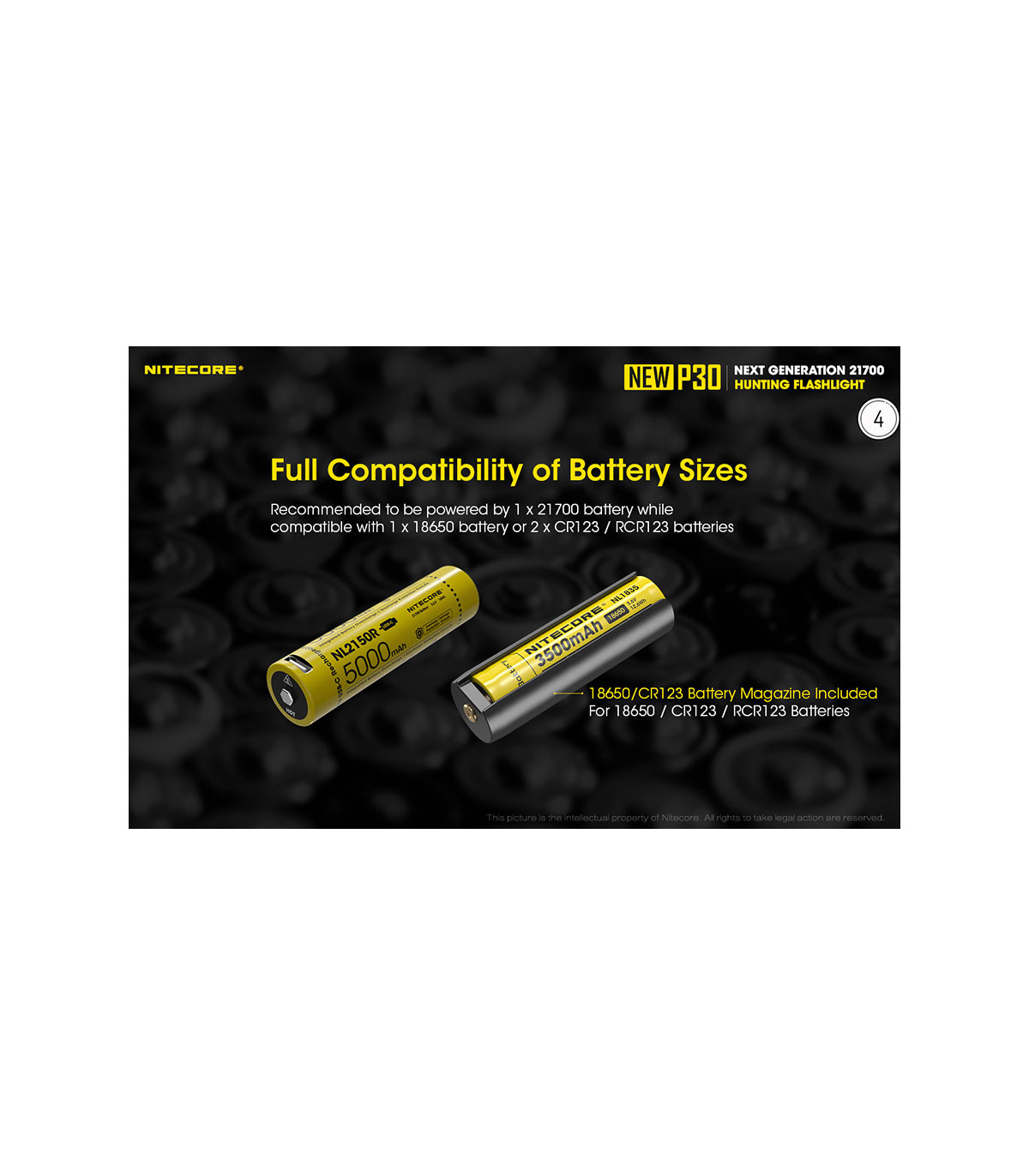 Συστήνεται η χρήση του με μπαταρίες 21700 ενώ ταυτόχρονα είναι συμβατός με μπαταρίες 18650 και μπαταρίες CR123 / RCR123.