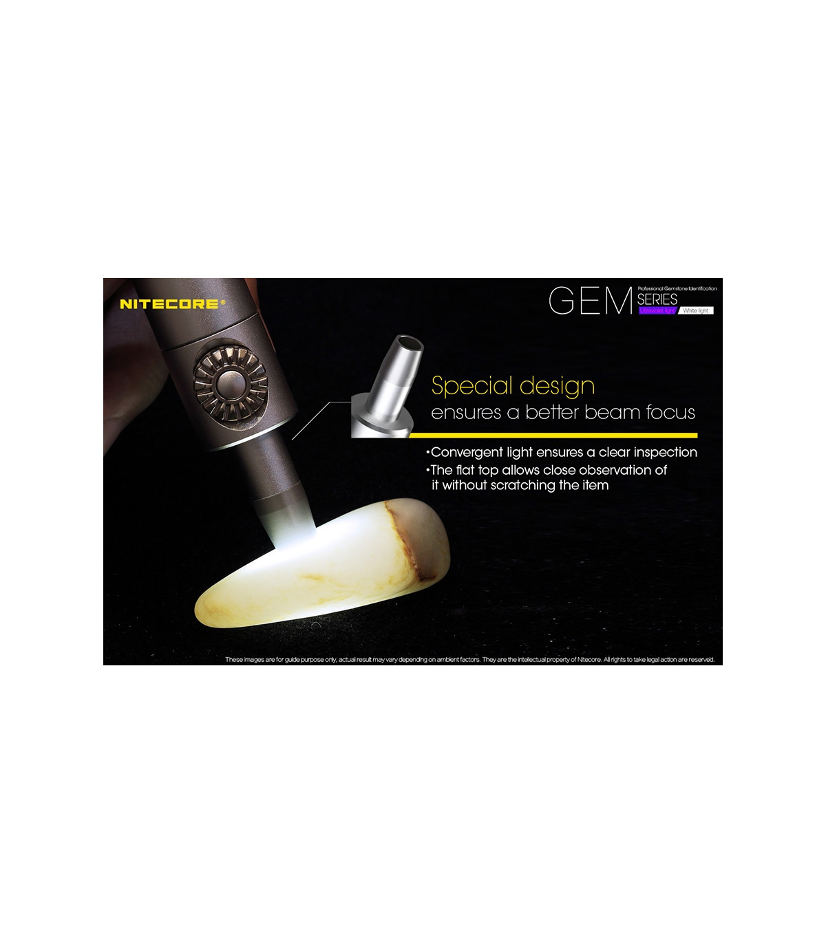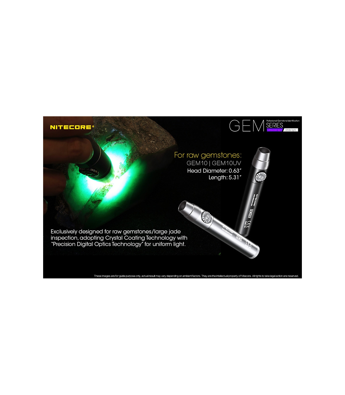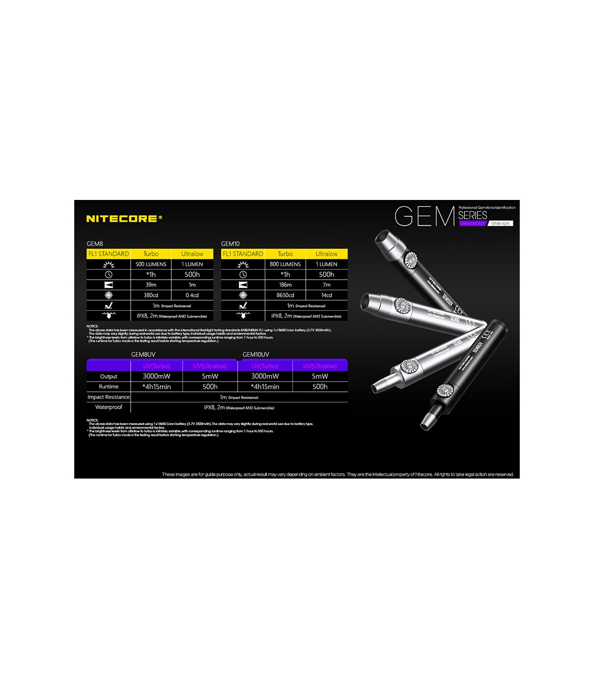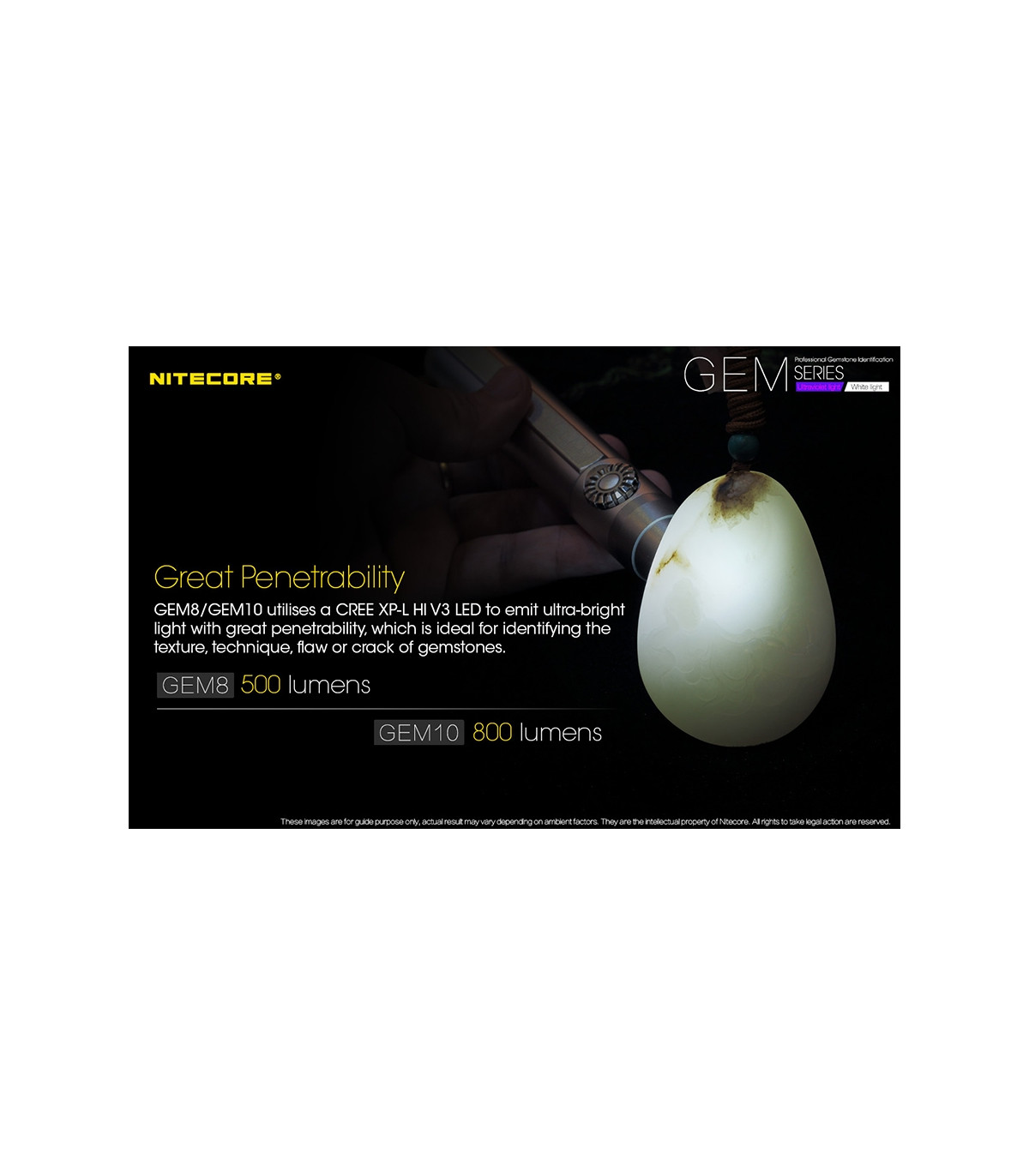 Τα GEM8 / GEM10 διαθέτουν ένα LED CREE XP-L Hi V3 που εκπέμπει εξαιρετικά φωτεινή δέσμη με εξαιρετική διεισδυτικότητα που είναι ιδανική για την αναγνώριση της υφής, της τεχνικής, ελαττωμάτων και ραγισμάτων στις πολύτιμες πέτρες.
