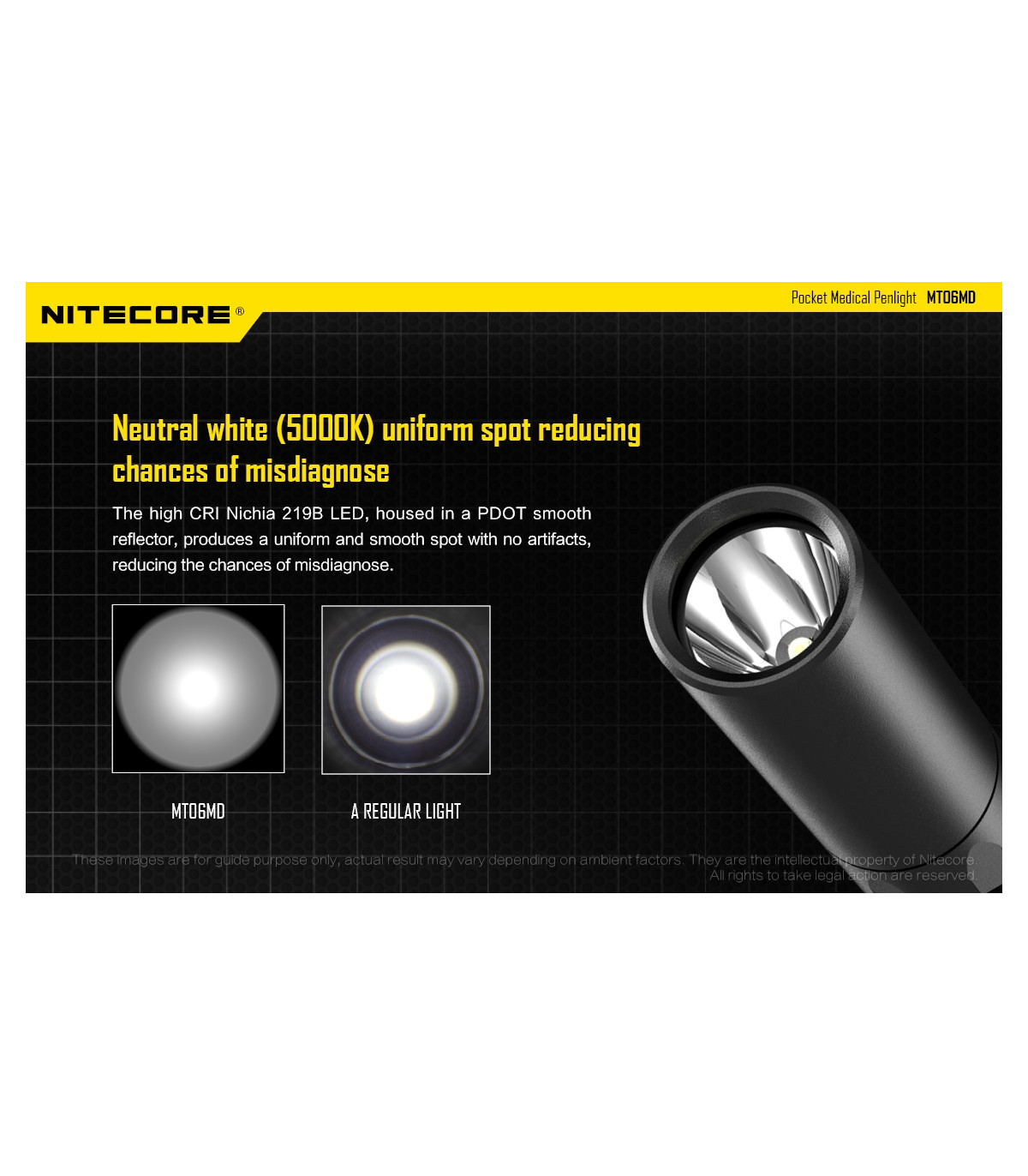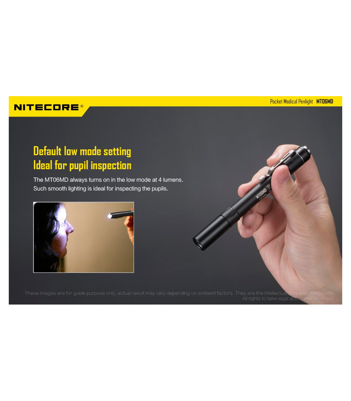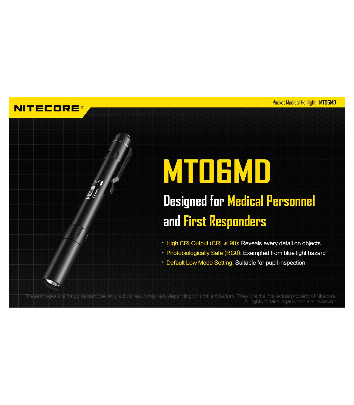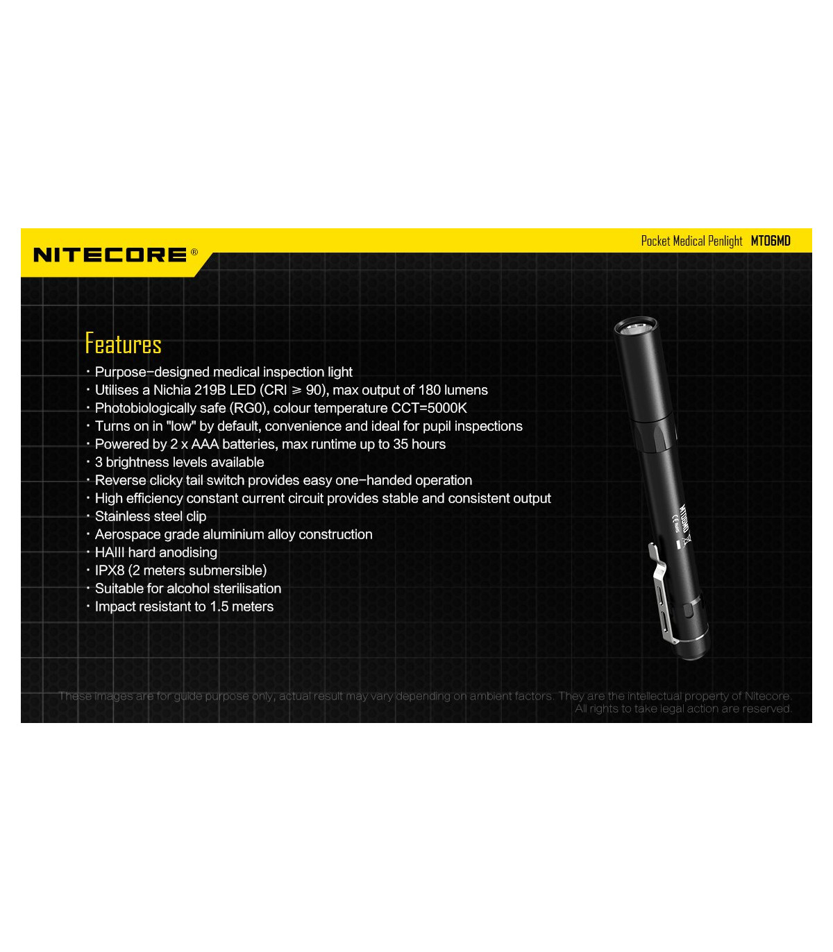 Λεπτός φακός LED ειδικά σχεδιασμένος για το Ιατρικό προσωπικό και το προσωπικό Πρώτων Βοηθειών. Διαθέτει LED Nichia 219B με υψηλό CRI (>90) που σημαίνει ότι το φως του αποκαλείπτει κάθε λεπτομέρεια των φωτιζόμενων αντικειμένων. Φωτοβιολογικά ασφαλές (RG0), απαλλαγμένο από το επικύνδυνο μπλε φως. Διαθέτει ώς προεπιλεγμένη λειτουργία την χαμηλή ένταση (4 Lumens) , ιδανική για την εξέταση της κόρης των ματιών. Πέρα από την άρχική χαμηλή ένταση διαθέτει επίσης μεσαία ένταση με 45Lumens και υψηλή ένταση με 180Lumens. Το χρώμα του φωτισμού είναι Ουδέτερο Λευκό στα 5000K και παρουσιάζεται ως μία ενιαία ομοιόμορφη δέσμη που βοηθά στην καλύτερη διάγνωση.