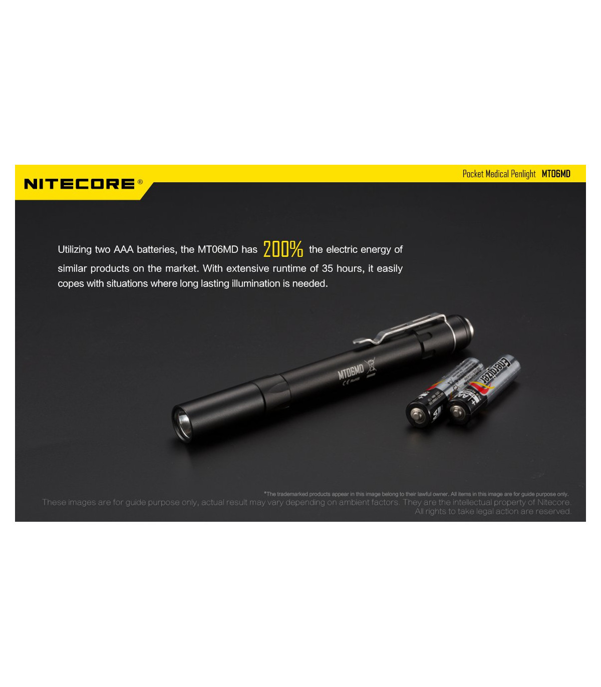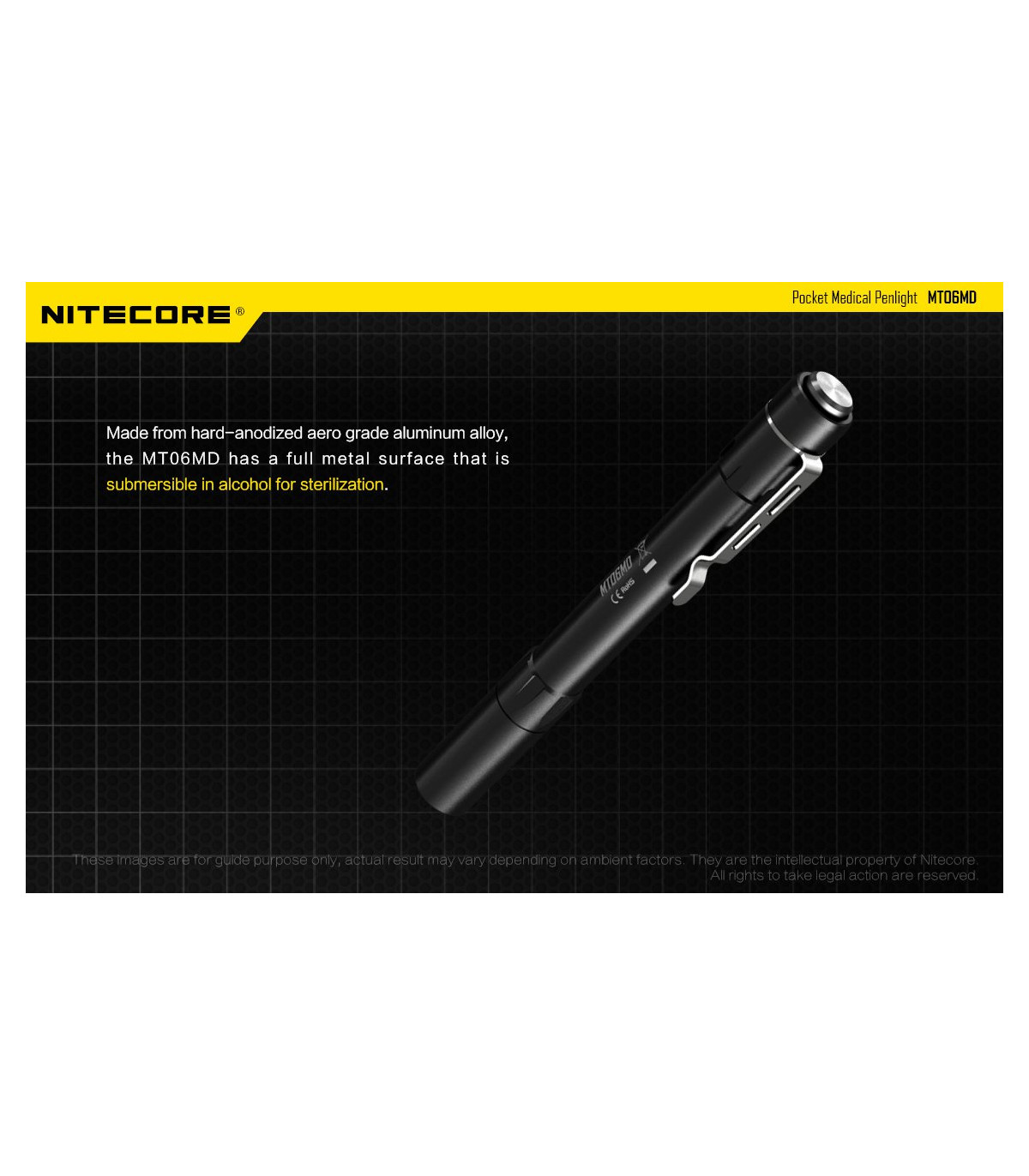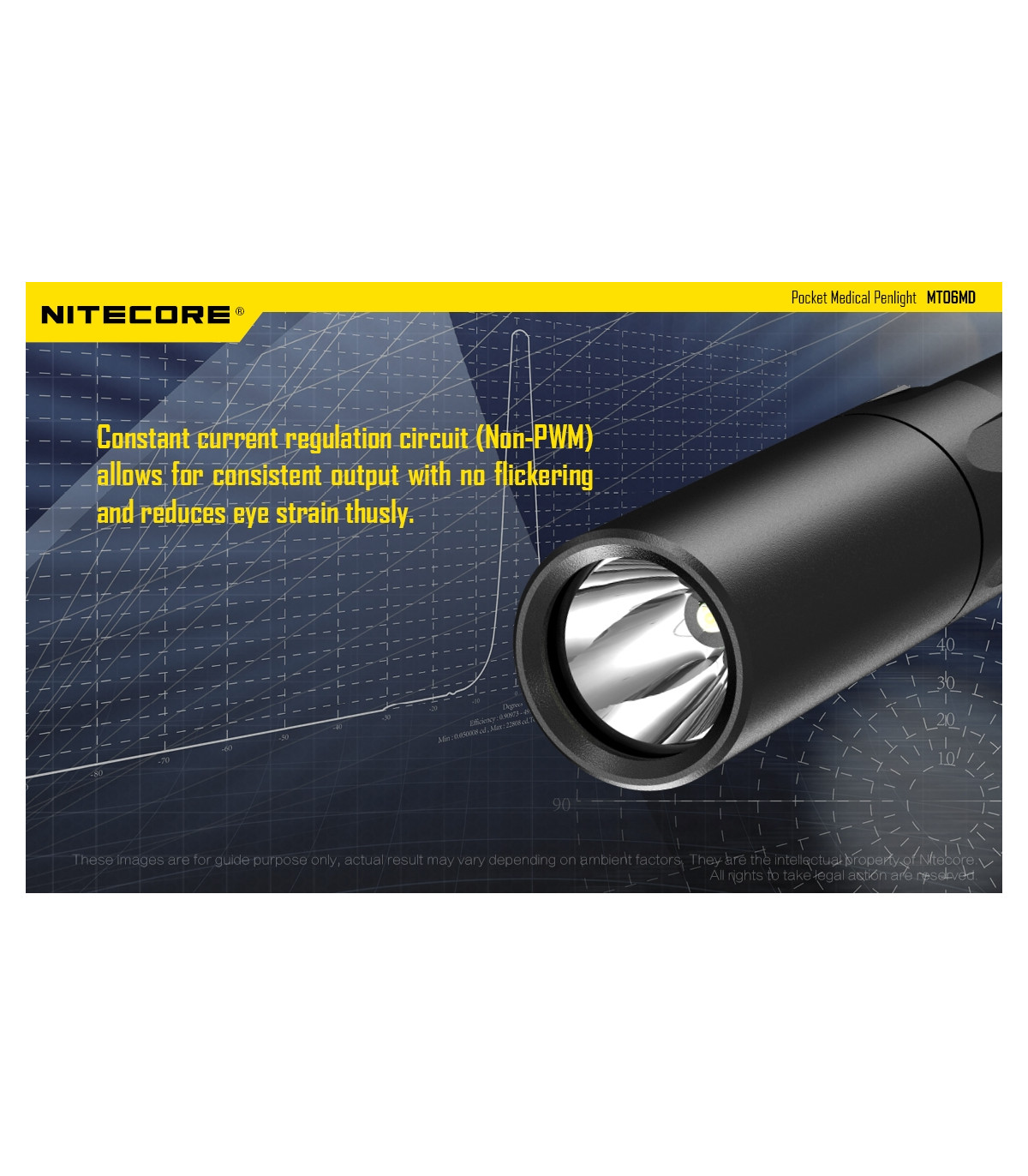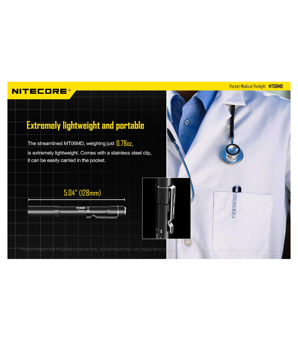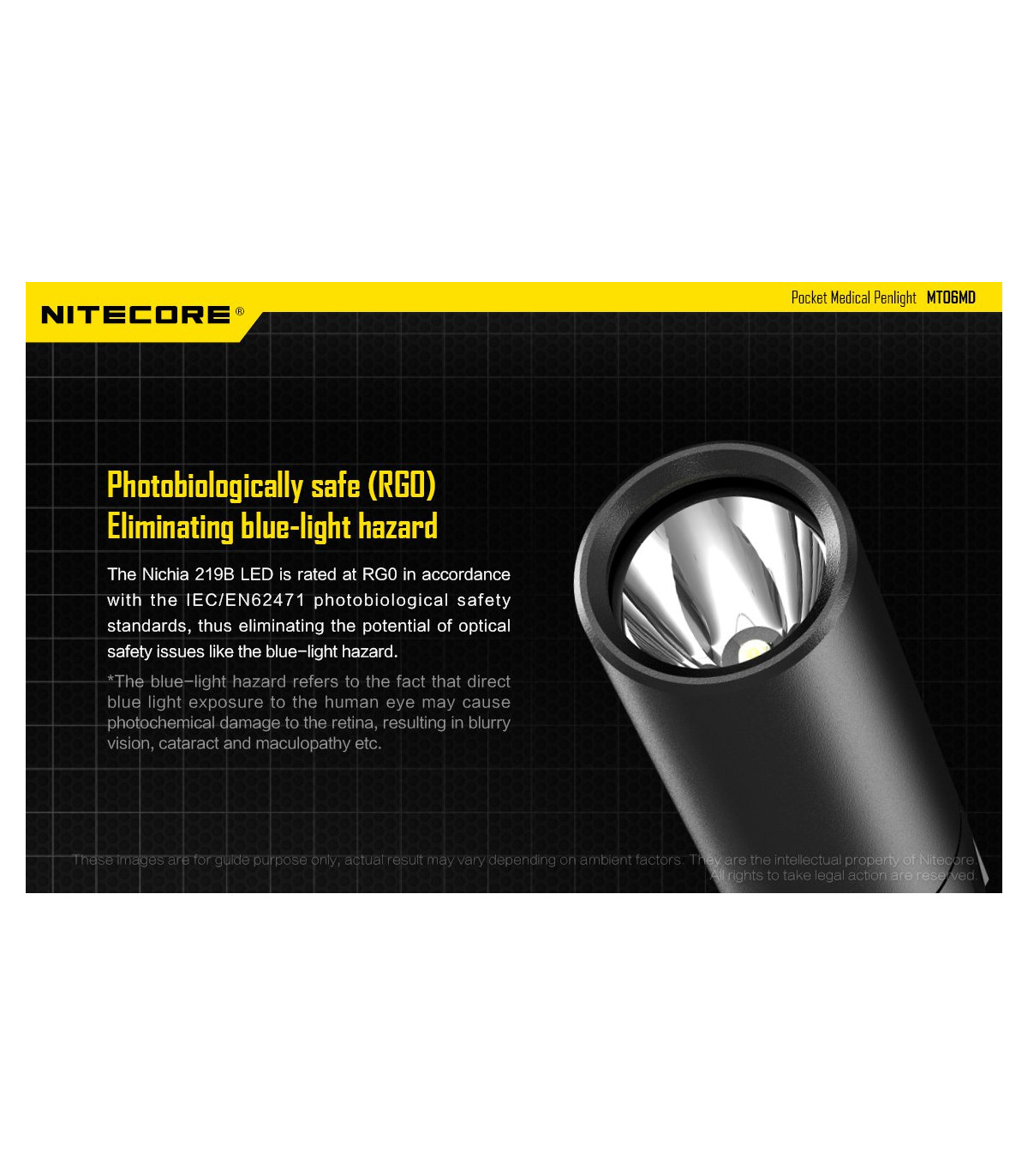 Λεπτός φακός LED ειδικά σχεδιασμένος για το Ιατρικό προσωπικό και το προσωπικό Πρώτων Βοηθειών. Διαθέτει LED Nichia 219B με υψηλό CRI (>90) που σημαίνει ότι το φως του αποκαλείπτει κάθε λεπτομέρεια των φωτιζόμενων αντικειμένων. Φωτοβιολογικά ασφαλές (RG0), απαλλαγμένο από το επικύνδυνο μπλε φως. Διαθέτει ώς προεπιλεγμένη λειτουργία την χαμηλή ένταση (4 Lumens) , ιδανική για την εξέταση της κόρης των ματιών. Πέρα από την άρχική χαμηλή ένταση διαθέτει επίσης μεσαία ένταση με 45Lumens και υψηλή ένταση με 180Lumens. Το χρώμα του φωτισμού είναι Ουδέτερο Λευκό στα 5000K και παρουσιάζεται ως μία ενιαία ομοιόμορφη δέσμη που βοηθά στην καλύτερη διάγνωση.