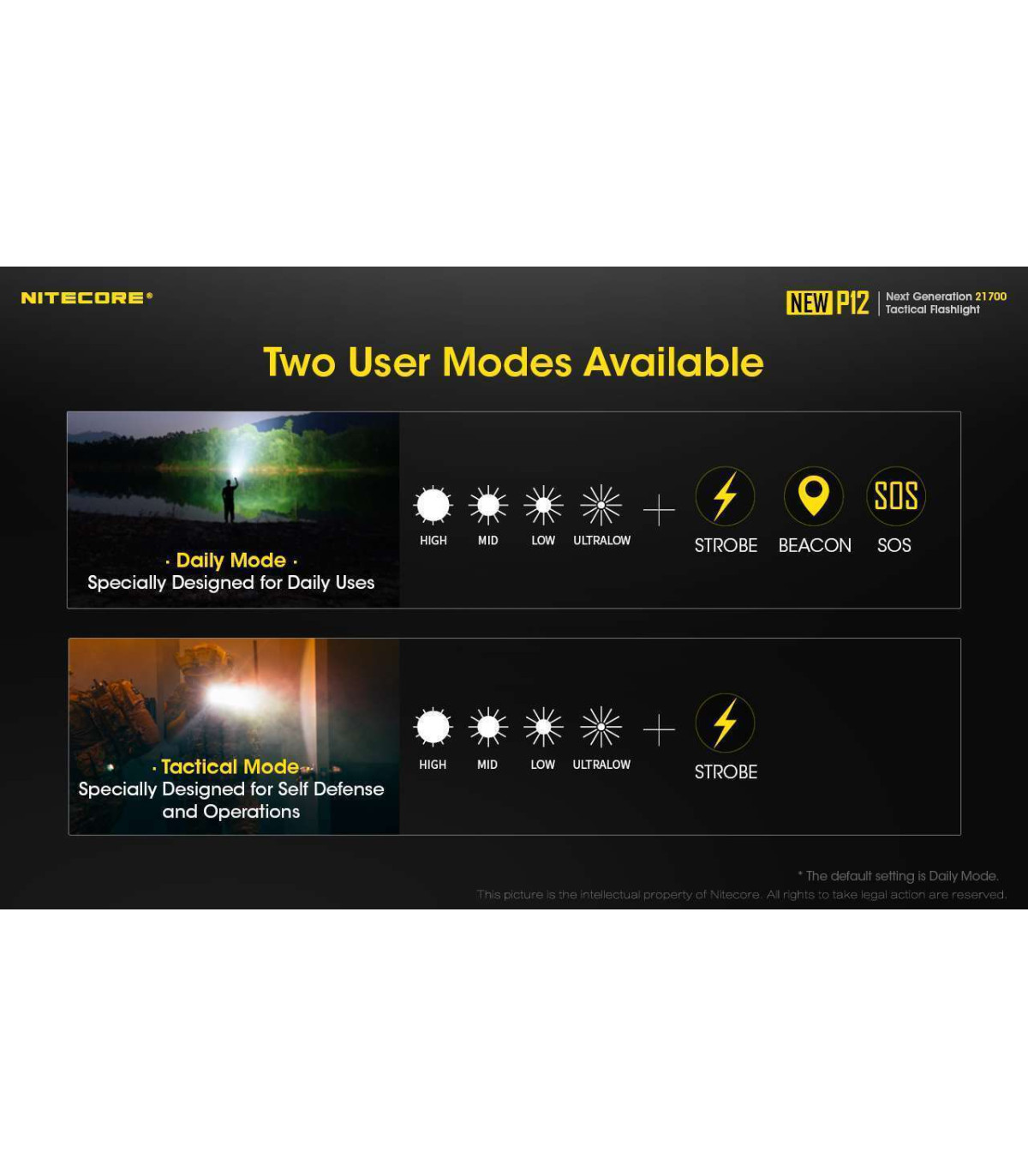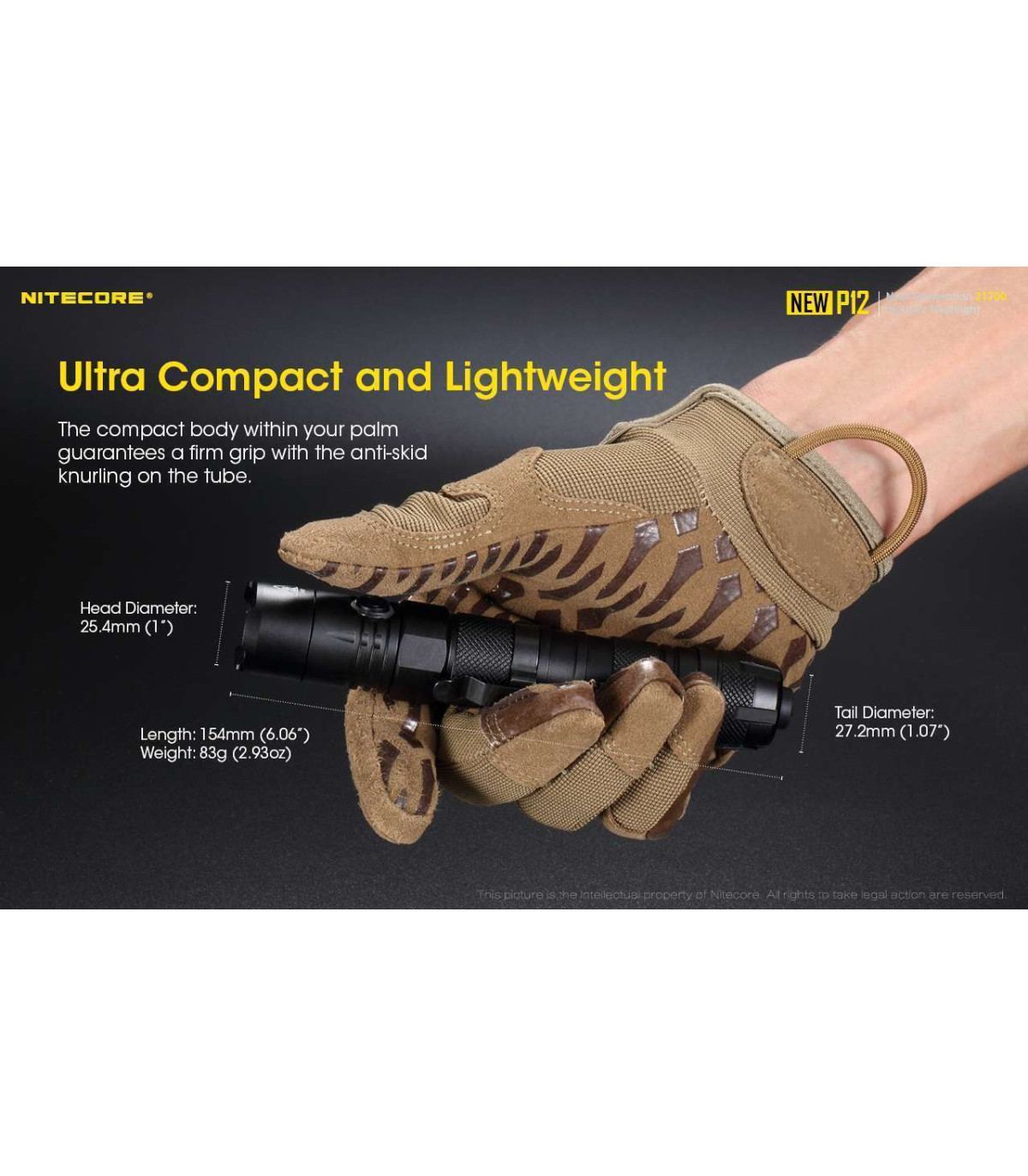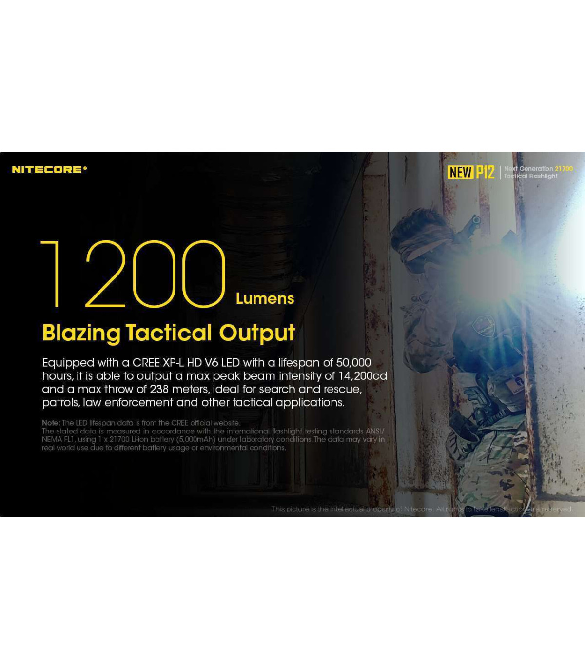 The next generation NEW P12 is the latest upgrade to the classic tactical flashlight NITECORE P12. Triple the runtime, 20% brighter, yet still compact and easy to carry, the NEW P12 ticks all the boxes. Its 1200 lumen max output has 260 yards of beam throw. The NEW P12 is great for any situation with four brightness modes as well as strobe, beacon, and SOS for emergencies and tactical situations. Enjoy simple operation with a tactical tail switch capable of momentary or constant-on, and an easy to reach side switch for mode selection.