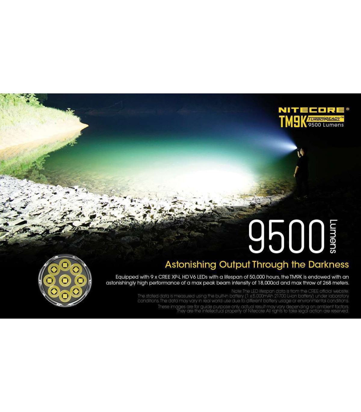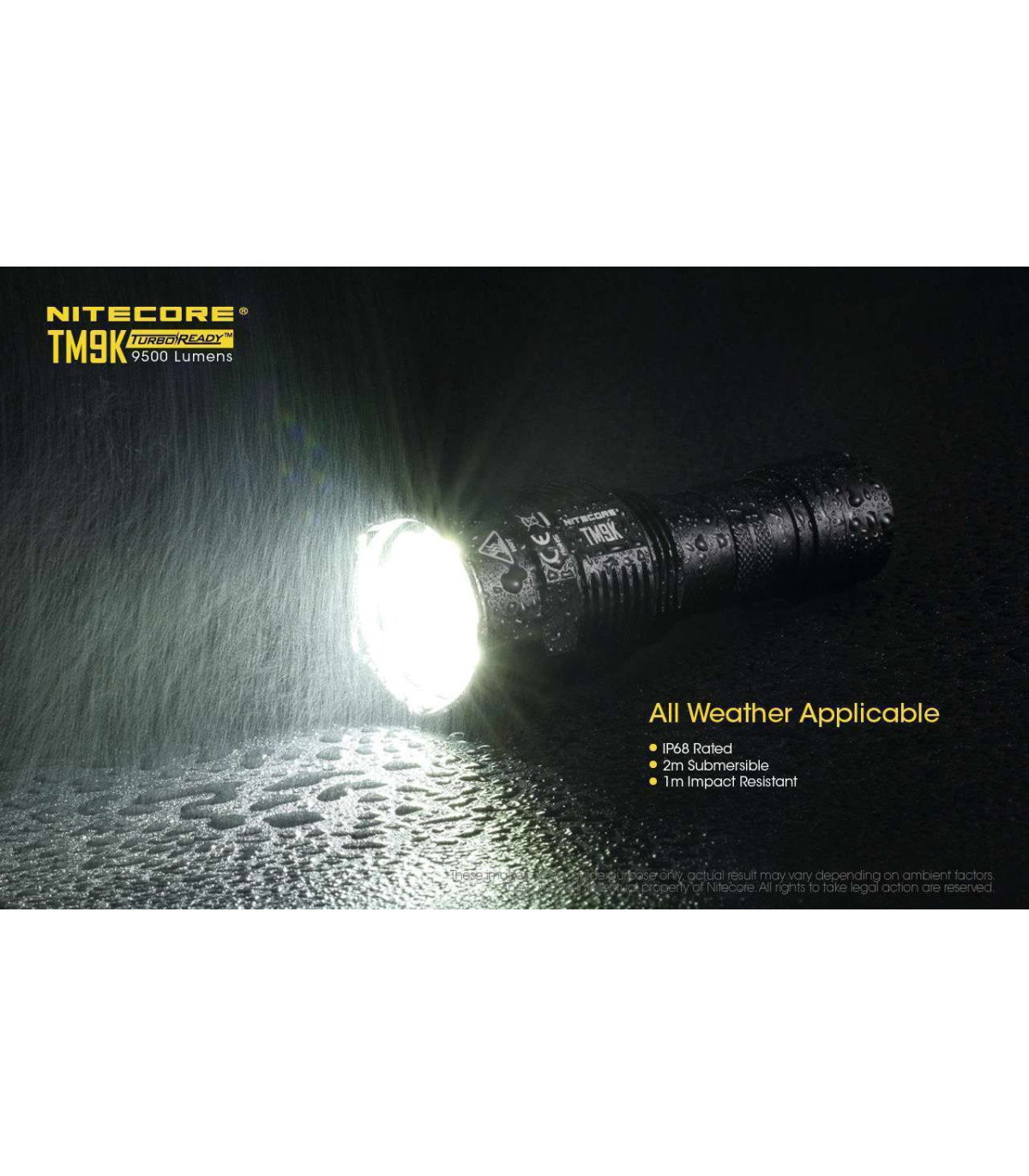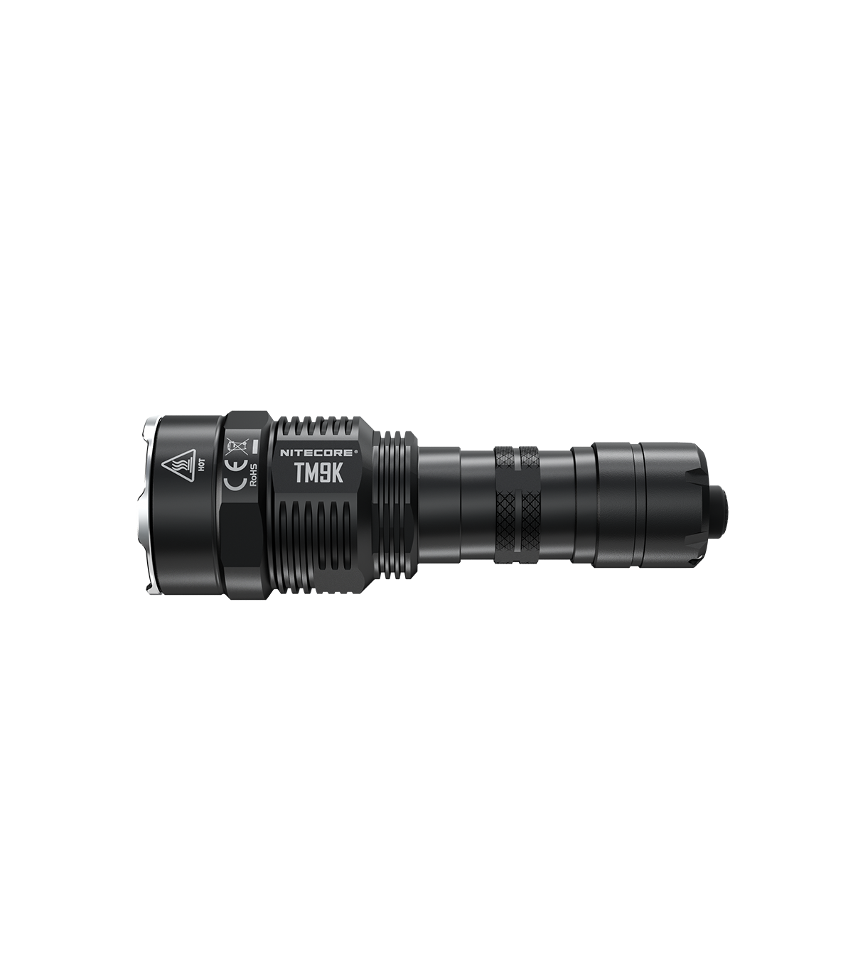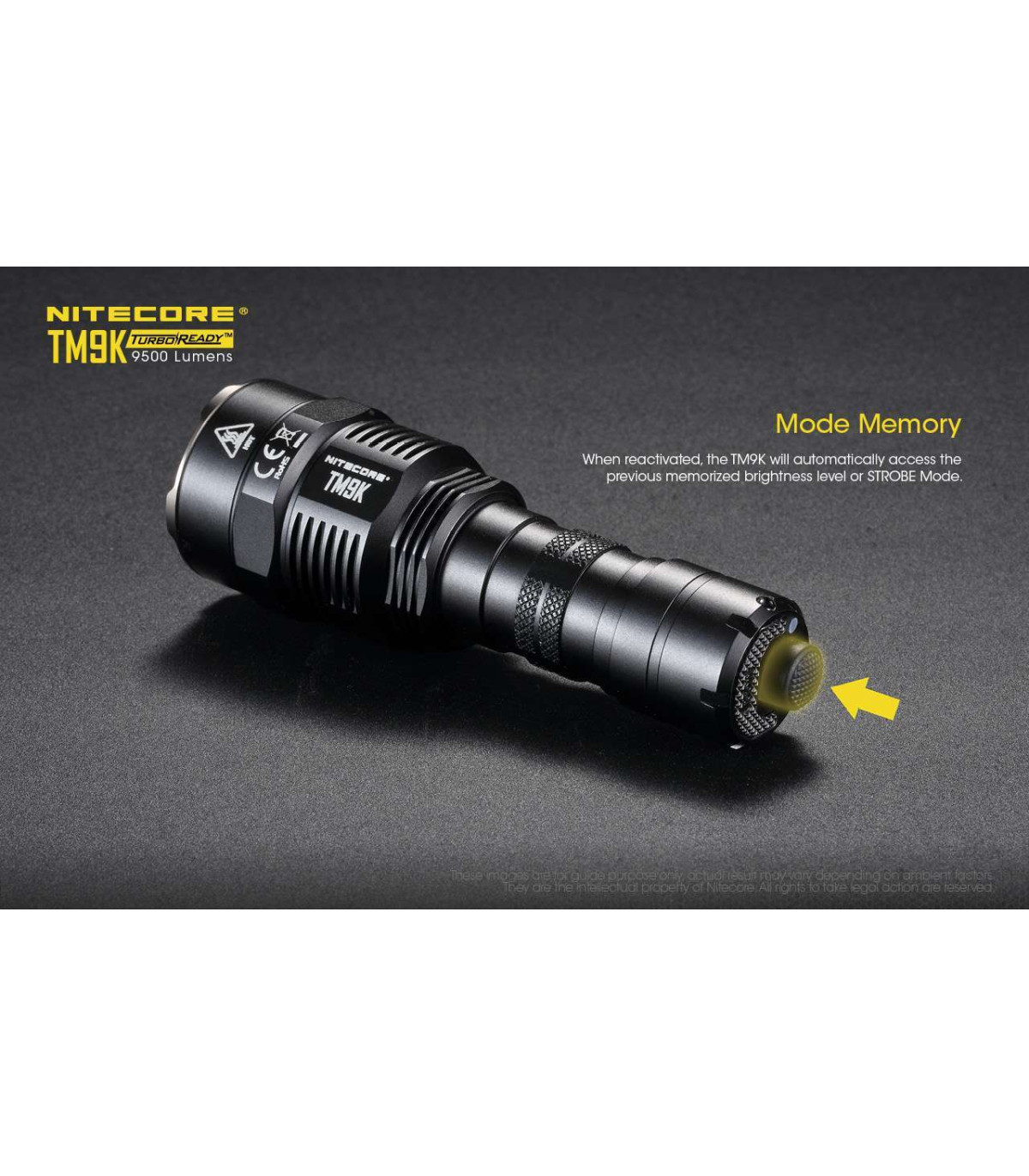 The NITECORE TM9K is the ultimate rechargeable flashlight putting 9500 lumens at your fingertips. Access instant 9500 lumen turbo with one touch of the mode switch that reaches over 293 yards of throw or double tap for blinding tactical strobe. A true tiny monster all this power fits in an aluminum unibody frame that is under five inches in length. With the included metal pocket clip and holster, the TM9K is easy to carry at just over seven ounces.