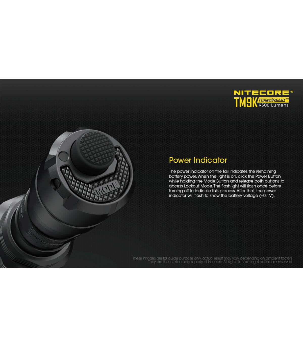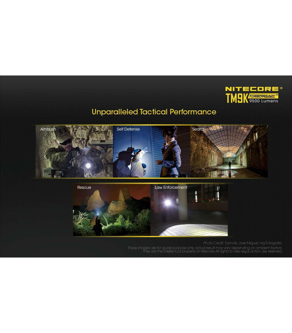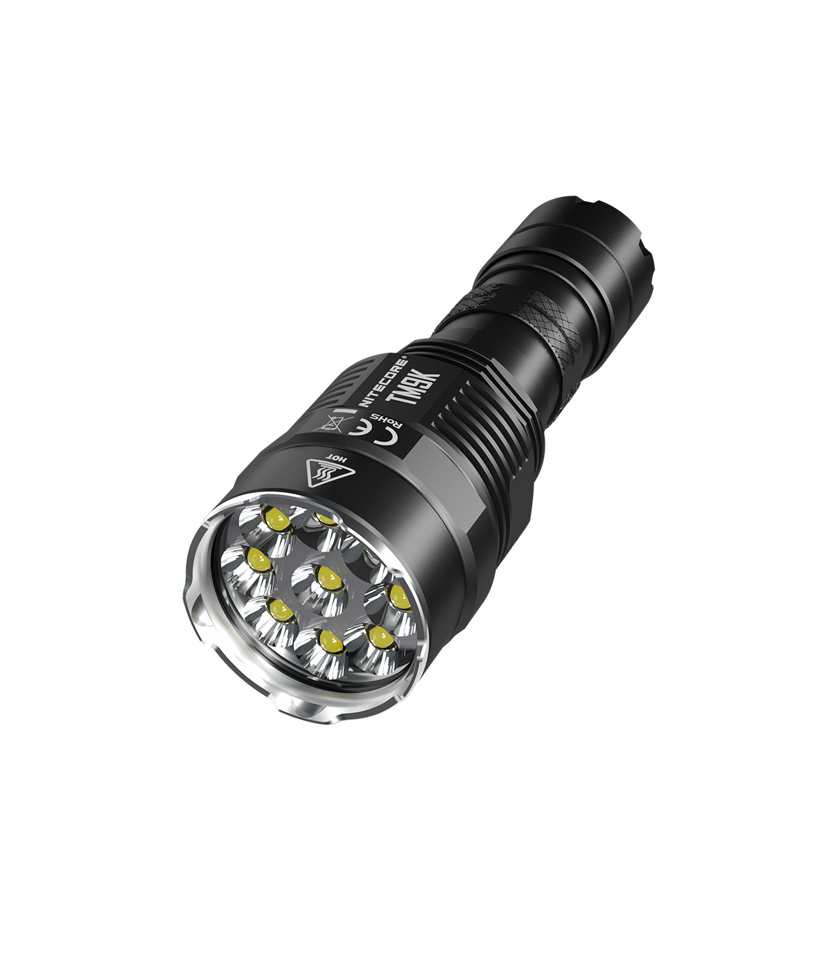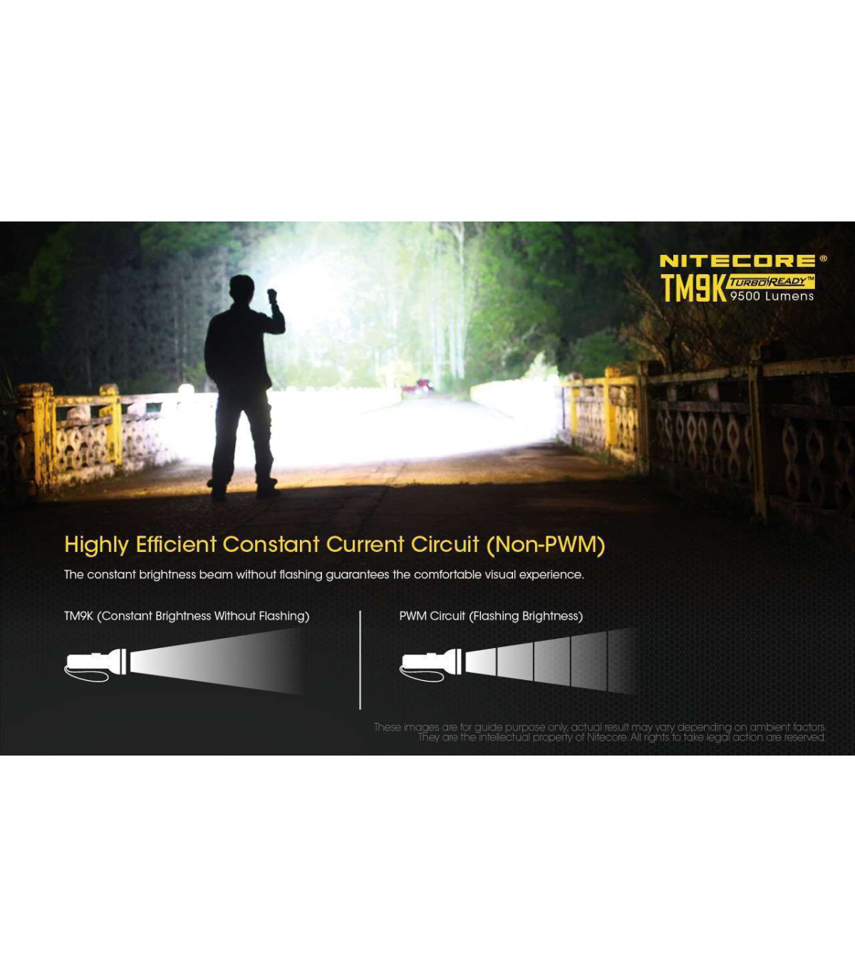 The NITECORE TM9K is the ultimate rechargeable flashlight putting 9500 lumens at your fingertips. Access instant 9500 lumen turbo with one touch of the mode switch that reaches over 293 yards of throw or double tap for blinding tactical strobe. A true tiny monster all this power fits in an aluminum unibody frame that is under five inches in length. With the included metal pocket clip and holster, the TM9K is easy to carry at just over seven ounces.