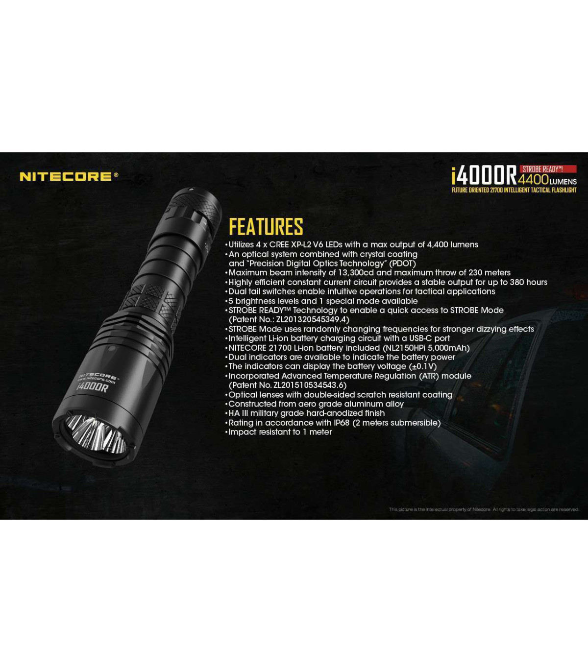 Made with law enforcement and military personnel in mind, the NITECORE i4000R draws on the latest technology to deliver an impressive 4400 lumen max output at 251 yards of reach. Enjoy single-handed operation with dual tail switches capable of momentary access and quick access to turbo and strobe. Press and hold the mode switch to access the strobe. Easily cycle through 4 brightness levels by short pressing the mode button while the light is on. Mode memory ensures that the same output is activated without surprise when the flashlight is turned back on.