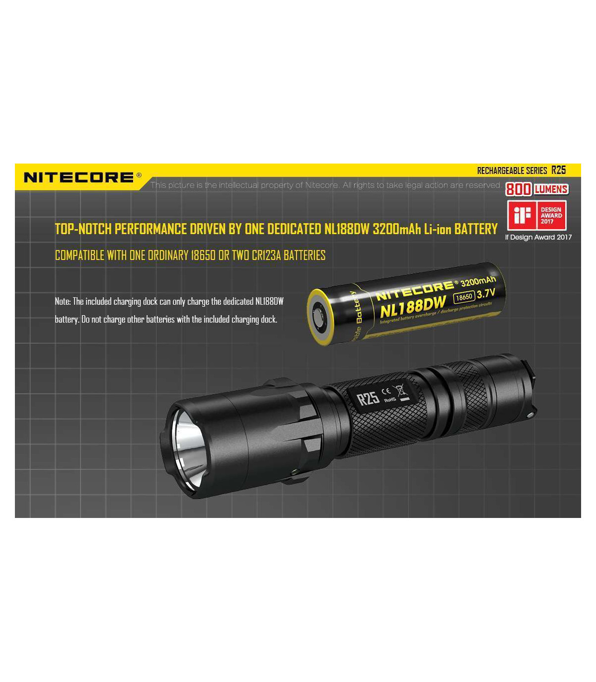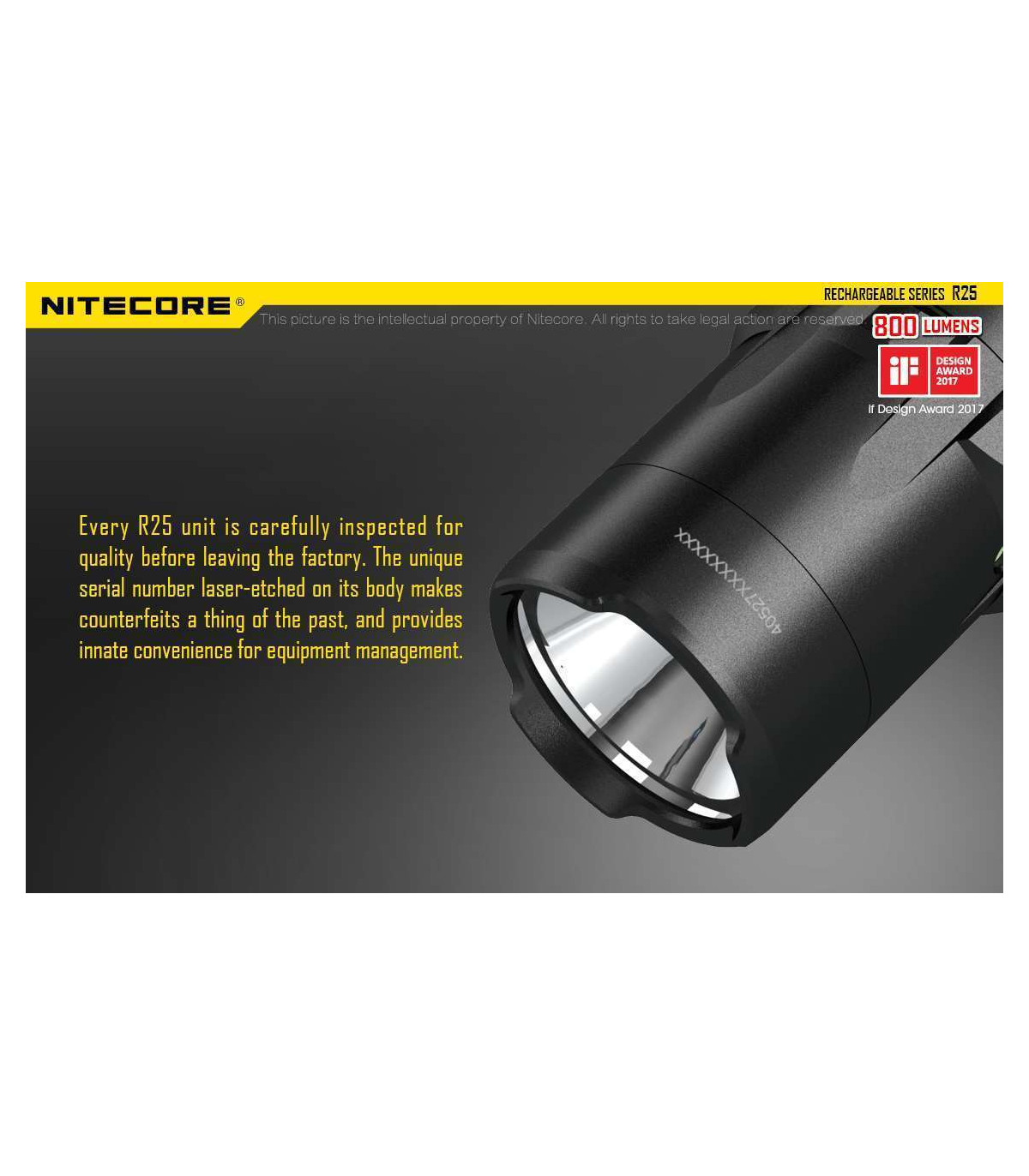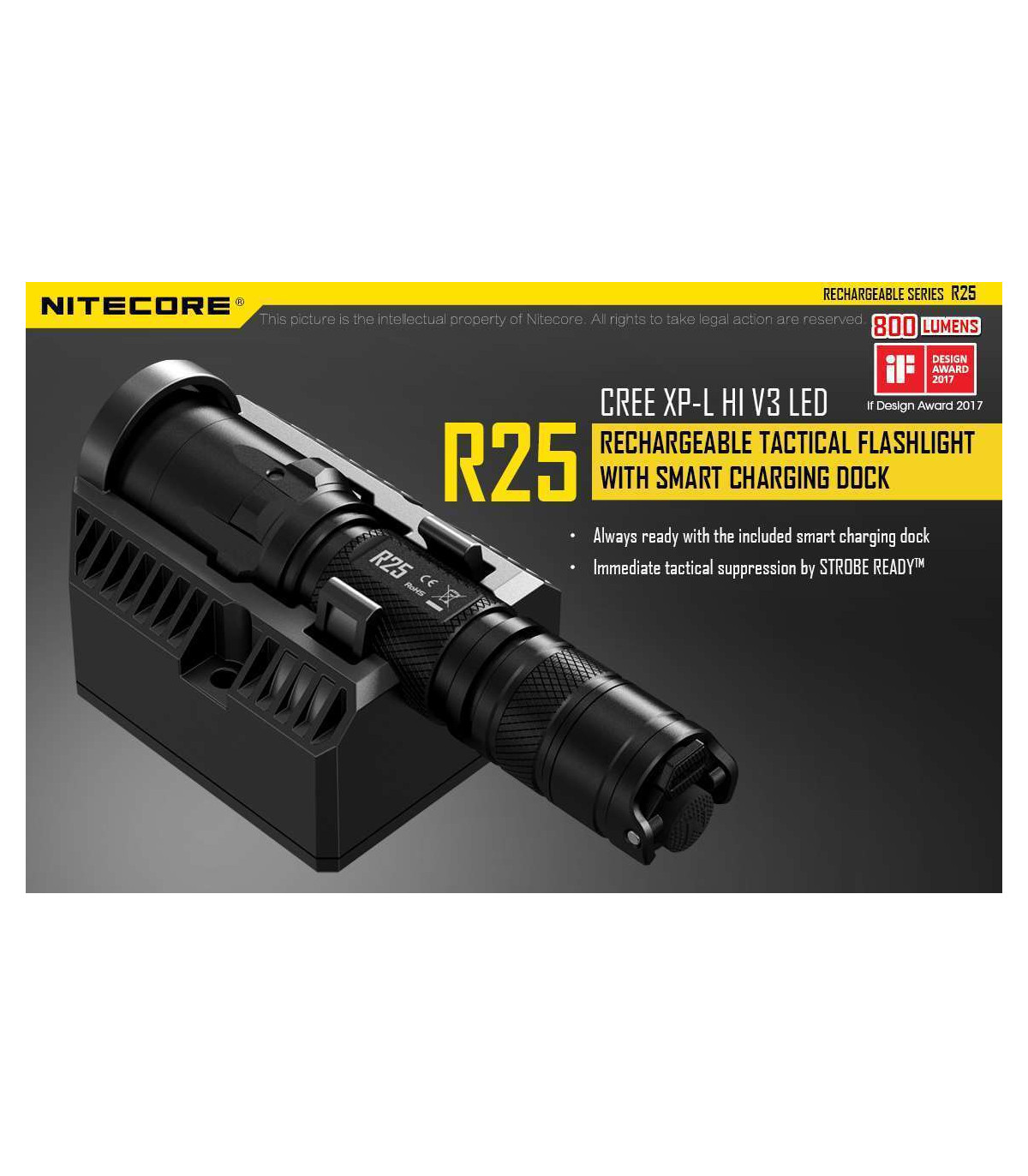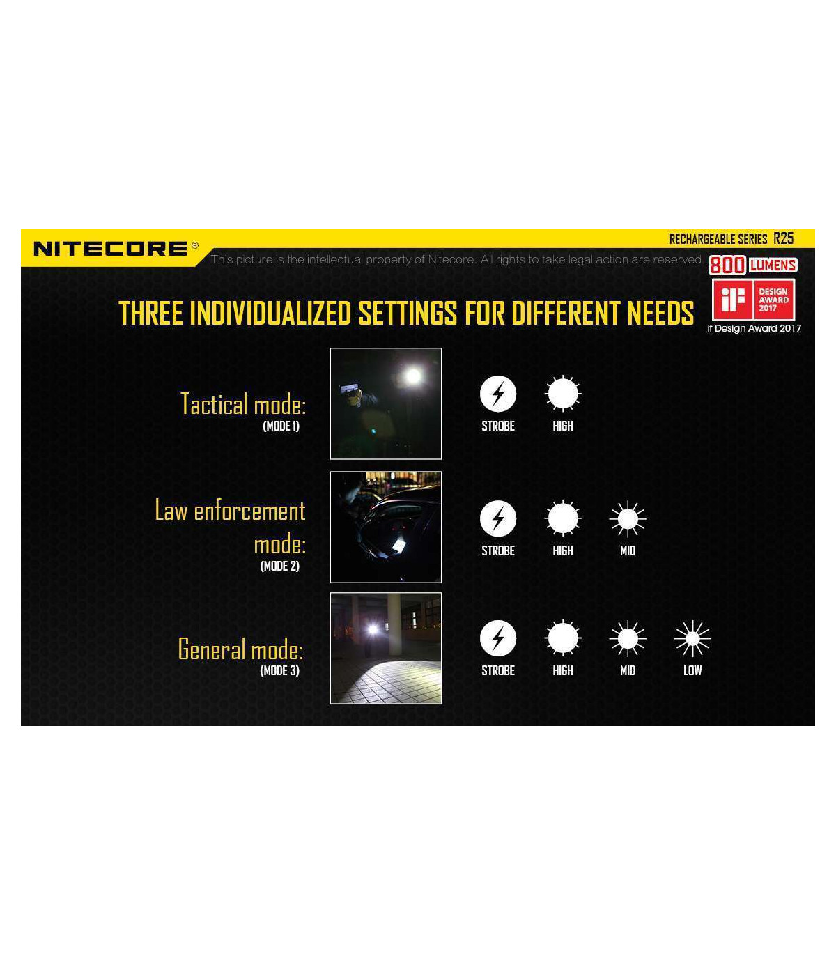 The Nitecore R25 is the first light released in Nitecore's new Rechargeable series and comes with everything you need to get up and running with your new light. Designed for law enforcement and security agencies, this 800 max lumens light has three modes to customize your light to any task.