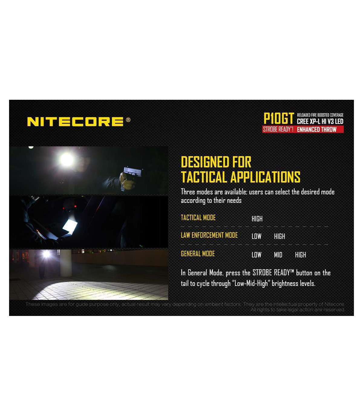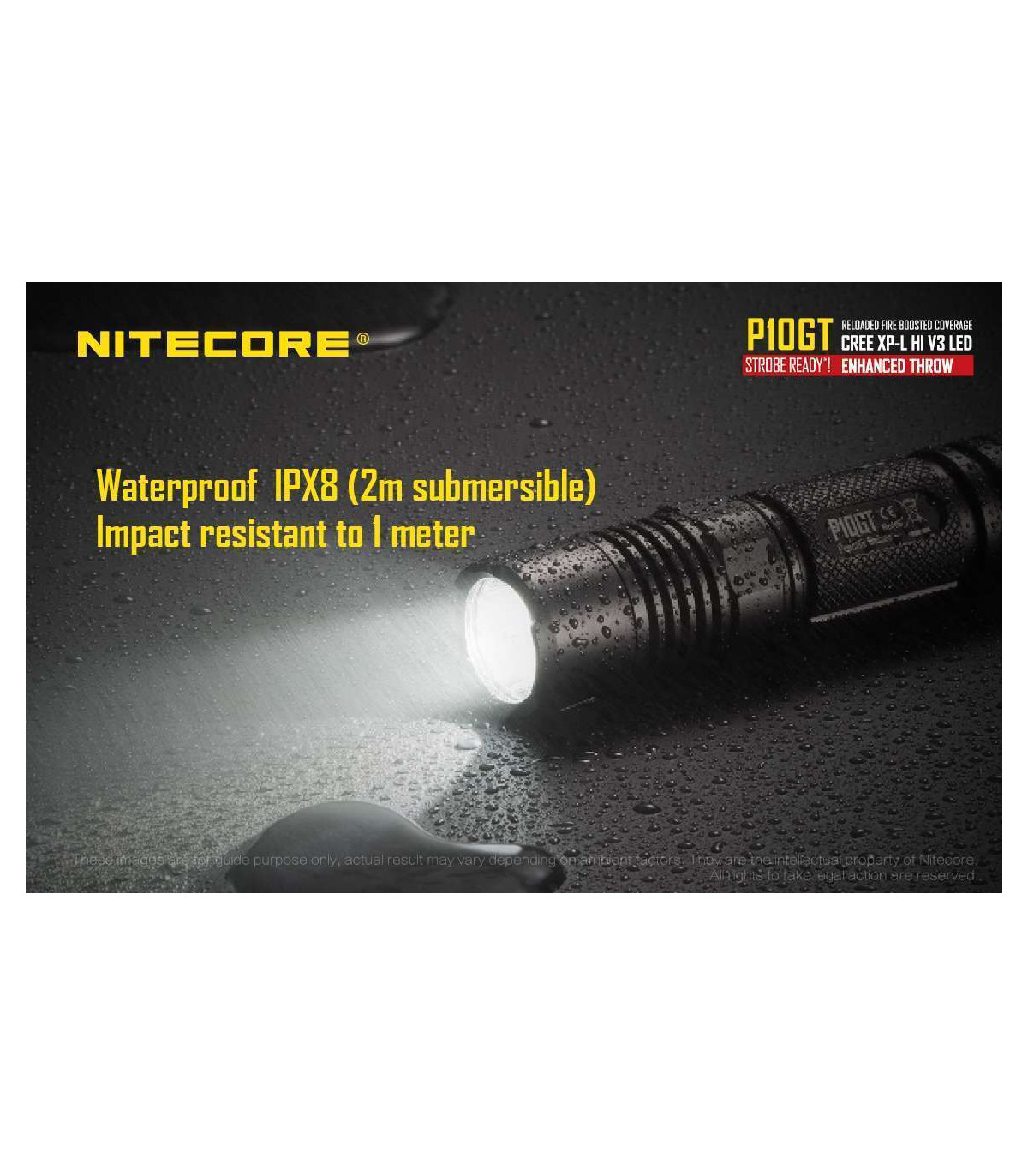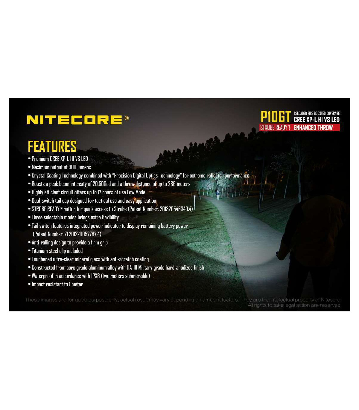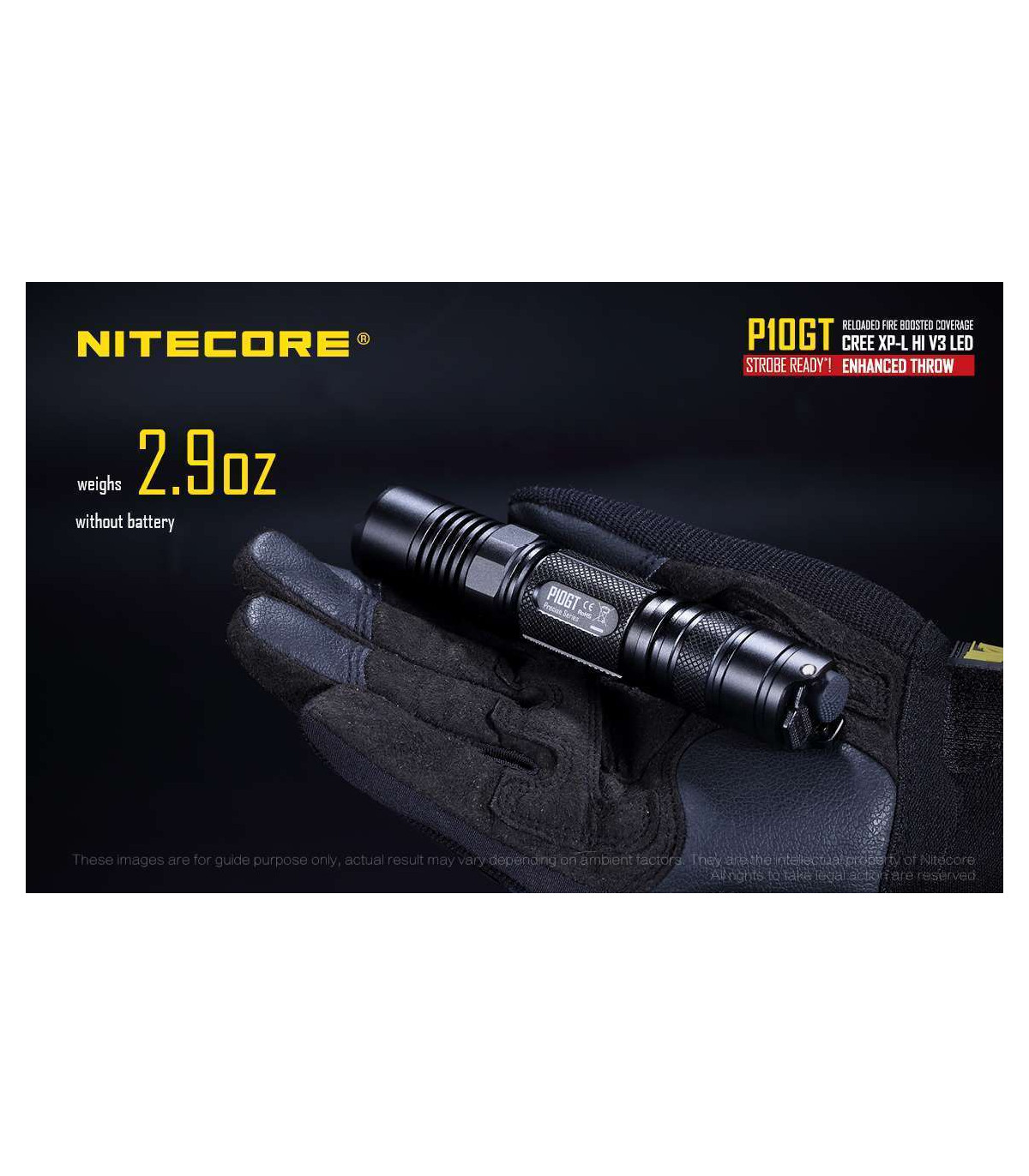 The Nitecore P10GT is the new and improved P10. This high performance tactical flashlight now utilizes a CREE XP-L HI V3 LED and offers up to 900 lumens of light and 312 yards throw. Weapon mountable, this flashlight is ideal for law enforcement, hunting and tactical uses.
