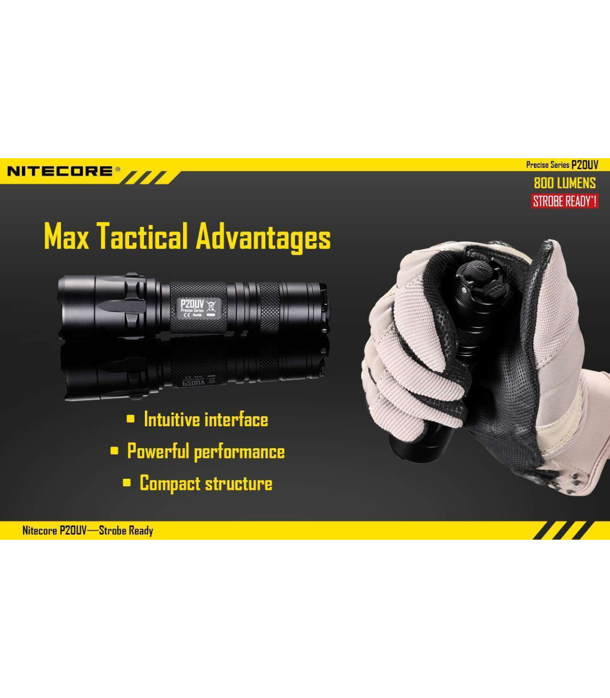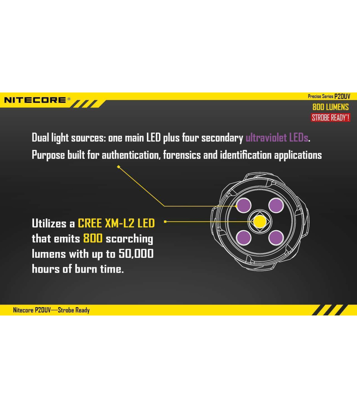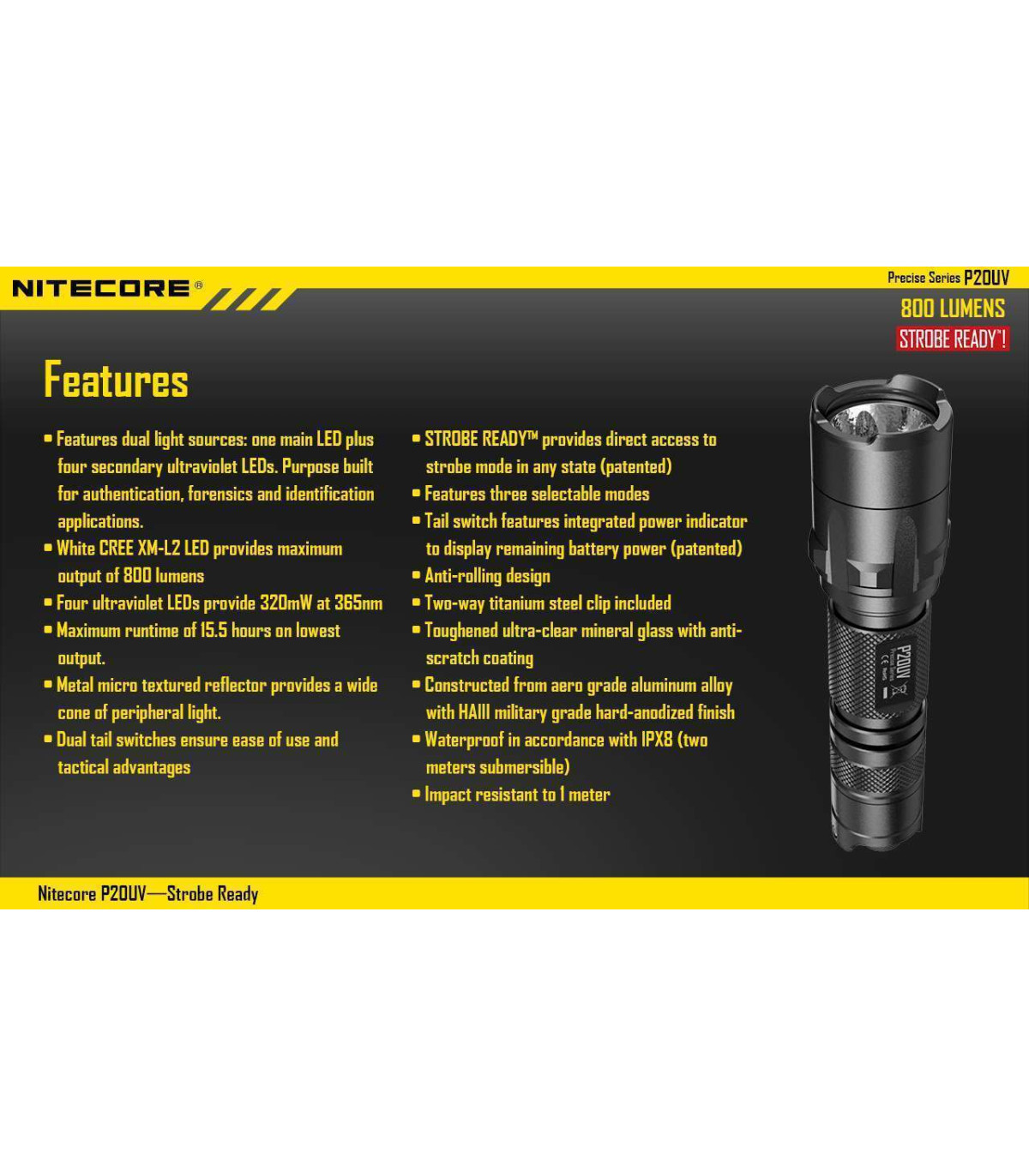 The Nitecore P20UV is a powerful, compact flashlight that can produce an impressive 800 lumens. The light also has two innovative features designed with law enforcement in mind including a direct access to strobe function and UV black light useful for forensic analysis.