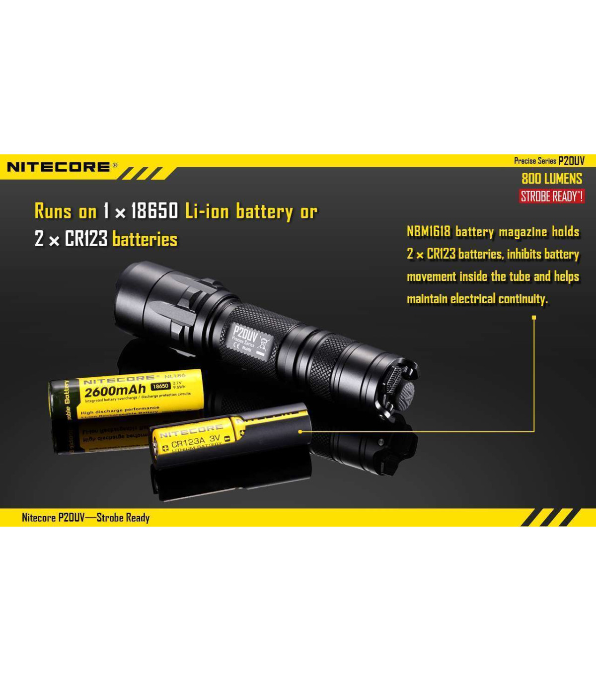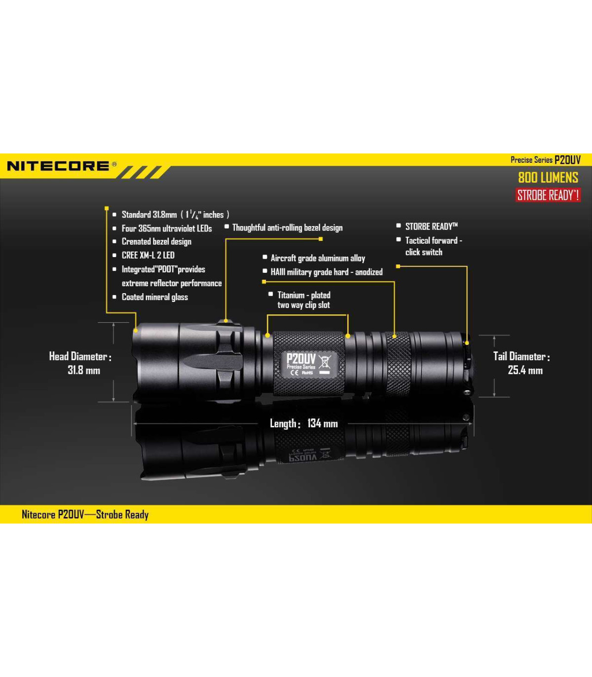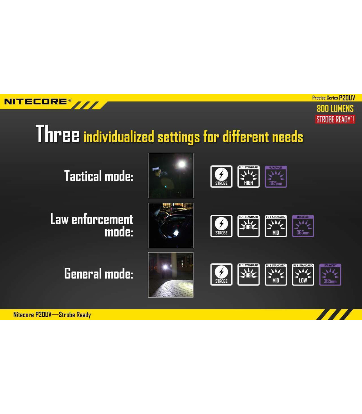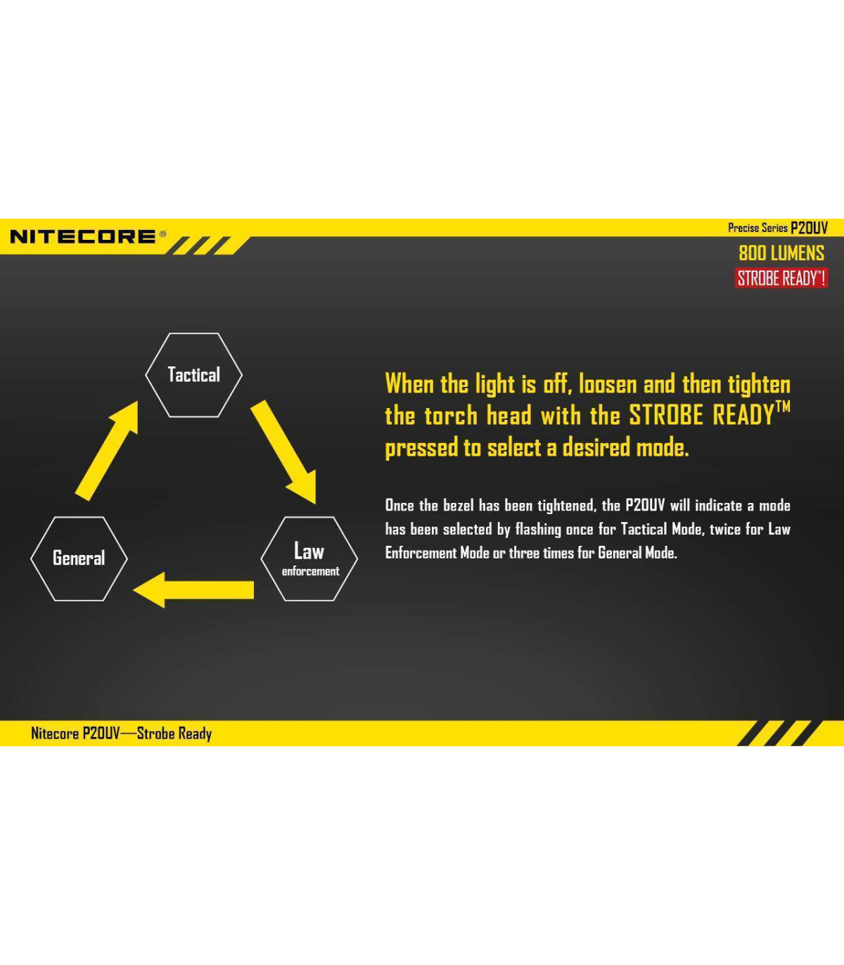 The Nitecore P20UV is a powerful, compact flashlight that can produce an impressive 800 lumens. The light also has two innovative features designed with law enforcement in mind including a direct access to strobe function and UV black light useful for forensic analysis.