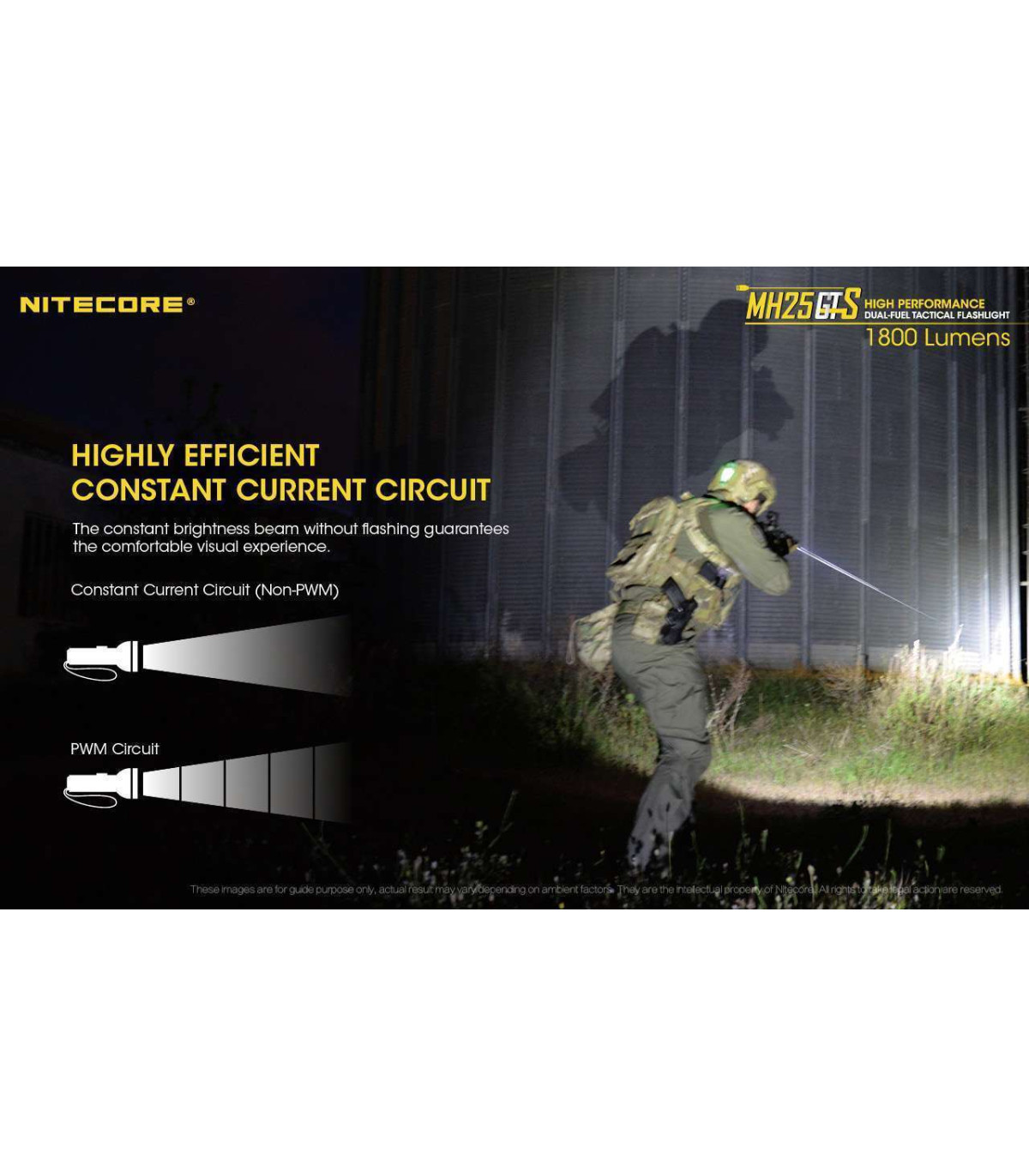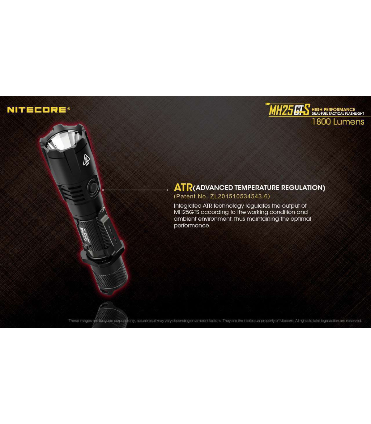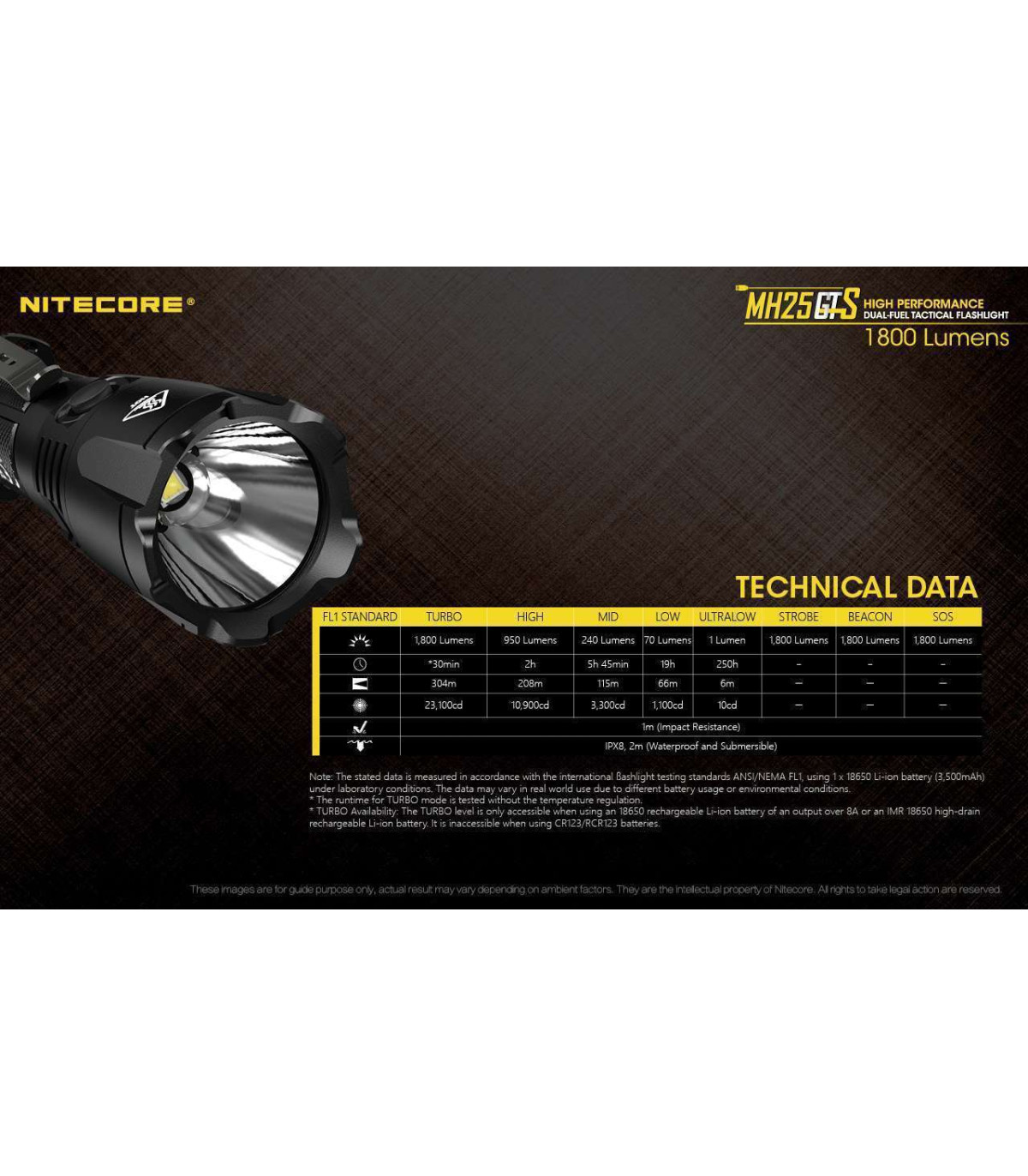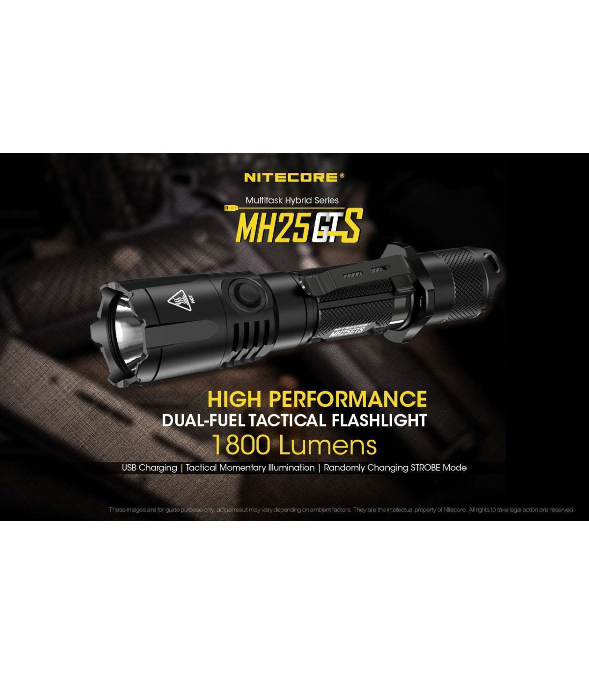 The Nitecore MH25GTS is the 1800 lumen upgrade to the MH25GT and features a new bezel design, metal side switch for mode adjustment and a double-waterproof tail cap design. This USB rechargeable tactical is an excellent choice for hunting, military, law enforcement, survival, outdoors and mountaineering.