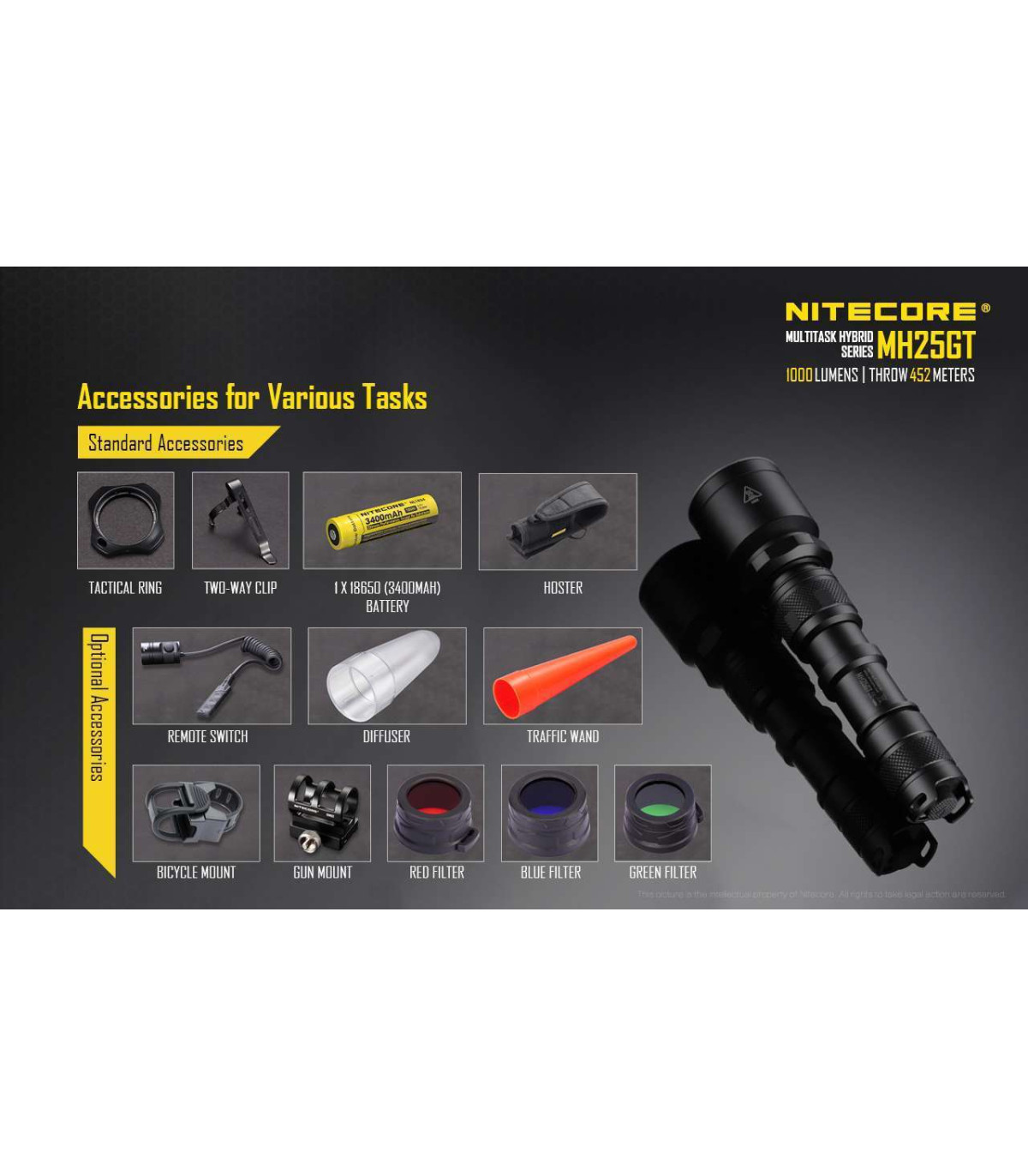The Nitecore MH25GT is a major upgrade to the tried and true Nitecore MH25 flashlight. Newly equipped with a CREE XP-L HI V3 LED, the MH25GT produces a powerful 1000 lumens of brightness. The elongated reflector enables this light to reach an impressive beam distance of up to 494 yards. This combined with the included high capacity 18650 battery and on-board USB charging feature make this rechargeable flashlight both powerful and convenient with an extended battery runtime. Great for tactical purposes or outdoor excursions such as camping, hiking, or caving, this light is sure to go the distance!
