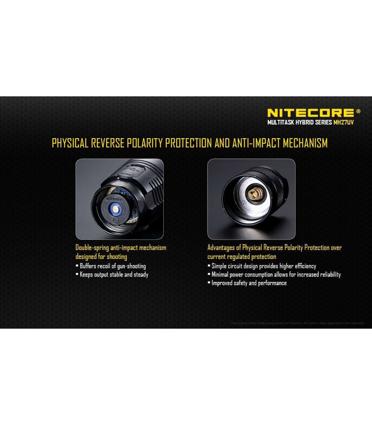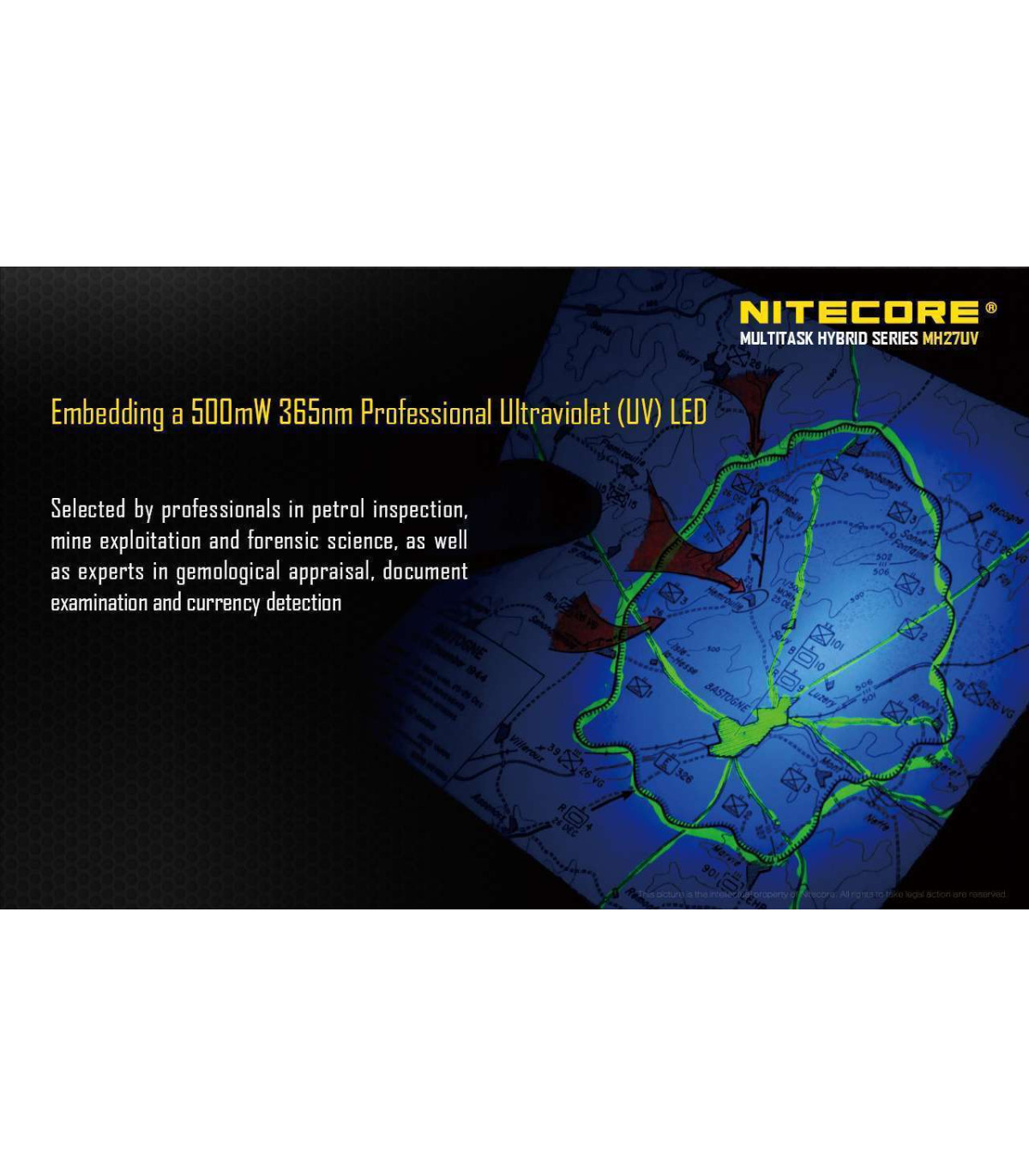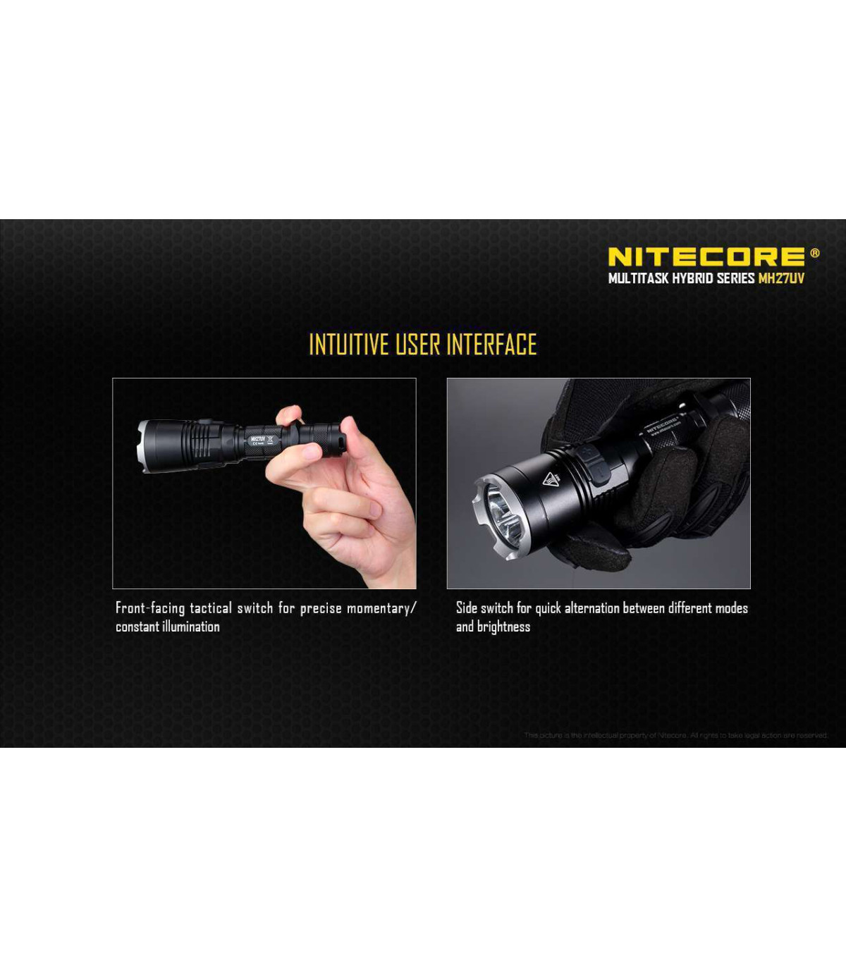 Modeled after the Red Dot Award winning Nitecore MH27, the MH27UV is an incredibly versatile, multi-purpose tool. With a Cree XP-L LED capable of throwing a beam up to a whopping 505 yards, offering up to 1000 lumens of brightness at your fingertips across four output levels, five special modes, and three constant colored lights of red, blue, and ultraviolet. The UV light can be used for a variety of applications such as verifying IDs or money. The red LED offers a low-level tactical illumination while allowing you to preserve your night vision. The blue light can be used in hunting capacities to track blood trails and is well-suited for foggy nights. Turn on the light with the tactical tail cap switch and cycle through the modes with easy-to-use dual-button side switches. The MH27UV also features a USB charging port to quickly and conveniently charge the single 18650 battery the light runs on. It can also run on 2 x CR123A batteries. Keep track of your 18650's charging status and remaining voltage via the blue light integrated into the light's side switches. Weighing in at just six ounces, this compact tactical light can be taken anywhere in your backpack or pocket. It is perfect for law enforcement, hunting, and tactical operations.