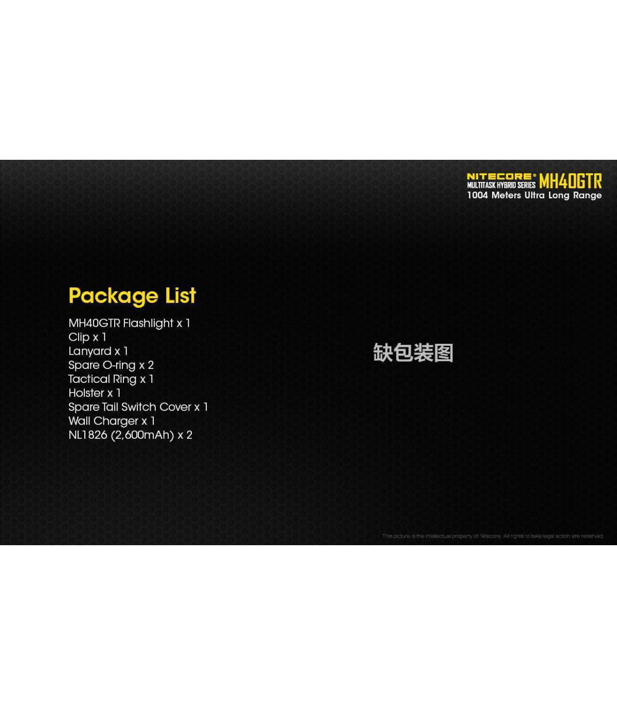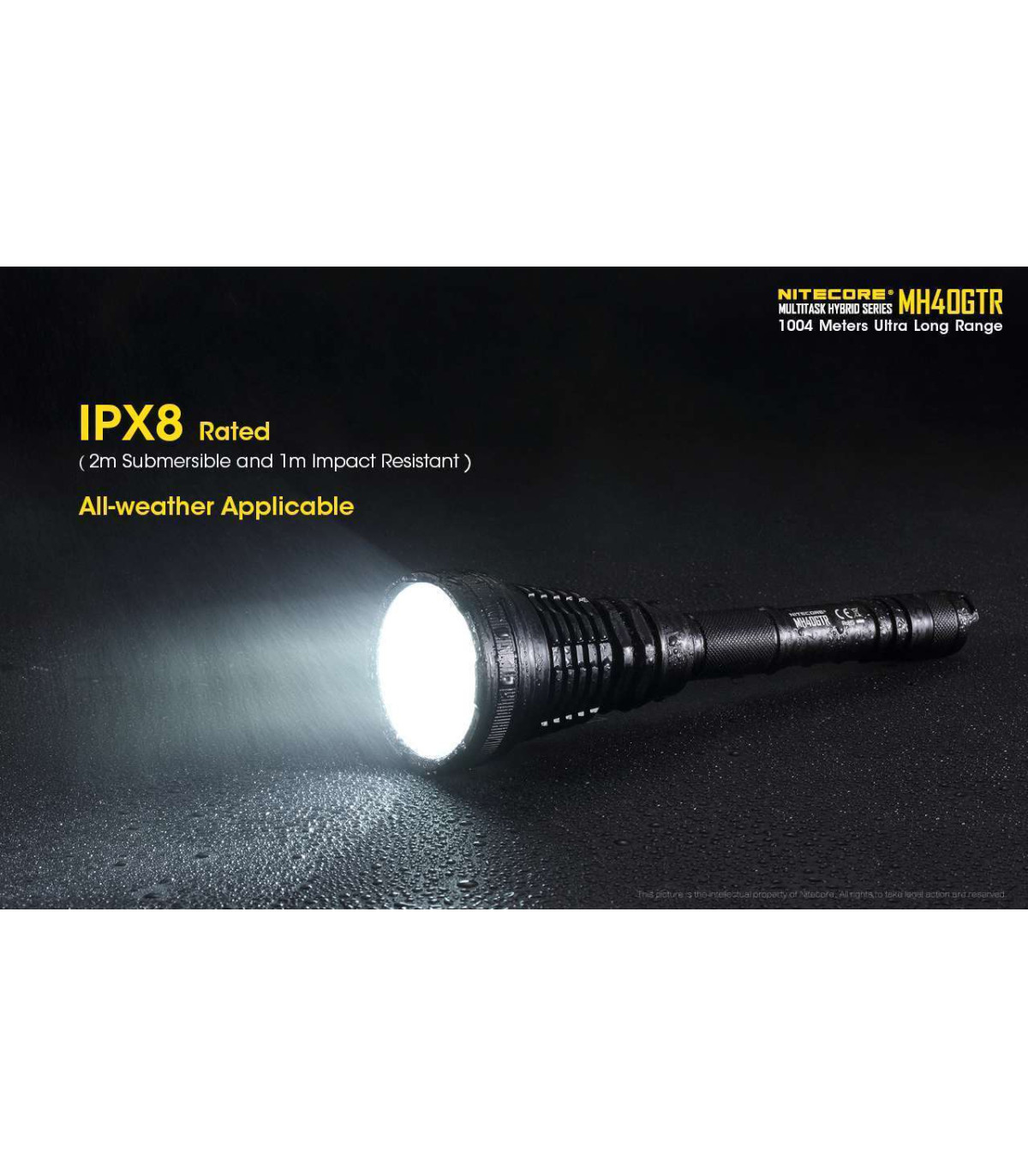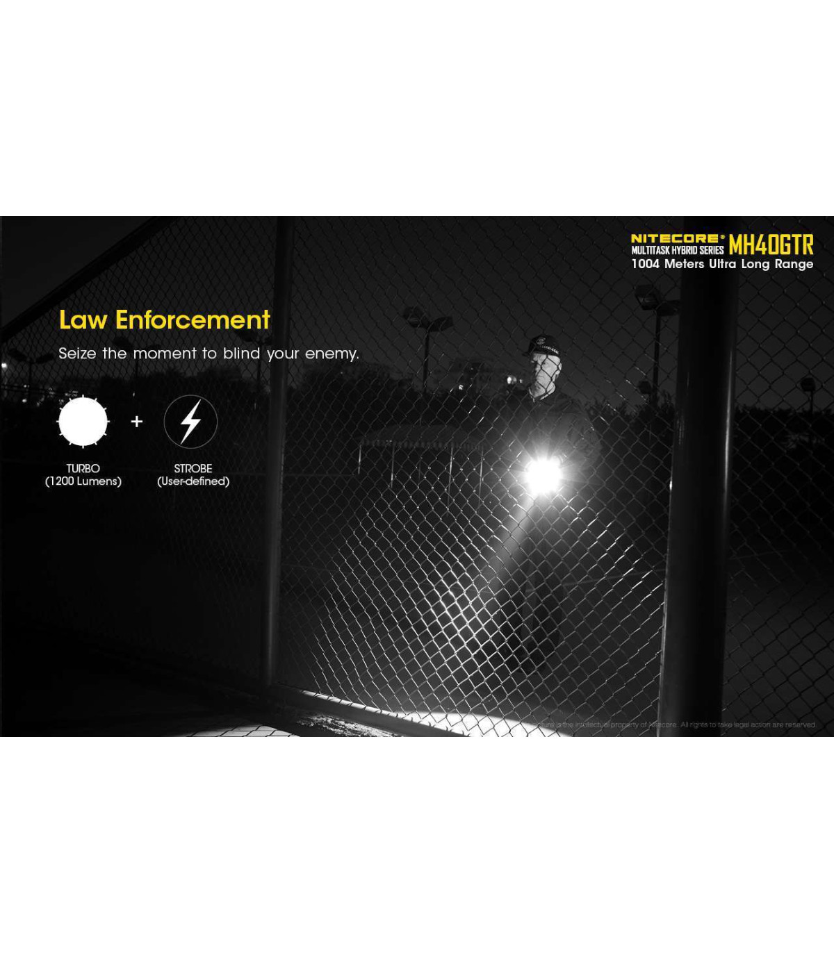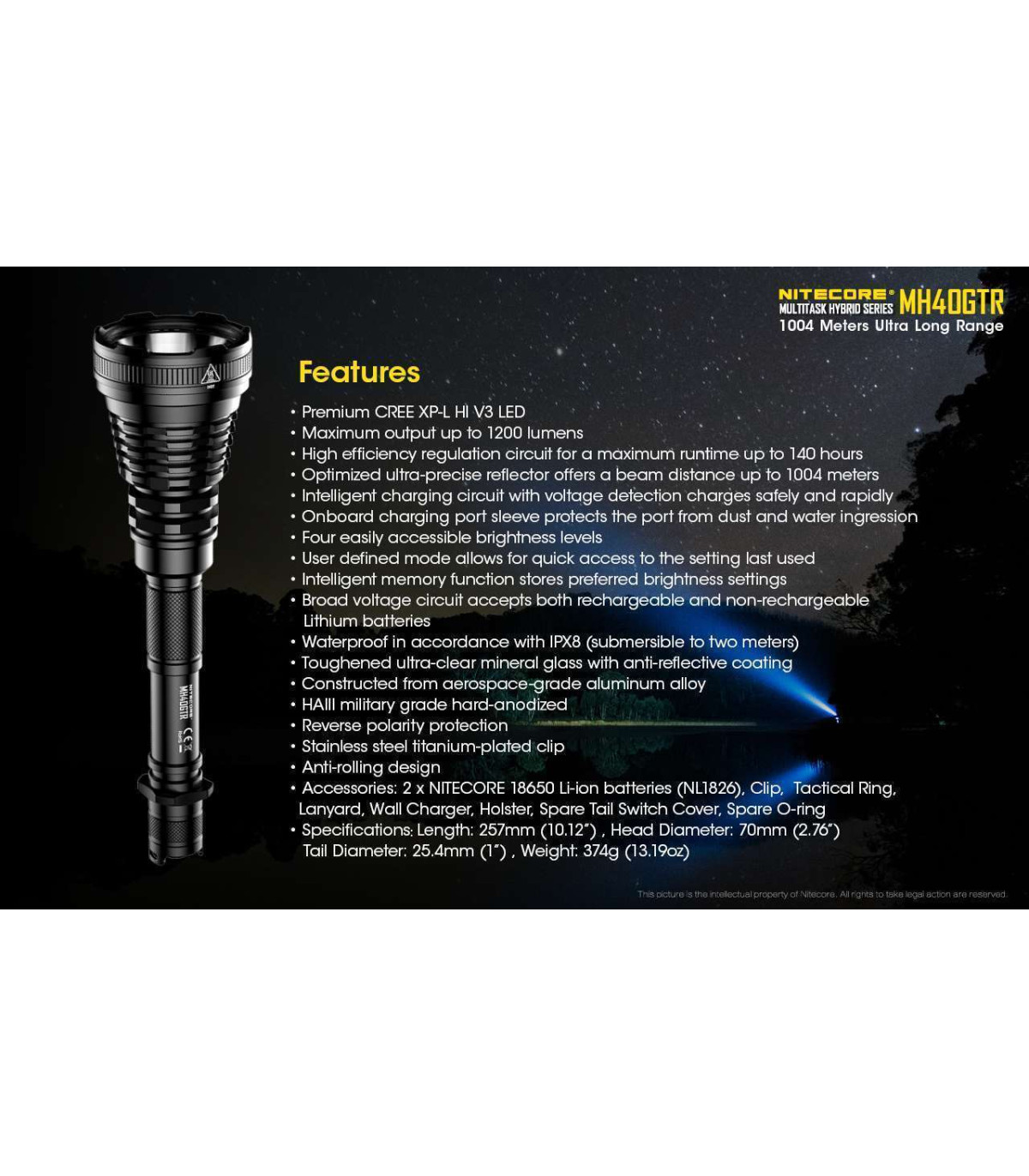 Ο NITECORE MH40GTR είναι ένας πολύ ισχυρός και ευέλικτος φακός, σχεδιασμένος για επαγγελματική χρήση αλλά και για απαιτητικές περιπέτειες. Διαθέτει LED CREE XP-L Hi V3, το οποίο παρέχει φωτεινότητα έως 1200 lumens. Ο ανακλαστήρας υψηλής ακρίβειας επιτρέπει δέσμη φωτός που φτάνει σε απόσταση έως 1004 μέτρα.