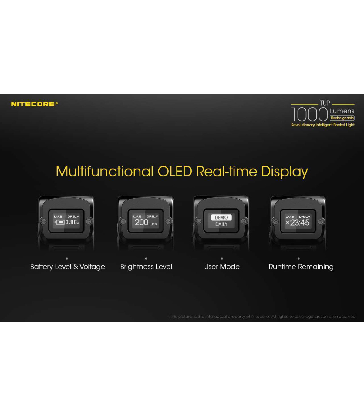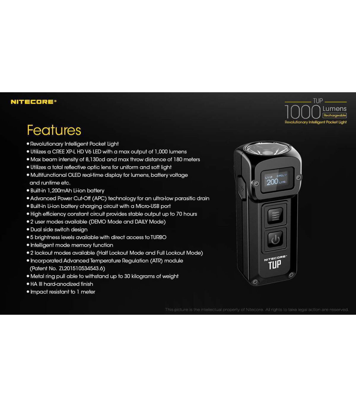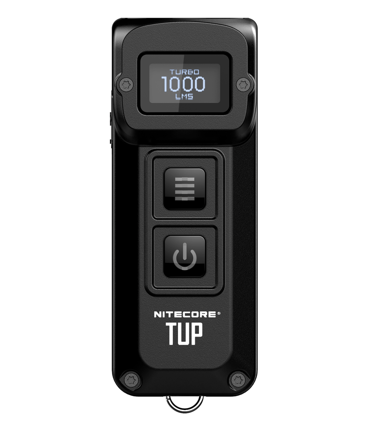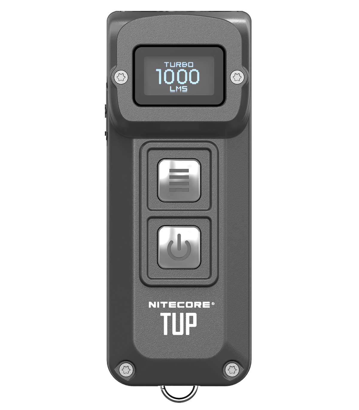 Nitecore is revolutionizing the everyday carry gear by packing more technology and power into its new pocket flashlight. The Nitecore TUP delivers a super bright 1000 lumen beam with distances up to 197 yards yet still fits comfortably in your pocket. With its dual side switches, the TUP allows users to quickly switch between 5 brightness levels with a direct access to Turbo. The TUP’s Daily Mode provides constant illumination for long time use, while the Demo Mode powers off after 30 seconds of no operation to conserve the battery. Easily switch between two modes by pressing both the power and mode button simultaneously. The TUP showcases an OLED display providing key information including brightness level, mode, lumen, battery voltage, runtime and lockout status. USB rechargeable with a 1200mAh li-ion battery allows this powerful keychain flashlight to reach a maximum runtime of 70 hours on a single charge. The TUP’s technology prevents accidental activation with a full lockout mode that disables both the power and mode button. Its unique half lockout mode only allows access to Turbo and is activated by holding the mode button. To unlock the flashlight, recharge or long press the power button until the screen shows an unlock icon.