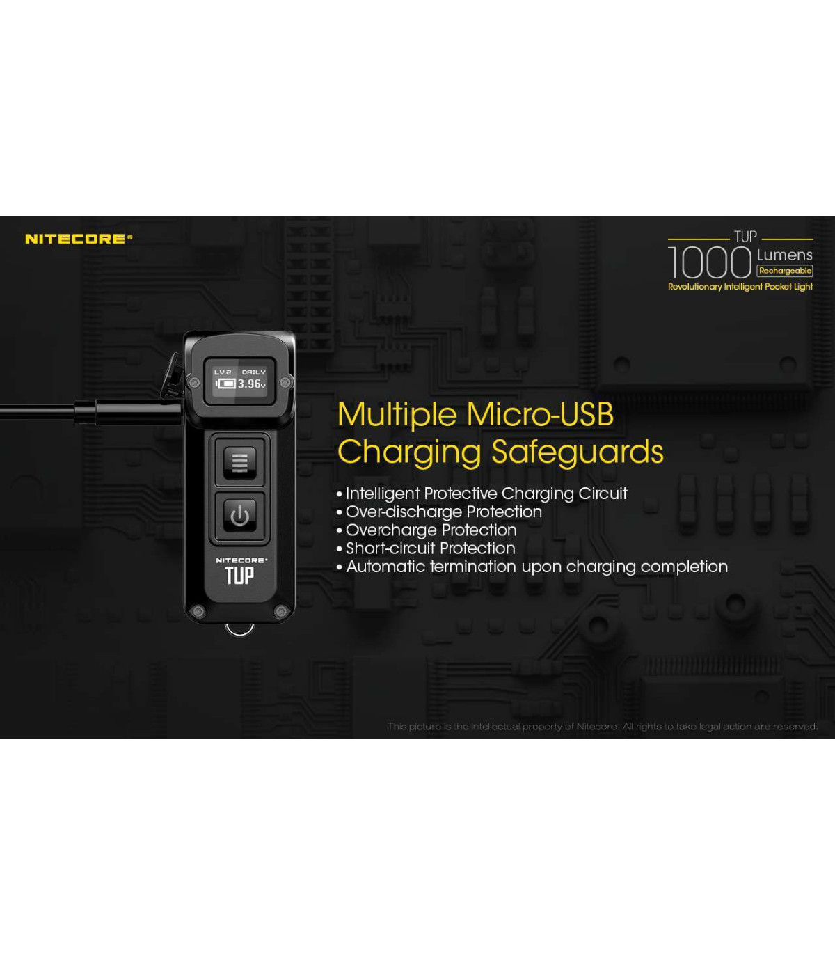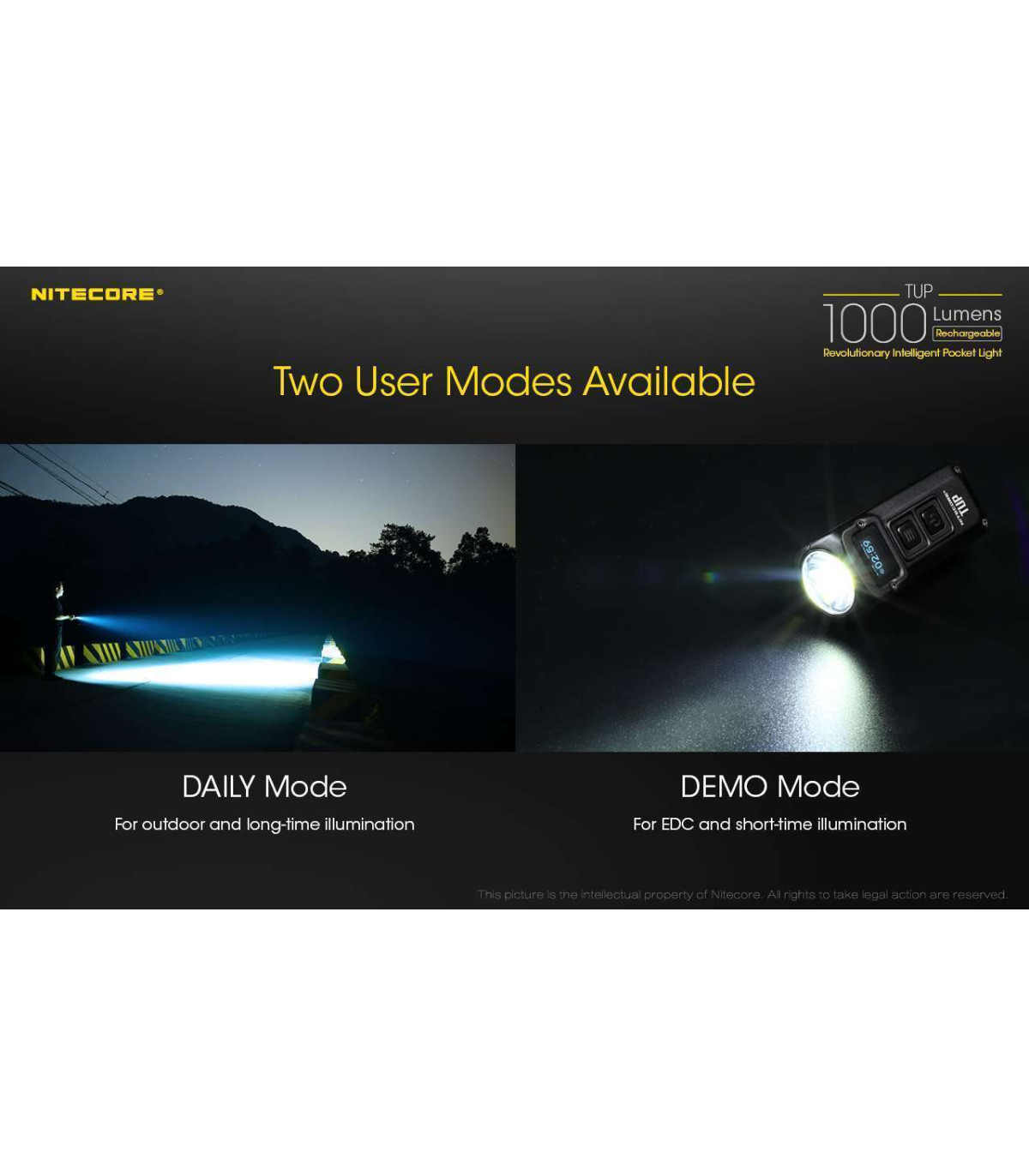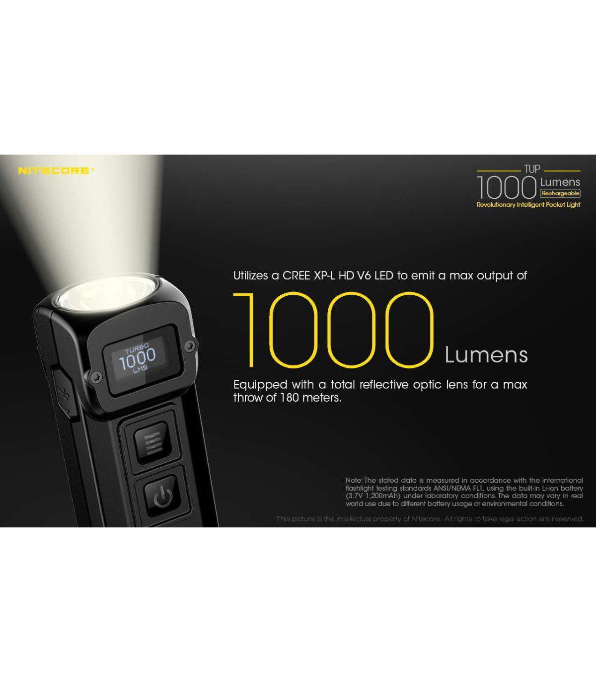 Nitecore is revolutionizing the everyday carry gear by packing more technology and power into its new pocket flashlight. The Nitecore TUP delivers a super bright 1000 lumen beam with distances up to 197 yards yet still fits comfortably in your pocket. With its dual side switches, the TUP allows users to quickly switch between 5 brightness levels with a direct access to Turbo. The TUP’s Daily Mode provides constant illumination for long time use, while the Demo Mode powers off after 30 seconds of no operation to conserve the battery. Easily switch between two modes by pressing both the power and mode button simultaneously. The TUP showcases an OLED display providing key information including brightness level, mode, lumen, battery voltage, runtime and lockout status. USB rechargeable with a 1200mAh li-ion battery allows this powerful keychain flashlight to reach a maximum runtime of 70 hours on a single charge. The TUP’s technology prevents accidental activation with a full lockout mode that disables both the power and mode button. Its unique half lockout mode only allows access to Turbo and is activated by holding the mode button. To unlock the flashlight, recharge or long press the power button until the screen shows an unlock icon.