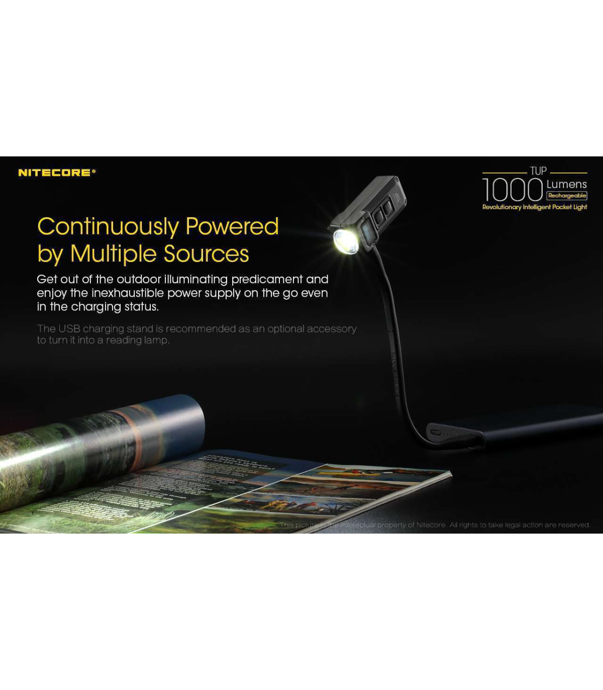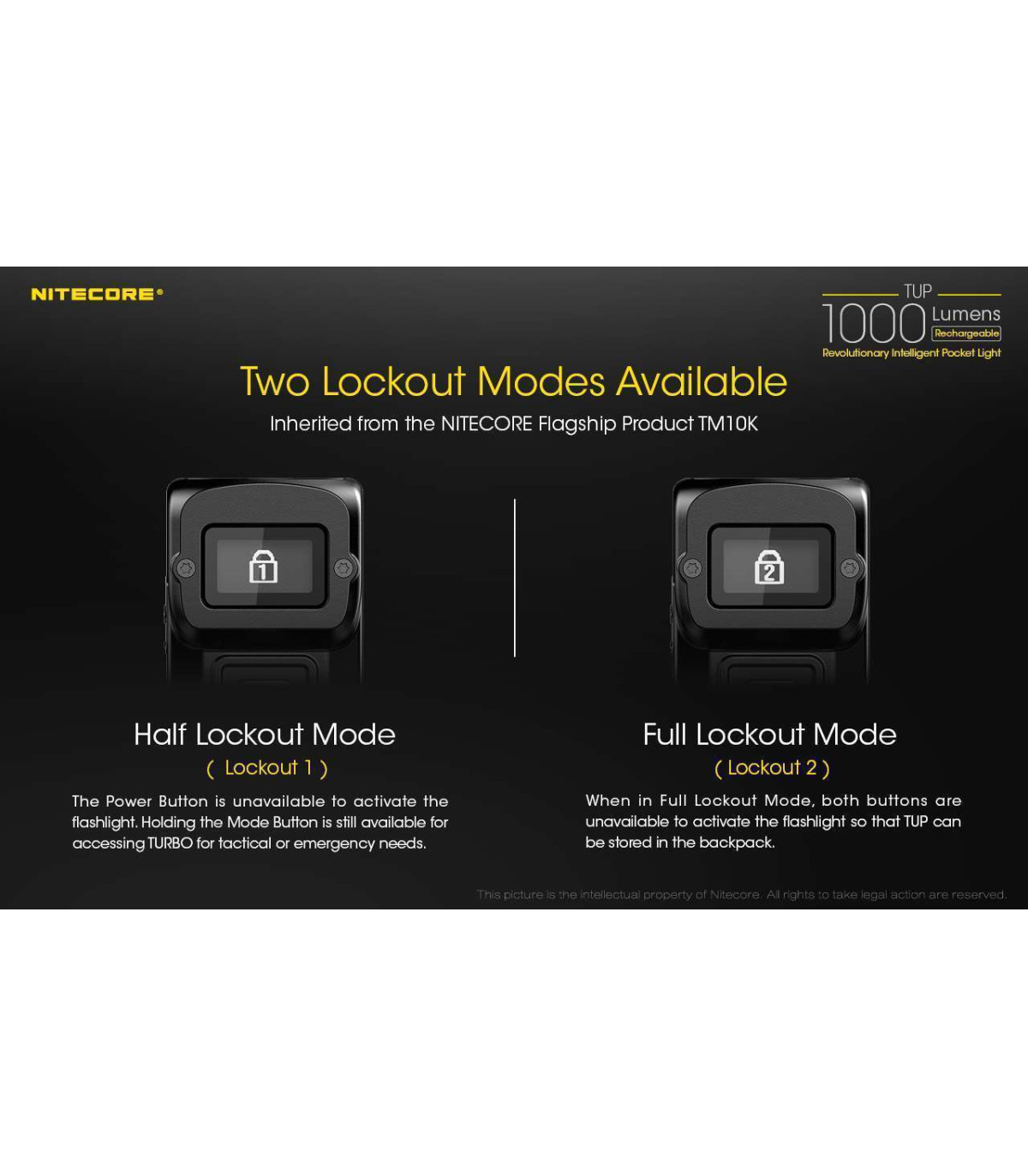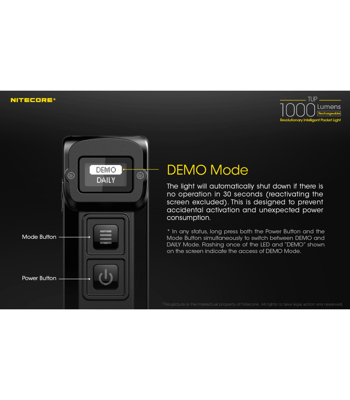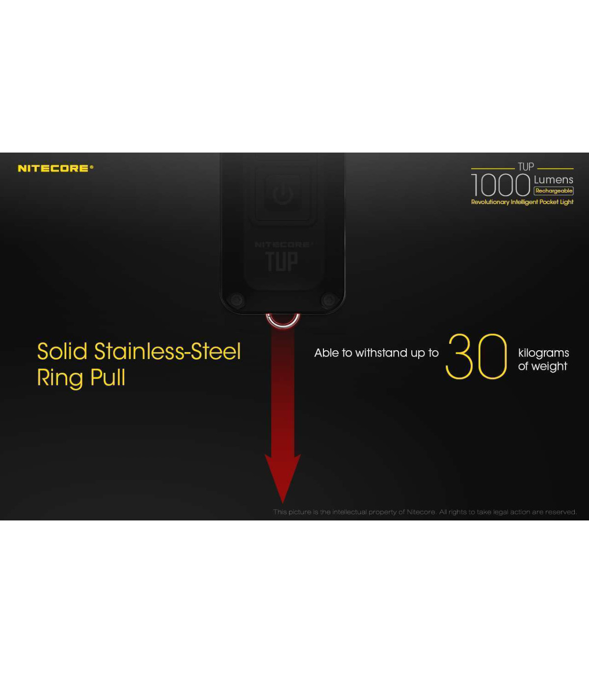 Nitecore is revolutionizing the everyday carry gear by packing more technology and power into its new pocket flashlight. The Nitecore TUP delivers a super bright 1000 lumen beam with distances up to 197 yards yet still fits comfortably in your pocket. With its dual side switches, the TUP allows users to quickly switch between 5 brightness levels with a direct access to Turbo. The TUP’s Daily Mode provides constant illumination for long time use, while the Demo Mode powers off after 30 seconds of no operation to conserve the battery. Easily switch between two modes by pressing both the power and mode button simultaneously. The TUP showcases an OLED display providing key information including brightness level, mode, lumen, battery voltage, runtime and lockout status. USB rechargeable with a 1200mAh li-ion battery allows this powerful keychain flashlight to reach a maximum runtime of 70 hours on a single charge. The TUP’s technology prevents accidental activation with a full lockout mode that disables both the power and mode button. Its unique half lockout mode only allows access to Turbo and is activated by holding the mode button. To unlock the flashlight, recharge or long press the power button until the screen shows an unlock icon.