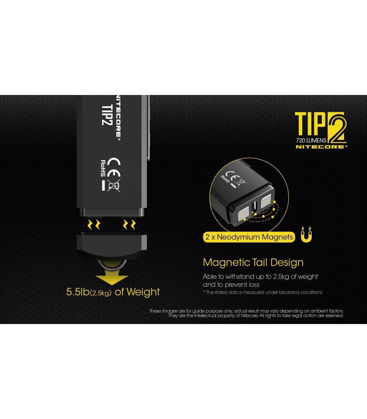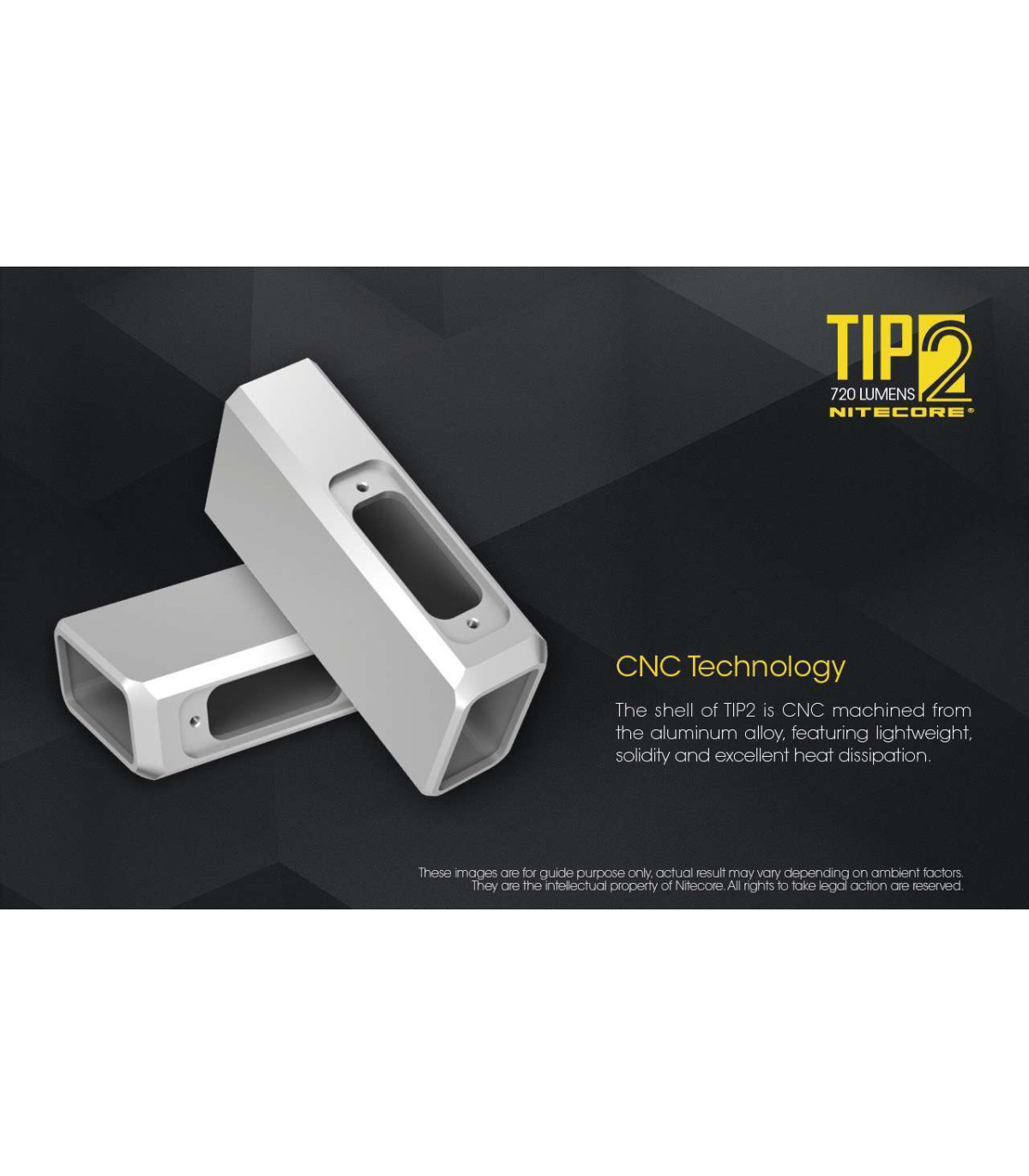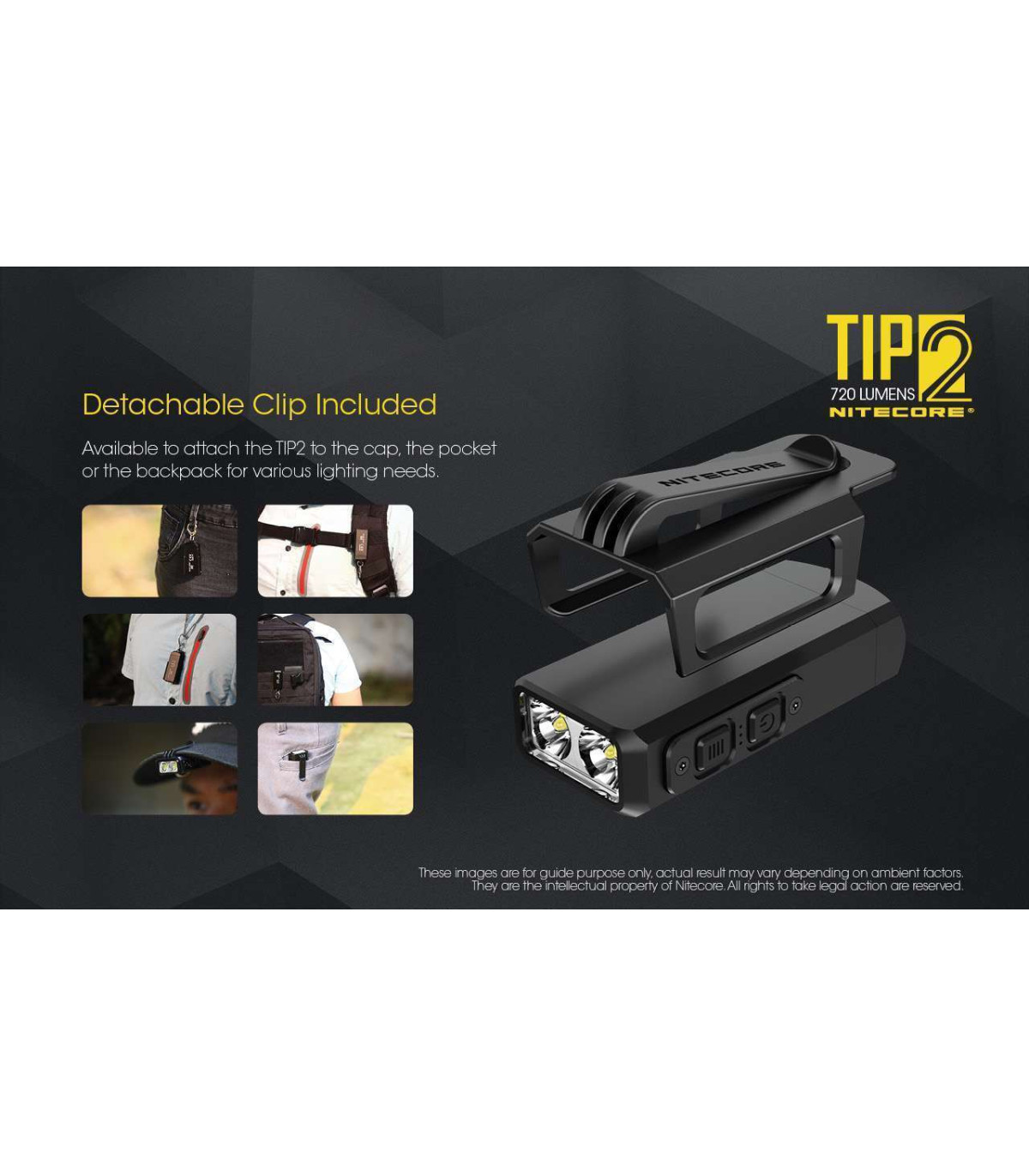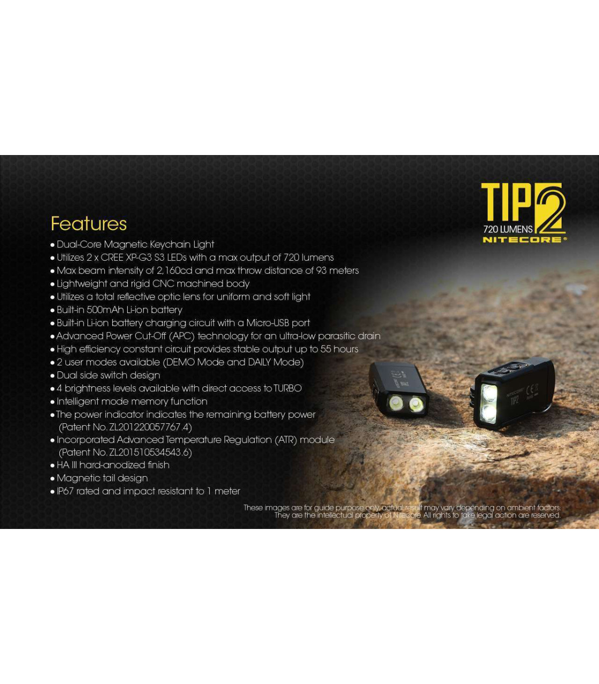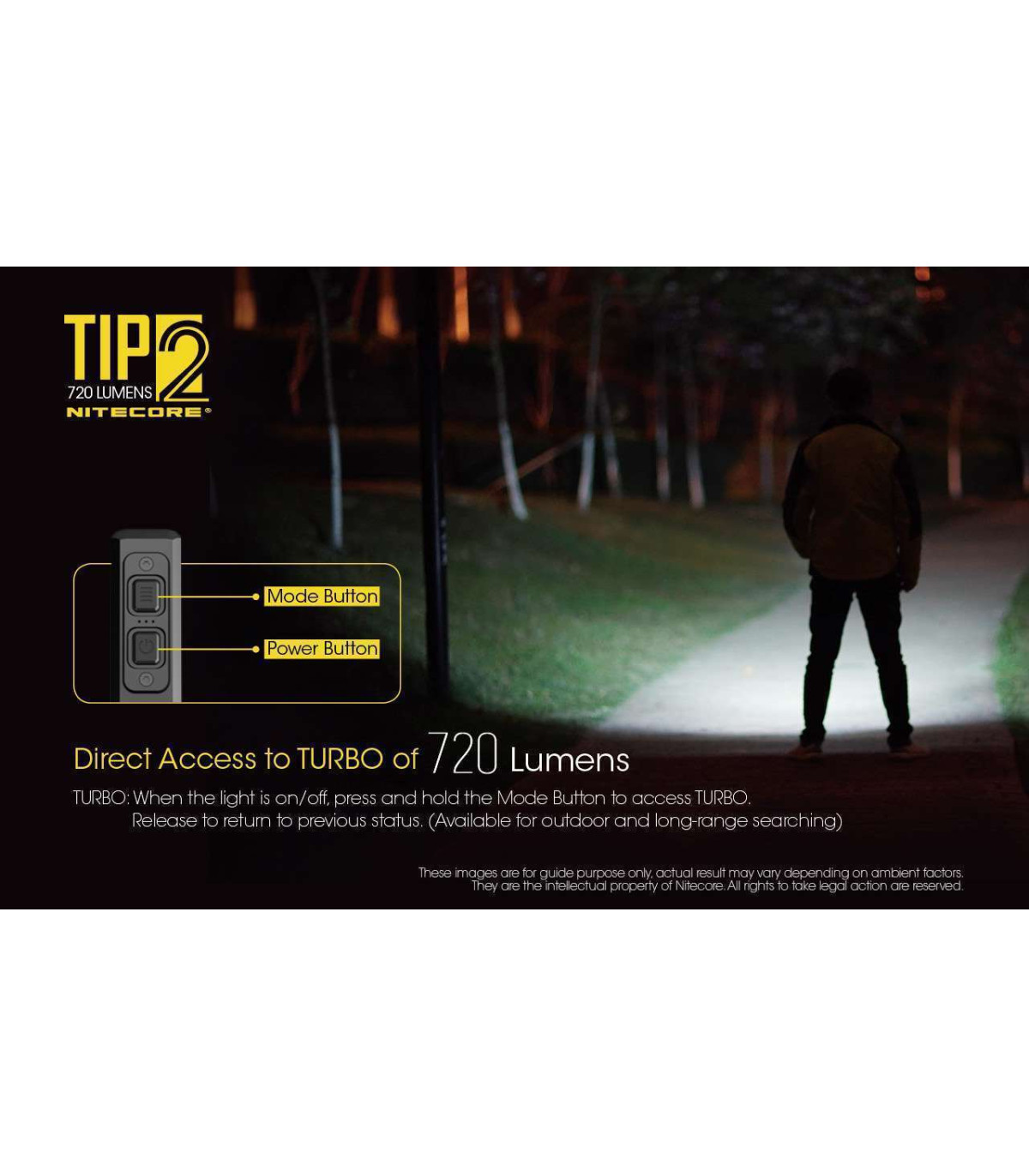 A true innovator never dwells on their own success. After the highly popular NITECORE TIP, NITECORE redefines keychain flashlight once again with the NITECORE TIP2. Doubling the power of the NITECORE TIP, TIP2 reaches up to 720 lumens and over 100 yards in distance. Shorter than a car key and lighter than 1.5 oz, TIP2 remains compact and lightweight. You can carry the light on a keychain, in your pocket or attach it to your backpack or cap bill with its detachable clip. TIP2 is the ultimate everyday carry flashlight you never want to miss. NITECORE TIP2 is easy to operate with a dual switch design. Press and hold the power switch to turn the light on or off and the mode switch to cycle through various brightnesses. TIP2 turns back on at the brightness level you set with the mode switch. Out of the box, TIP2 turns off automatically after 30 seconds to conserve the battery. You can also reconfigure the light so that it stays on until you turn the light off. TIP2 achieves up to 55 hours runtime with its built-in rechargeable battery. Its power indicator displays the remaining battery power. When it is time to recharge, just connect it to any USB power source. TIP2 remains waterproof by concealing the USB port with a magnetic cover.