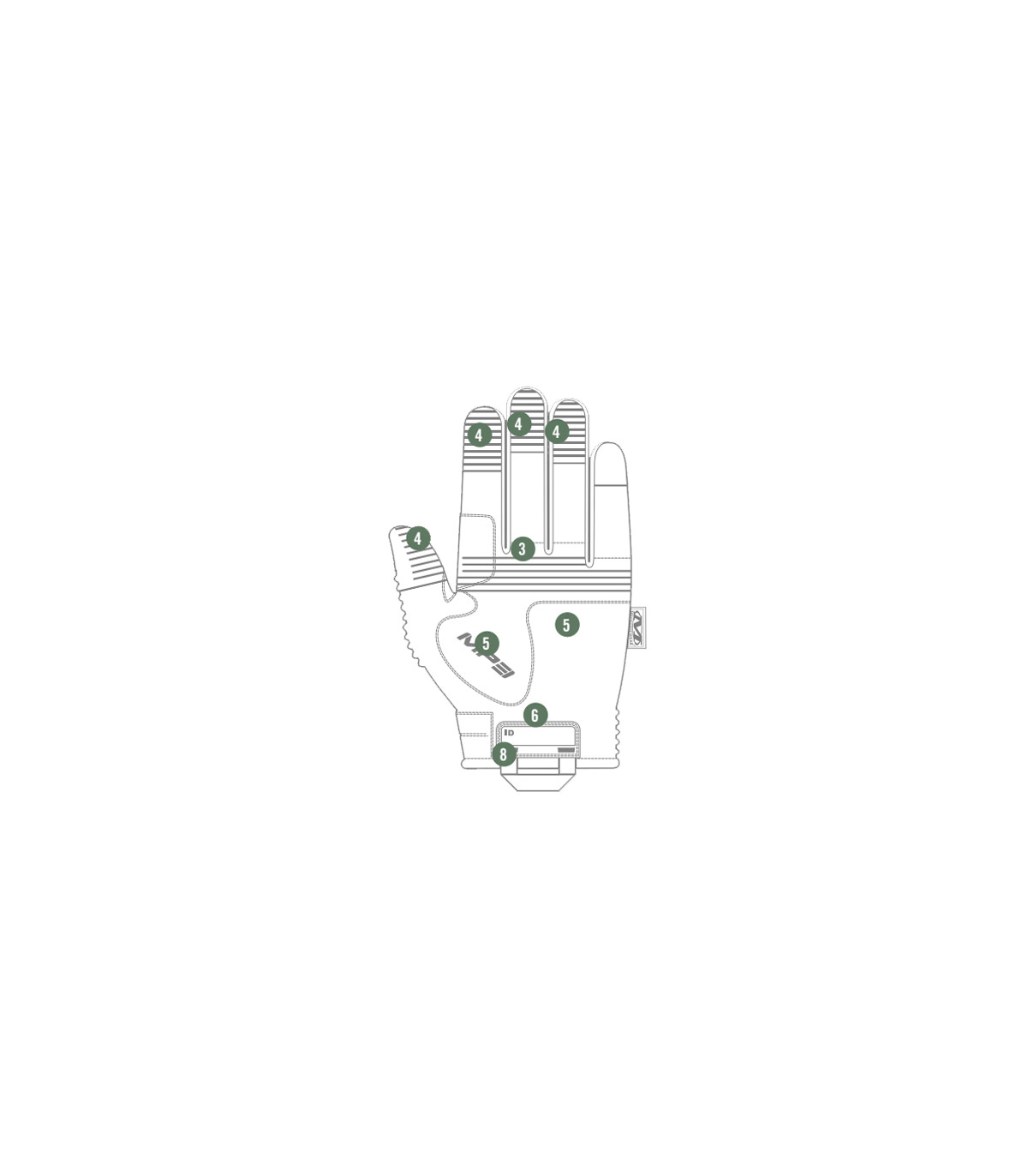 Το εξωτερικό στον αντίχειρα και τα άλλα δάχτυλα προστατεύονται από γέμιση τύπου ακορντεόν από υλικό EVA 3mm, ενώ το χαμηλού προφίλ